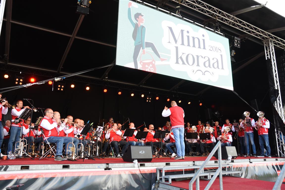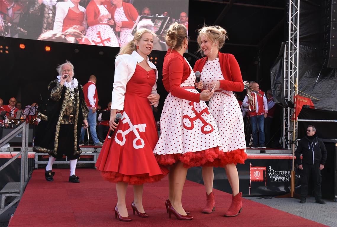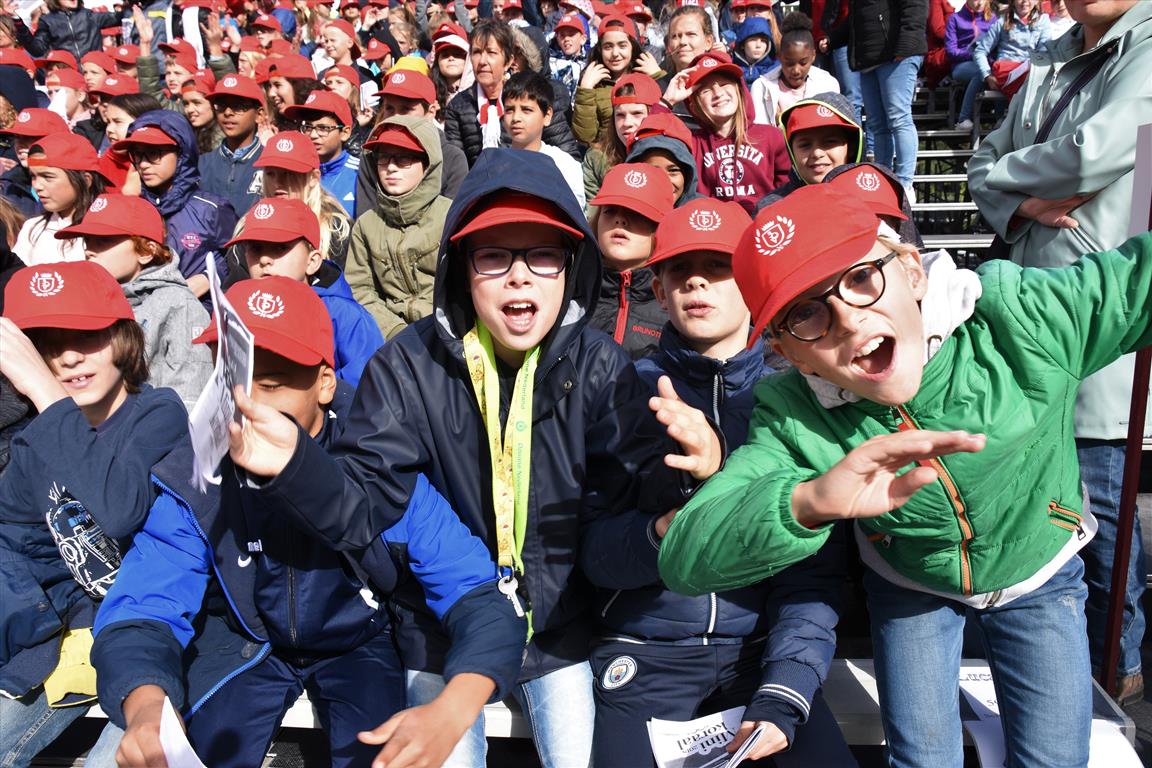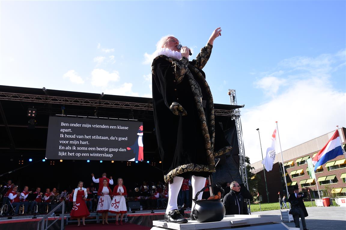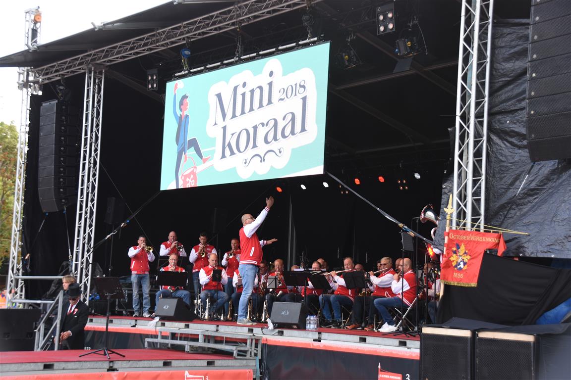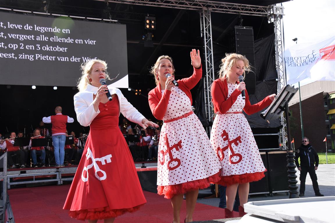 De donkere luchten, de kortstondige buitjes kunnen de pret niet drukken. De Minikoraal is niet meer weg te denken uit de 3 Oktoberviering. Wat vijfentwintig jaar geleden begon met een handjevol Leidse scholen is uitgegroeid tot een fenomenaal evenement waaraan scholen uit alle buurgemeenten meedoen. Begonnen in het groen van het Van der Werfpark, verhuisde de Minikoraal eerst naar de nabijgelegen Garenmarkt. Nu dat een bouwplaats is geworden tot medio 2020 heeft de Minikoraal voorlopig onderdak gevonden op het Trigonterrein aan de Zoeterwoudsesingel, waar helaas geen plaats meer is voor toeschouwers. Maar Sleutelstad zendt elk jaar live uit via Facebook en website, die je hier nog terug kunt kijken.