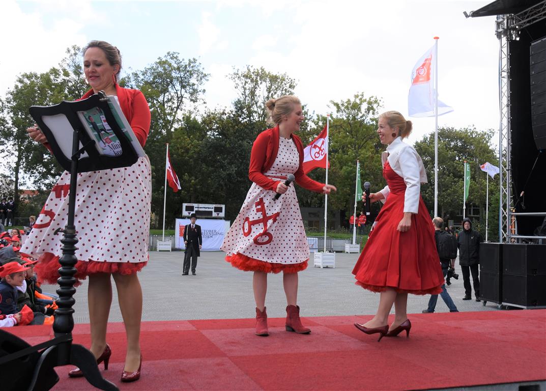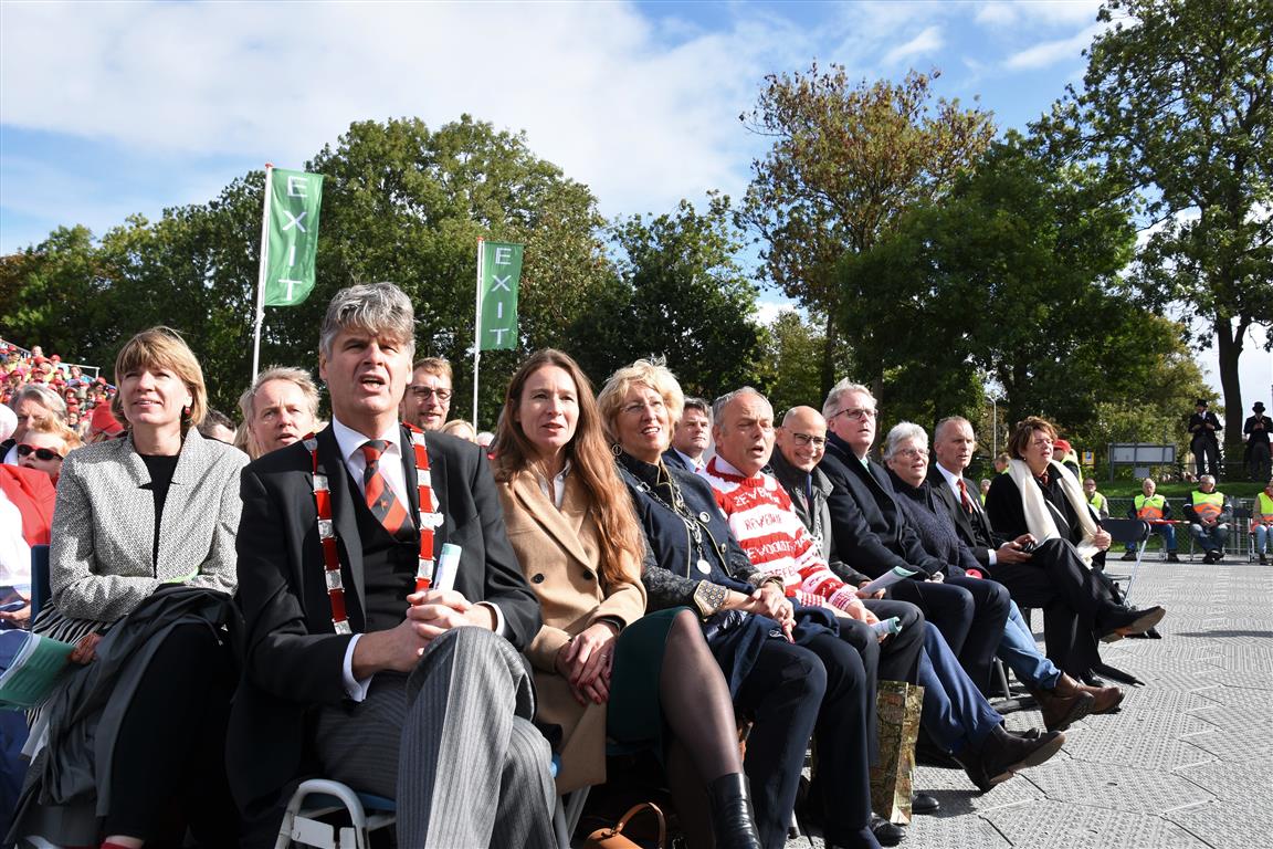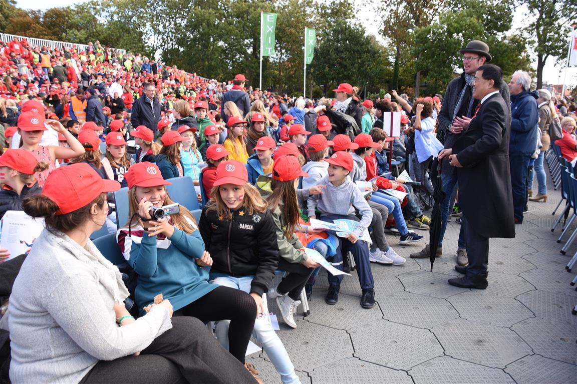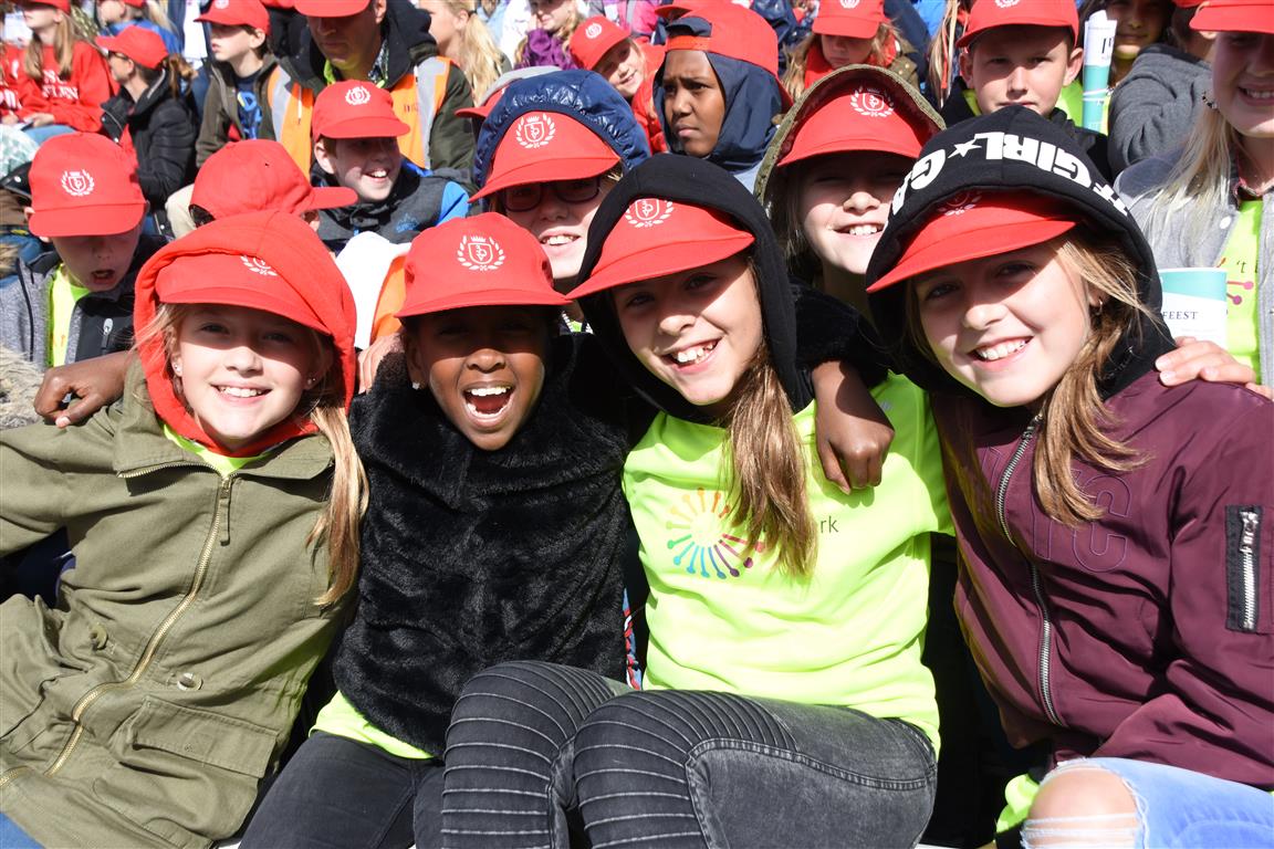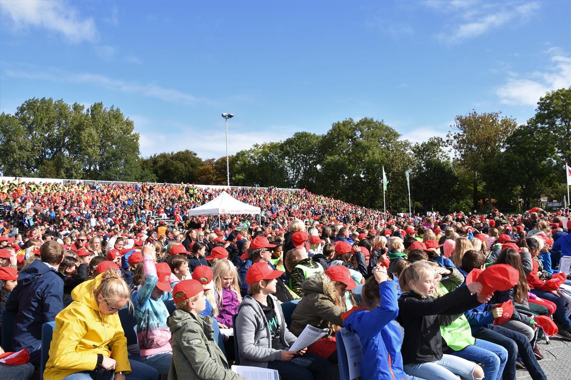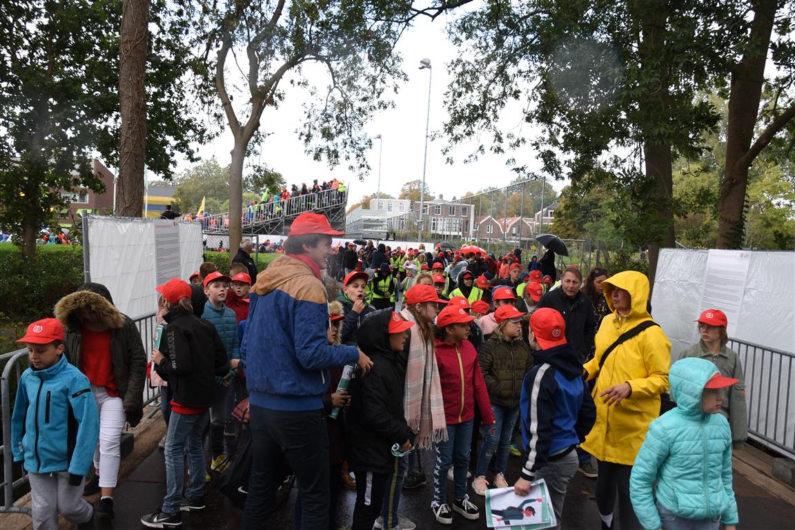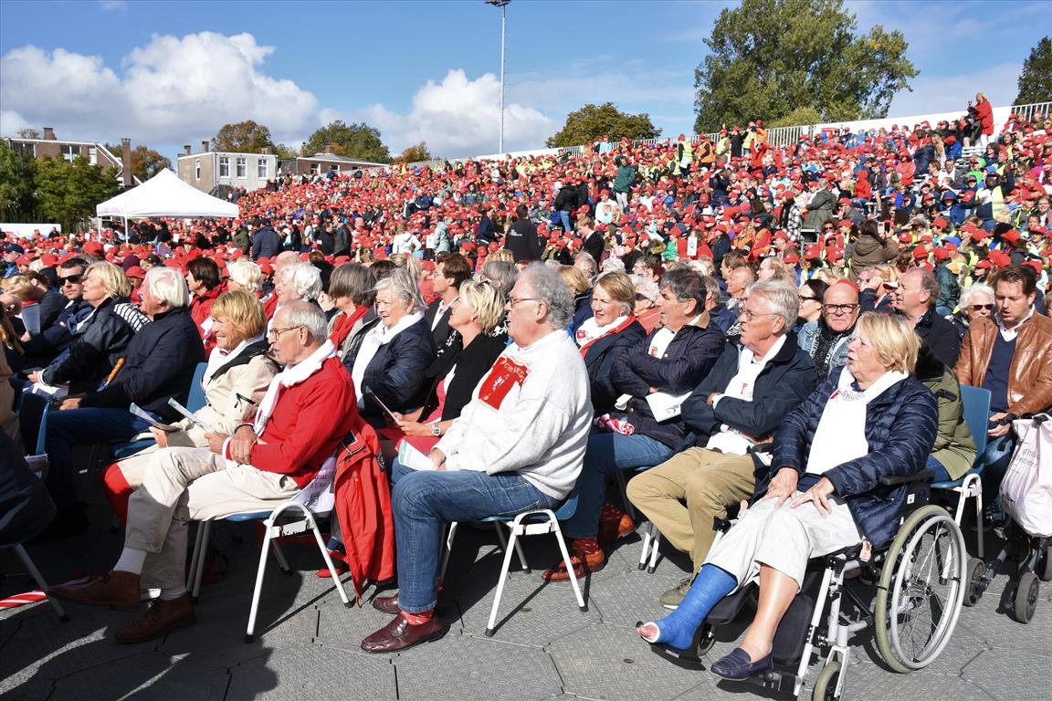 De donkere luchten, de kortstondige buitjes kunnen de pret niet drukken. De Minikoraal is niet meer weg te denken uit de 3 Oktoberviering. Wat vijfentwintig jaar geleden begon met een handjevol Leidse scholen is uitgegroeid tot een fenomenaal evenement waaraan scholen uit alle buurgemeenten meedoen. Begonnen in het groen van het Van der Werfpark, verhuisde de Minikoraal eerst naar de nabijgelegen Garenmarkt. Nu dat een bouwplaats is geworden tot medio 2020 heeft de Minikoraal voorlopig onderdak gevonden op het Trigonterrein aan de Zoeterwoudsesingel, waar helaas geen plaats meer is voor toeschouwers. Maar Sleutelstad zendt elk jaar live uit via Facebook en website, die je hier nog terug kunt kijken.