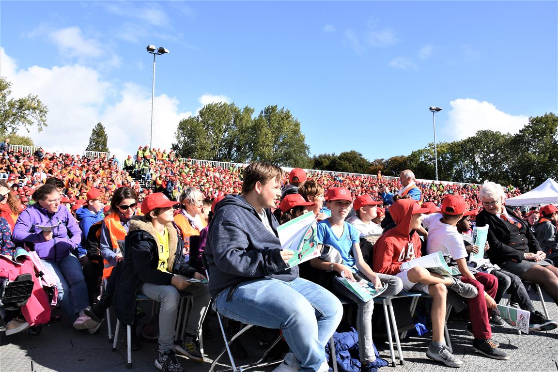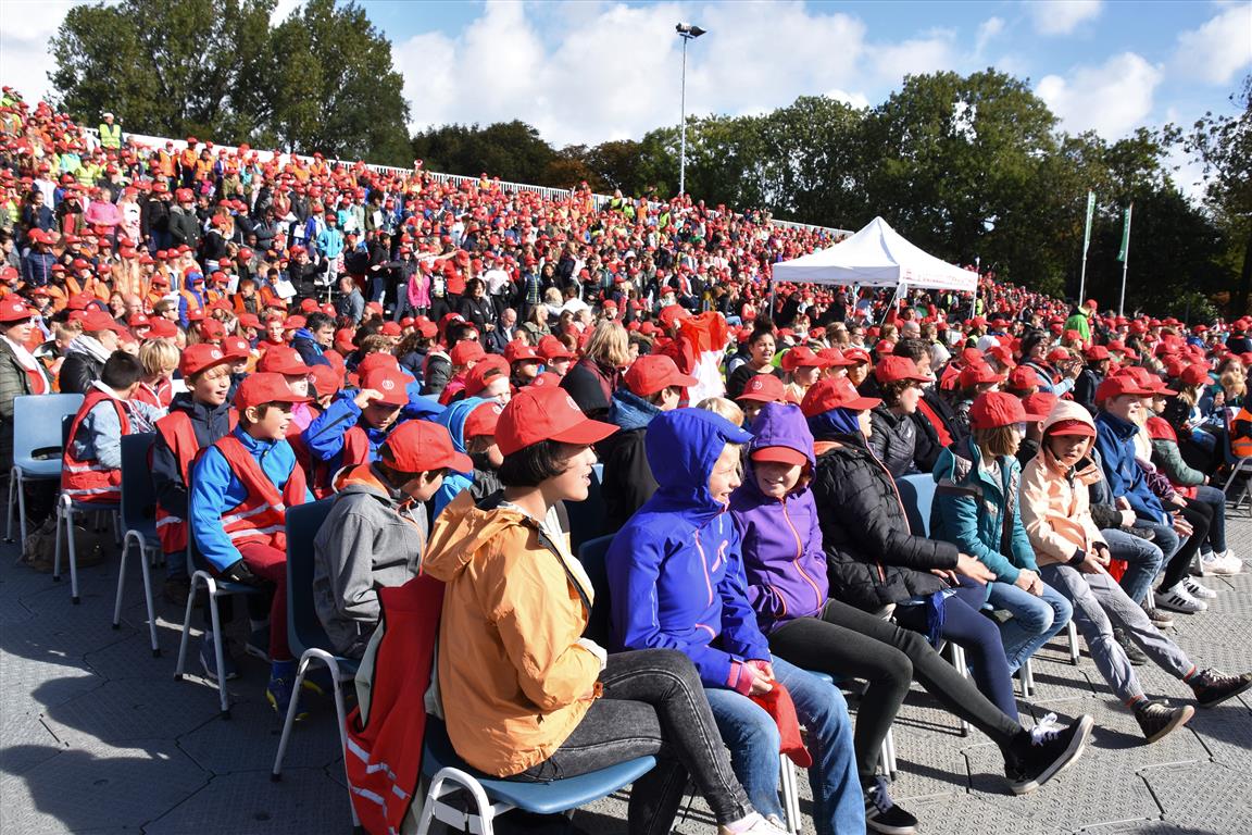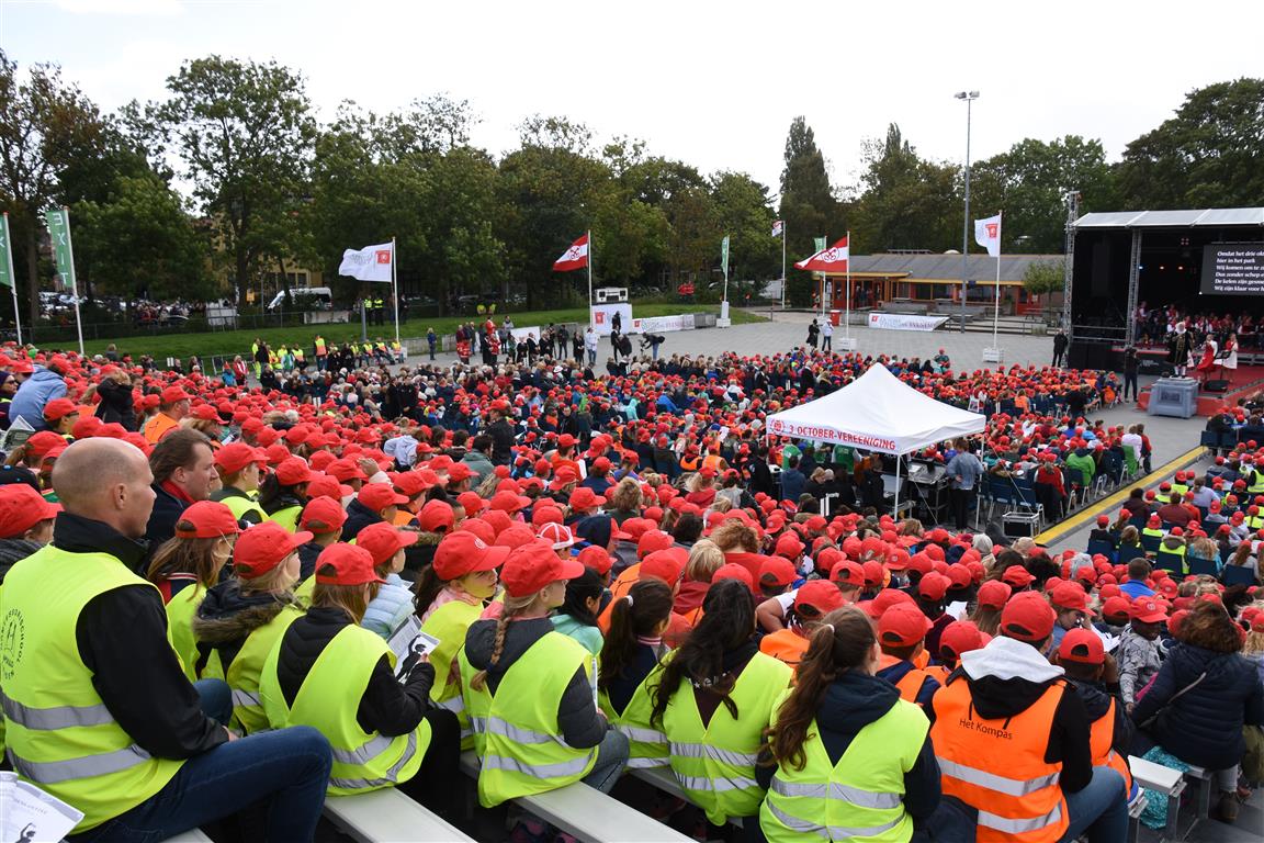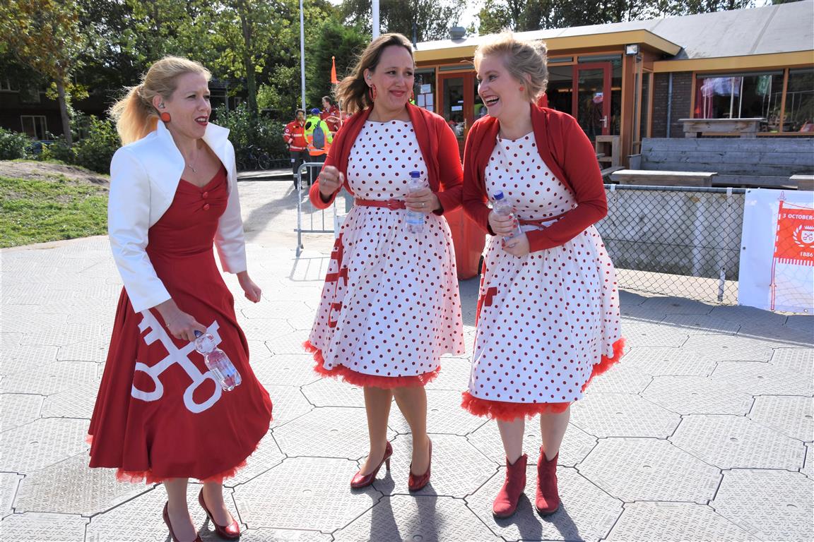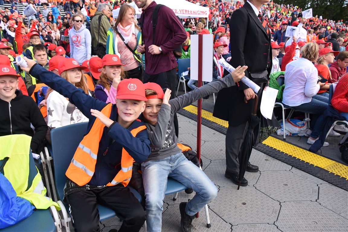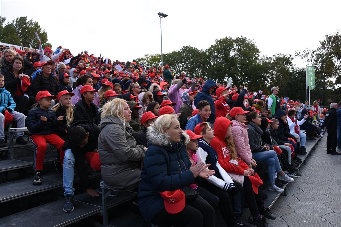 De donkere luchten, de kortstondige buitjes kunnen de pret niet drukken. De Minikoraal is niet meer weg te denken uit de 3 Oktoberviering. Wat vijfentwintig jaar geleden begon met een handjevol Leidse scholen is uitgegroeid tot een fenomenaal evenement waaraan scholen uit alle buurgemeenten meedoen. Begonnen in het groen van het Van der Werfpark, verhuisde de Minikoraal eerst naar de nabijgelegen Garenmarkt. Nu dat een bouwplaats is geworden tot medio 2020 heeft de Minikoraal voorlopig onderdak gevonden op het Trigonterrein aan de Zoeterwoudsesingel, waar helaas geen plaats meer is voor toeschouwers. Maar Sleutelstad zendt elk jaar live uit via Facebook en website, die je hier nog terug kunt kijken.