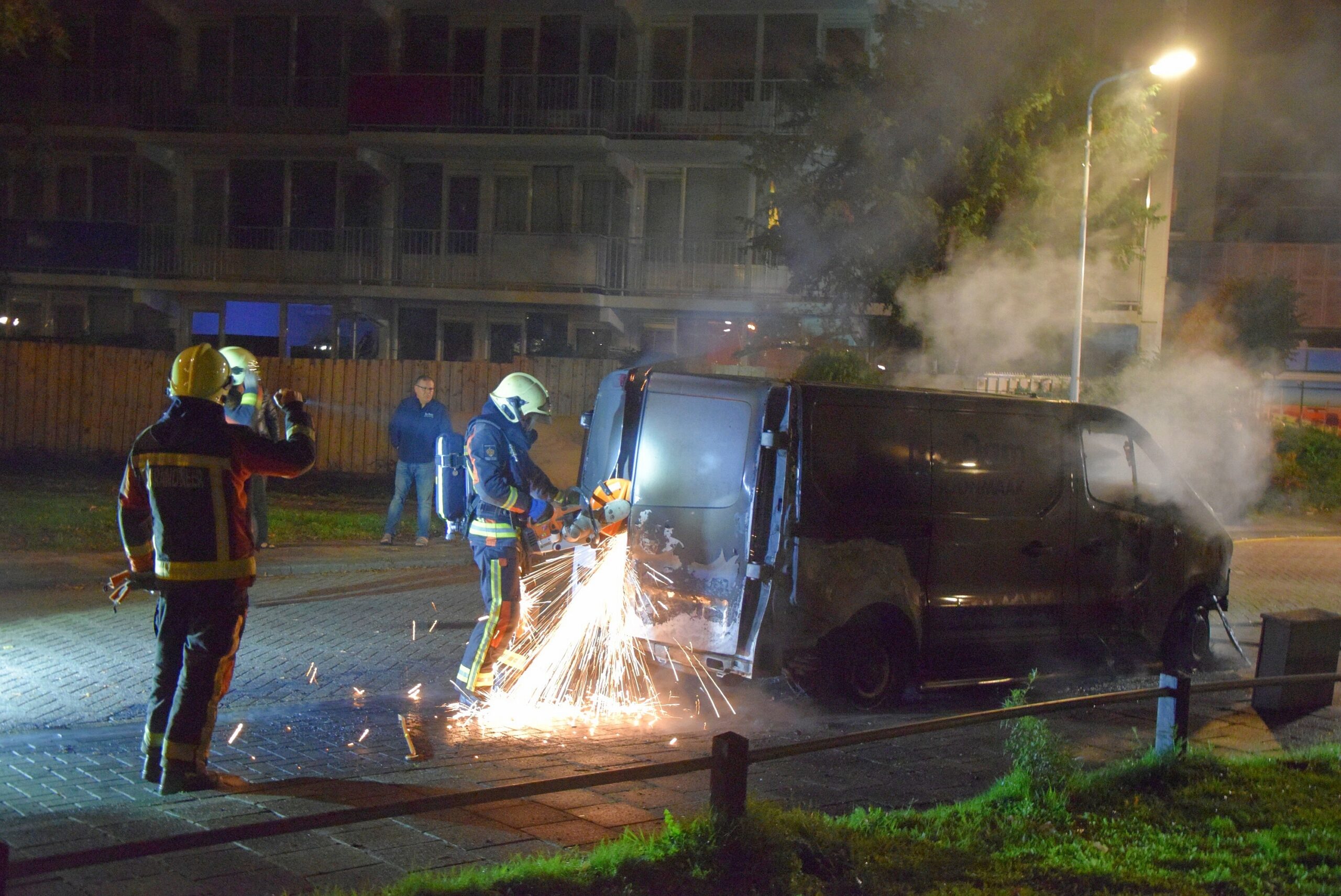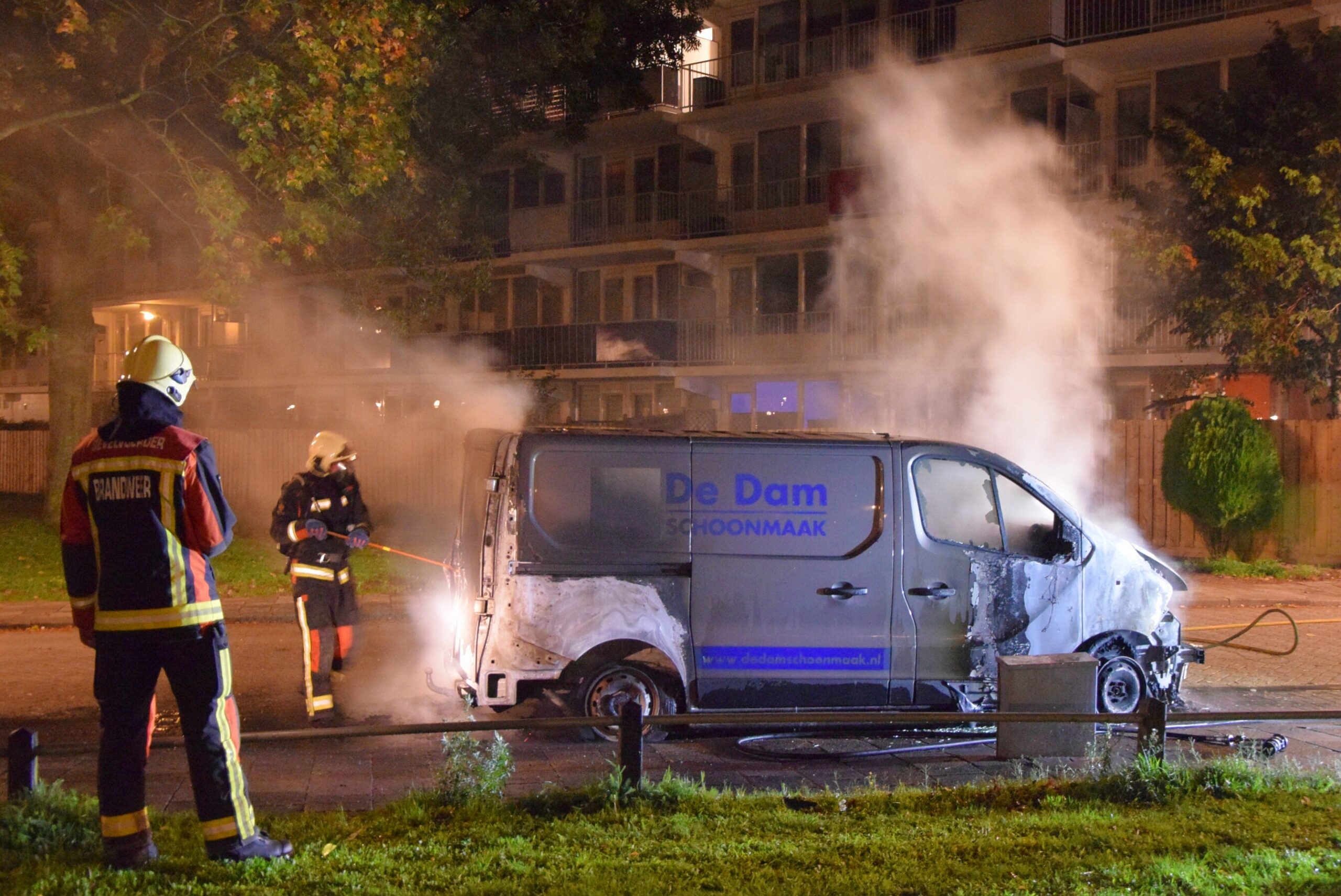 De brandweer begon eenmaal ter plaatse meteen met blussen, maar kon niet voorkomen dat de bestelbus volledig uitbrandde. De politie doet onderzoek naar de brandstichting.