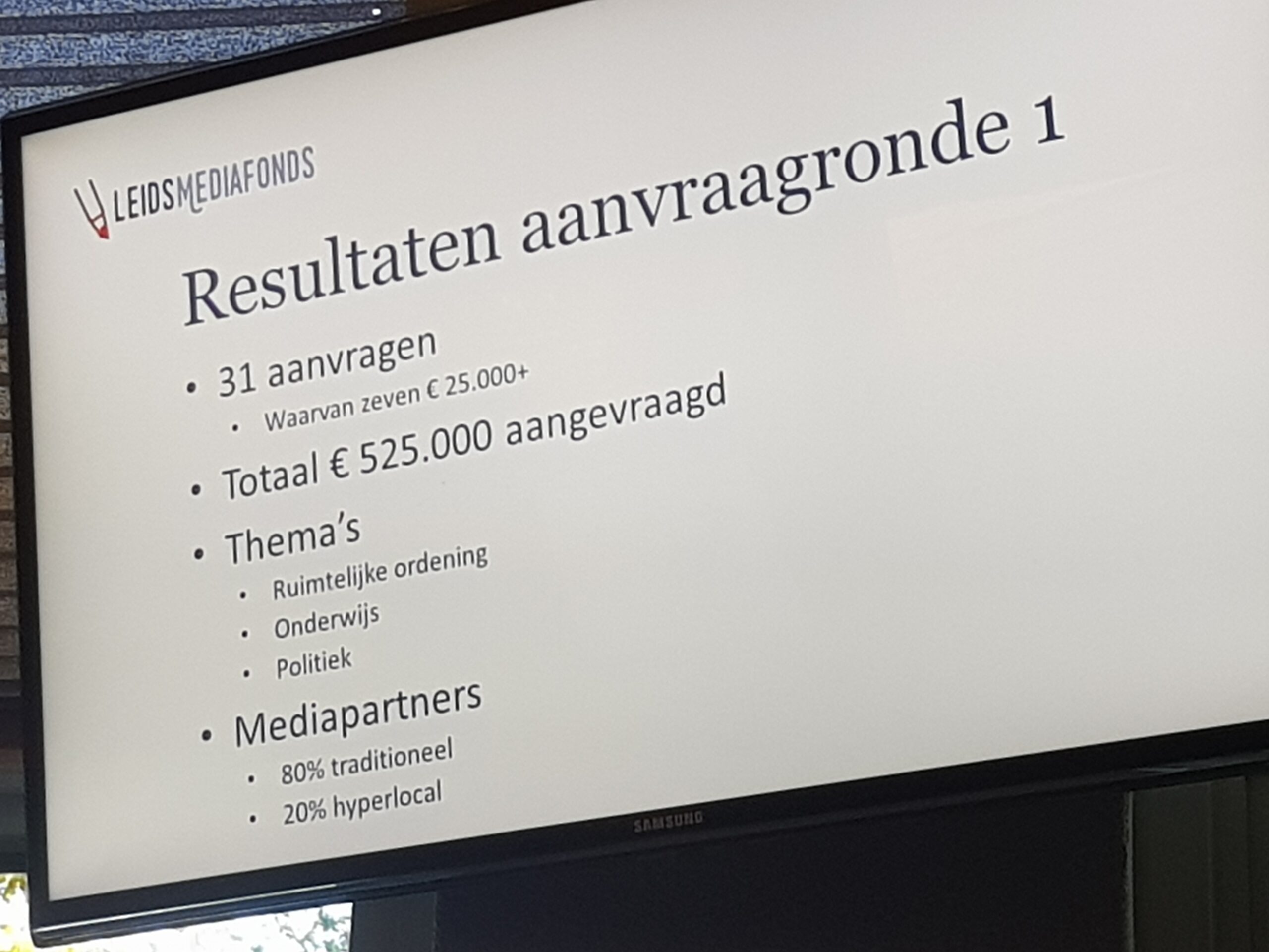Bij de eerste aanvraagronde van het Leids Mediafonds is voor meer dan een half miljoen euro aangevraagd voor de ondersteuning van journalistieke producties. Dat bleek gisteren tijdens een lunchbijeenkomst van Provinciale Staten van de provincie Zuid-Holland waar de Statencommissie Bestuur en Middelen in gesprek ging met regionale media. Het provinciebestuur laat onderzoeken of ook of provinciaal niveau een fonds ter ondersteuning van de media nodig is.