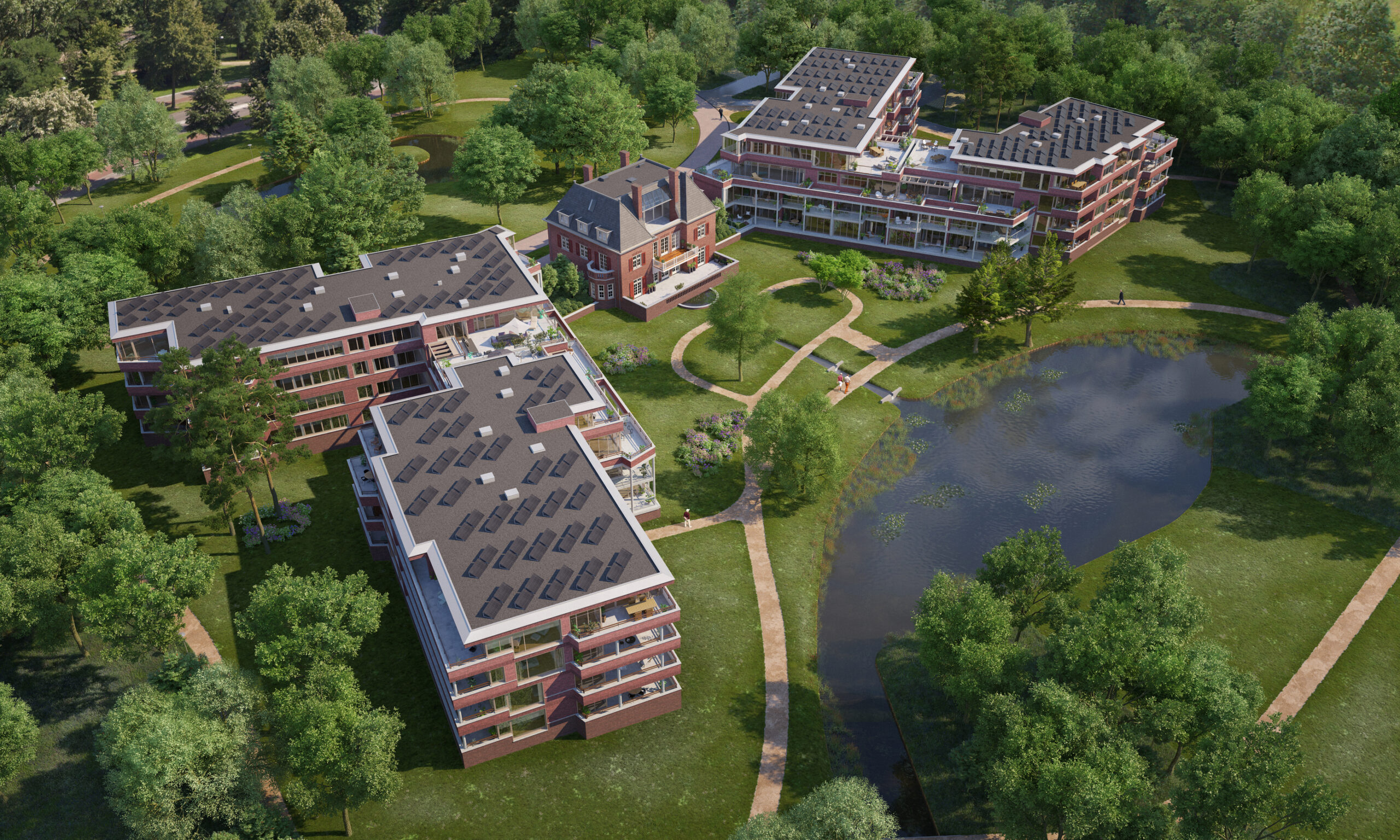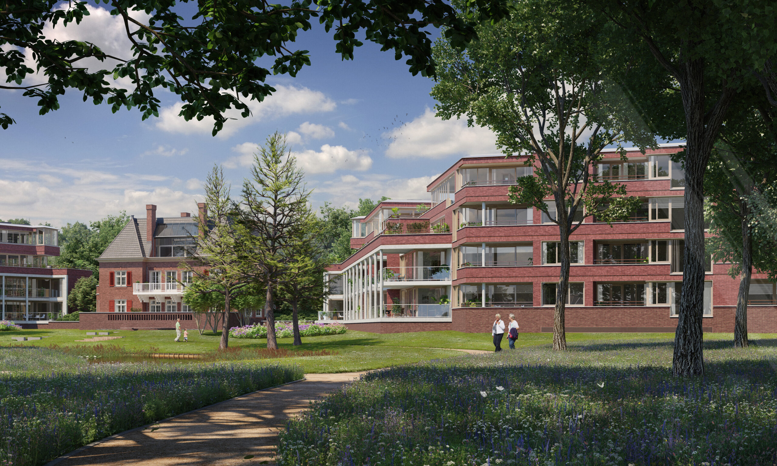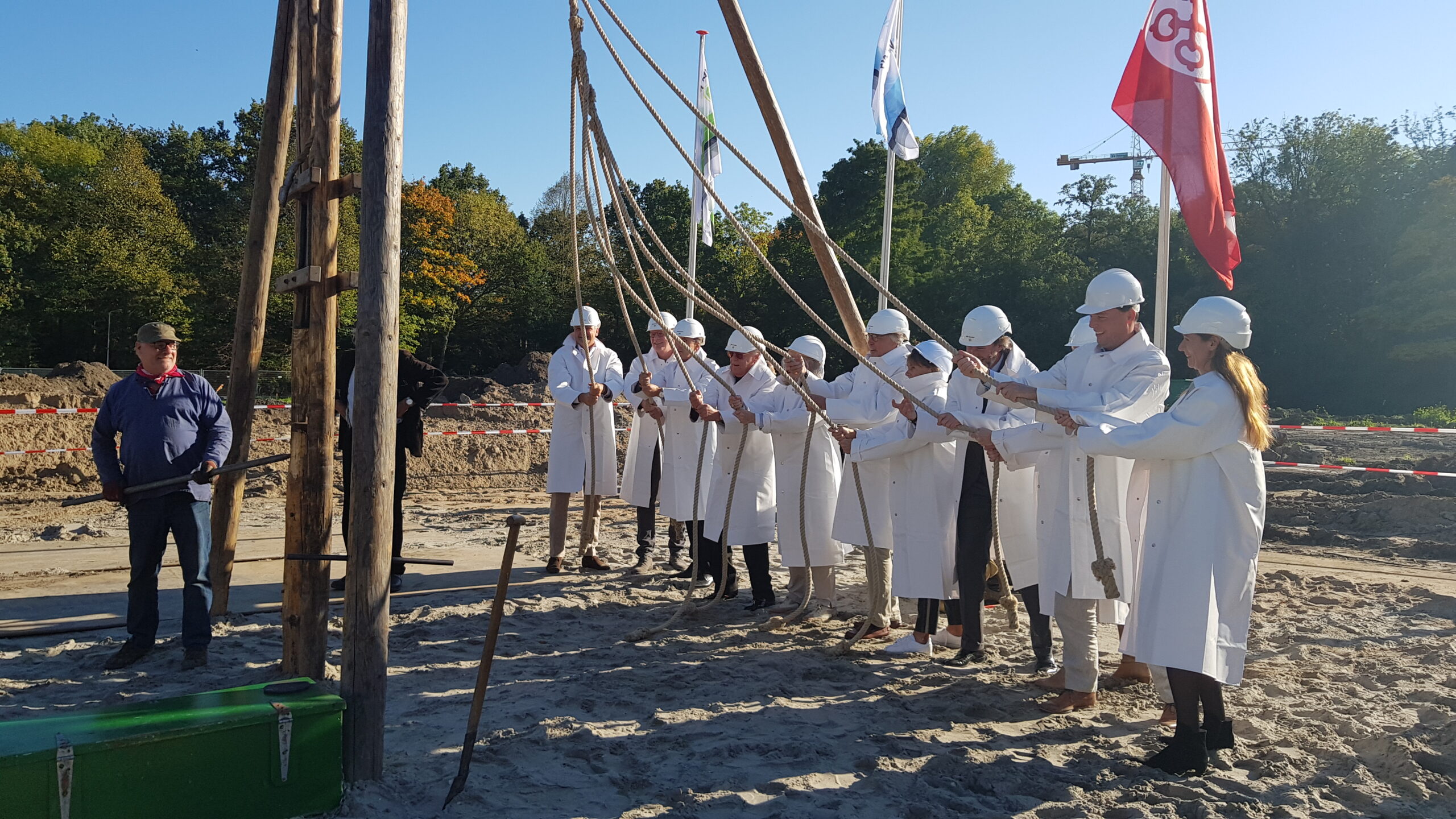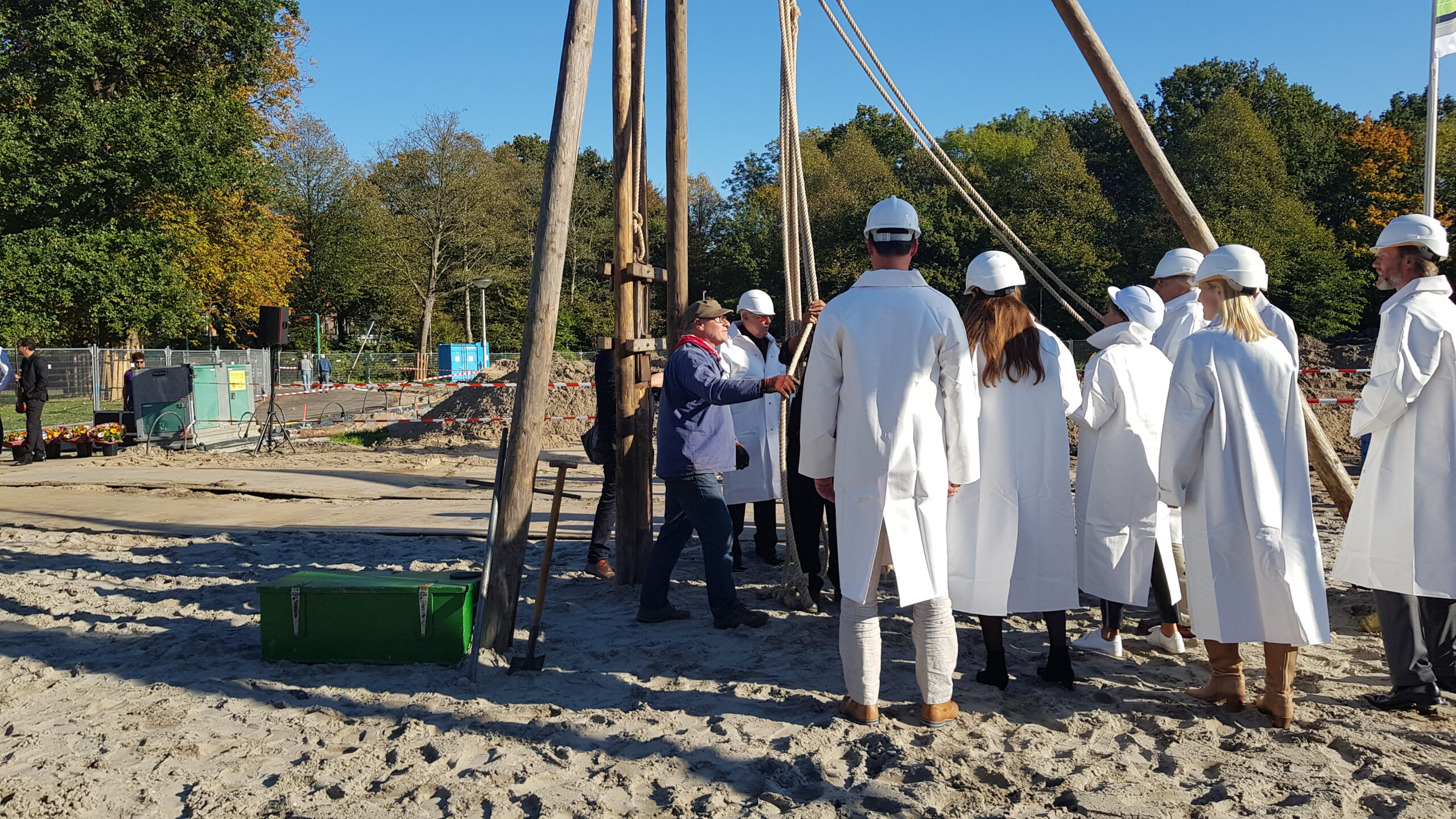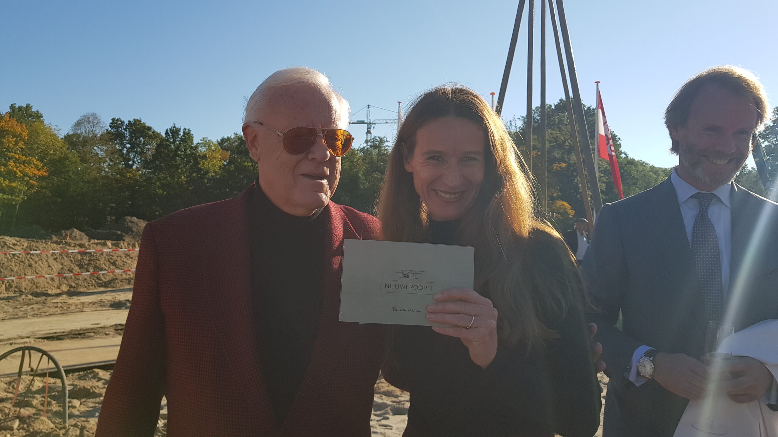 In de stralende zon stonden tientallen genodigden woensdagmiddag opeengepakt in een grote tent op het terrein van de voormalige zusterflat Nieuweroord aan de Rijnsburgerweg. Half oktober is dat normaal gesproken prima, maar nu werden de praatjes kort gehouden, om zo snel mogelijk buiten de symbolische eerste paal te slaan voor de bouw van 87 appartementen in het groen met in het midden het herbouwde landhuis Nieuweroord.