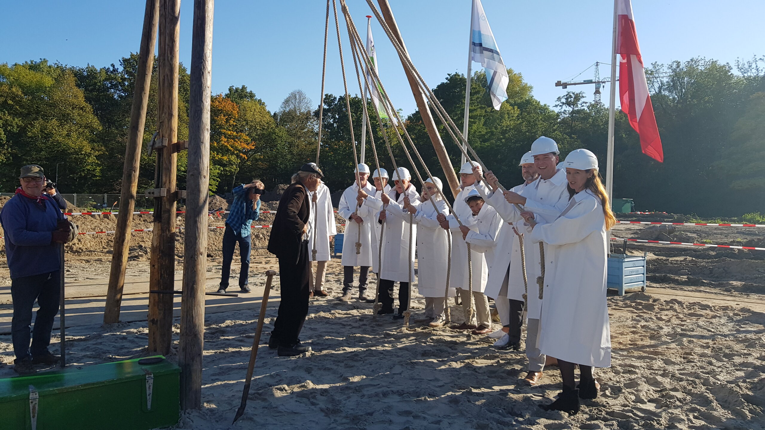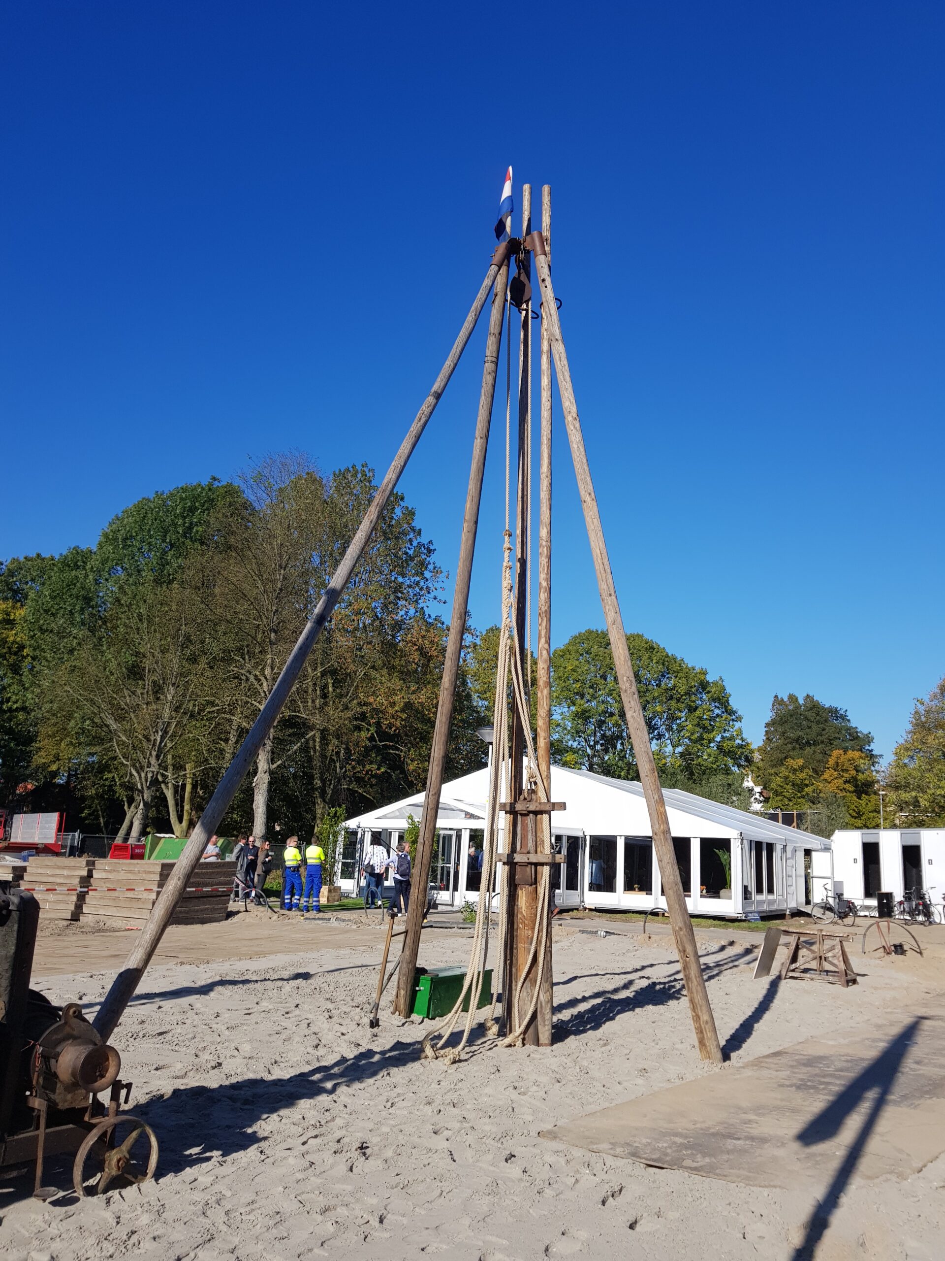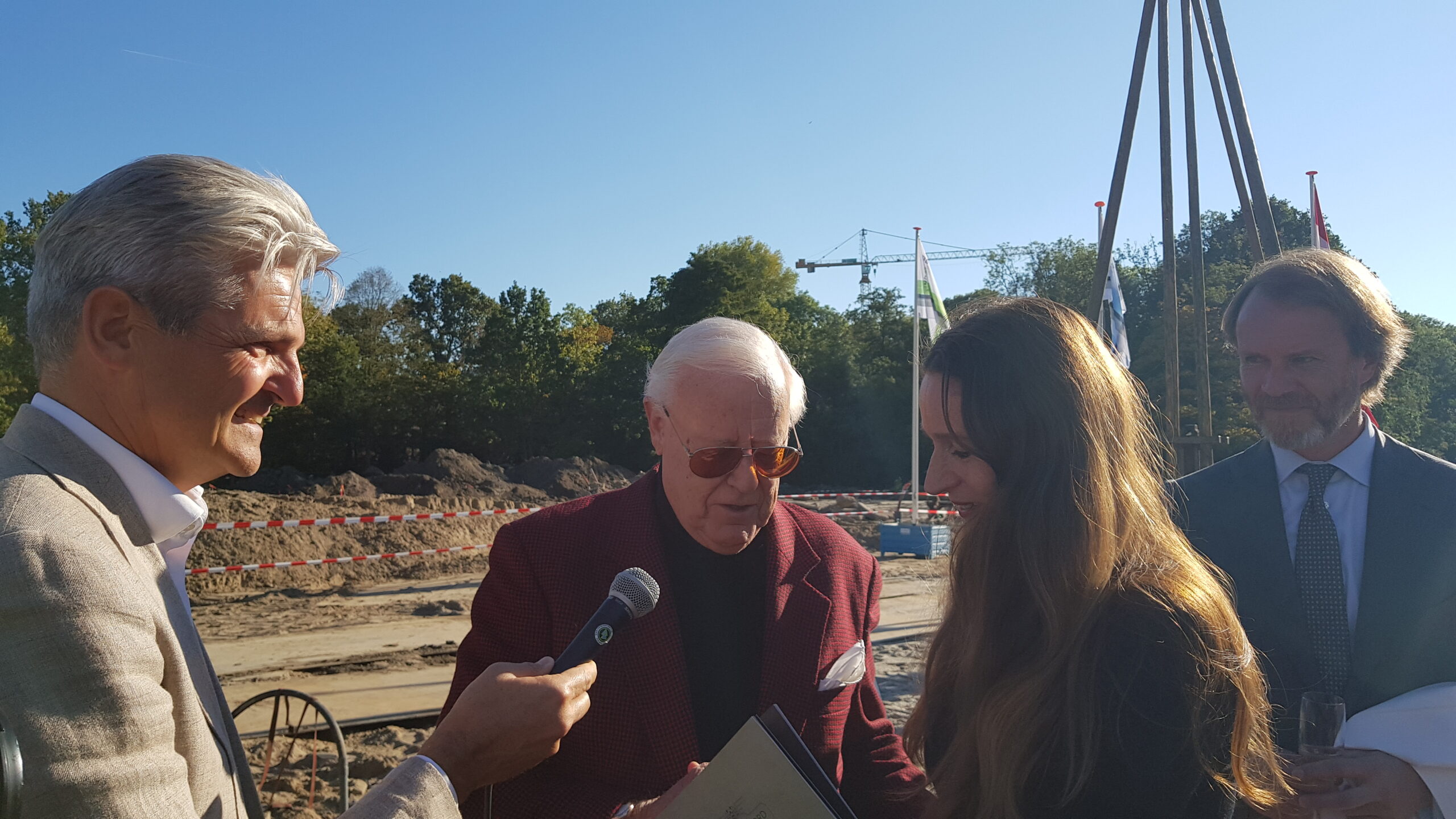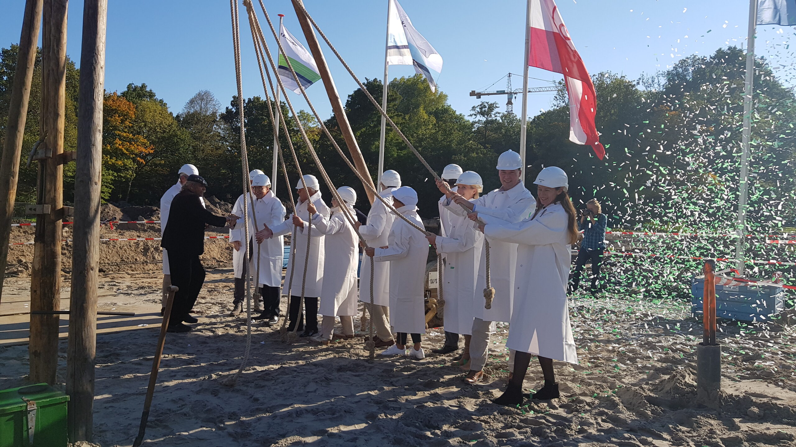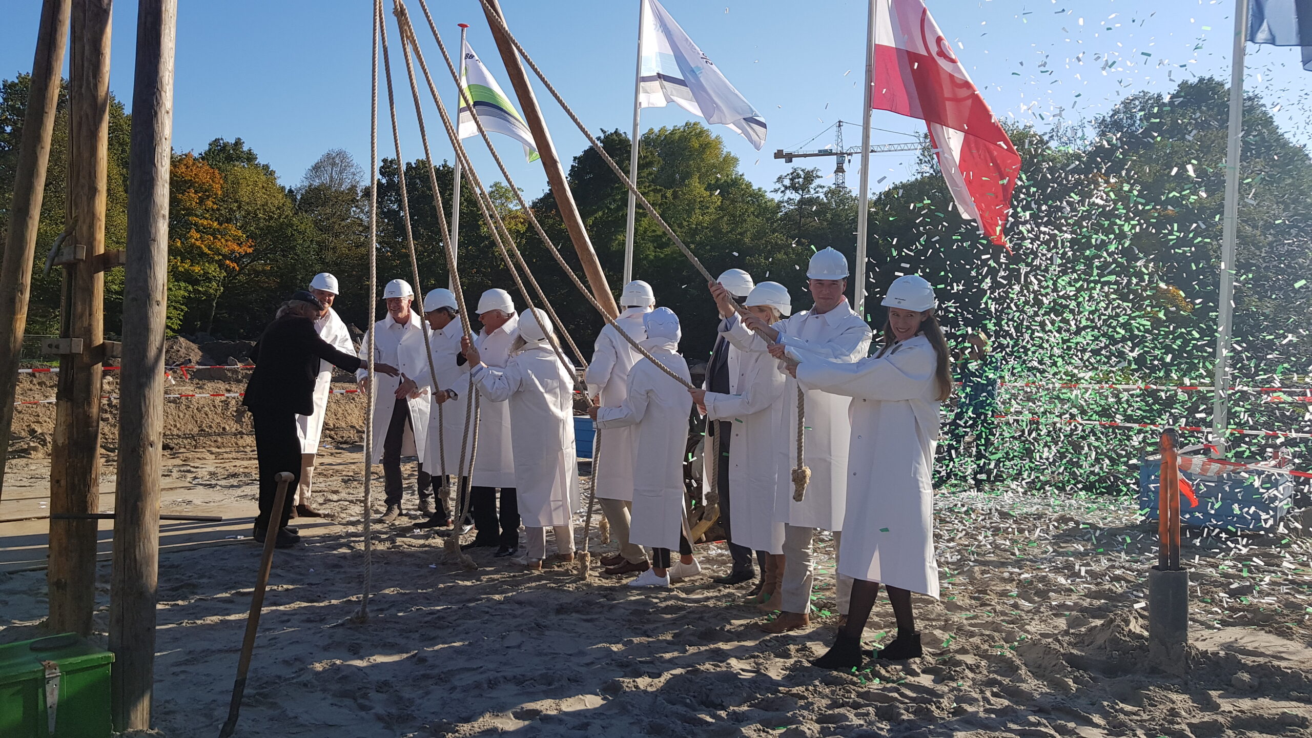 In de stralende zon stonden tientallen genodigden woensdagmiddag opeengepakt in een grote tent op het terrein van de voormalige zusterflat Nieuweroord aan de Rijnsburgerweg. Half oktober is dat normaal gesproken prima, maar nu werden de praatjes kort gehouden, om zo snel mogelijk buiten de symbolische eerste paal te slaan voor de bouw van 87 appartementen in het groen met in het midden het herbouwde landhuis Nieuweroord.
