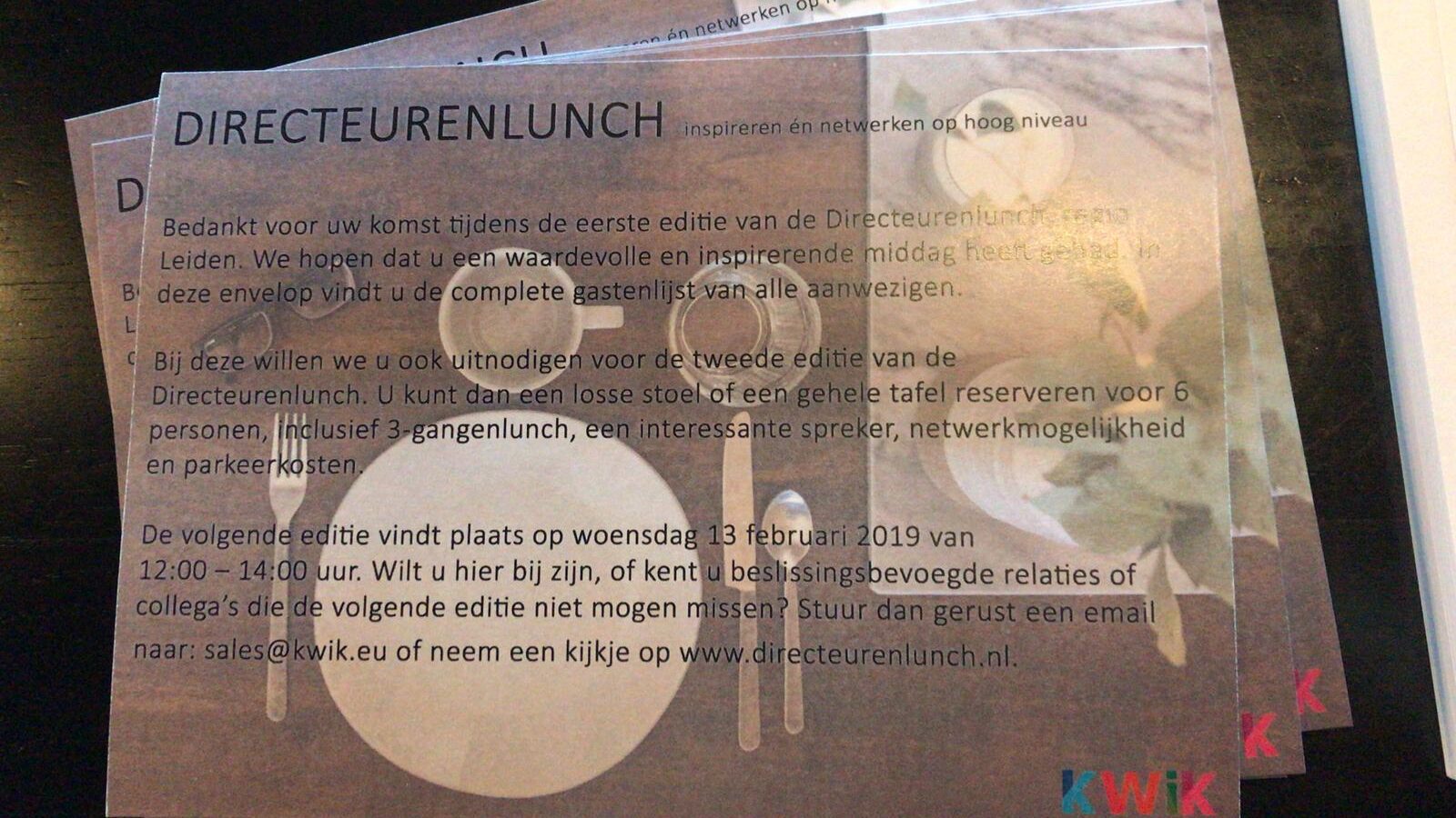 De Directeurenlunch staat voor ongeveer vier keer per jaar in de planning. De volgende editie is op woensdag 13 februari, wederom tussen 12.00 en 14.00 uur in Restaurant Twelve aan de Bartgelaan 180 in Leiden. Aanmelden voor een tafel van zes personen of voor een losse stoel kan via directeurenlunch.nl of sales.kwik.eu.