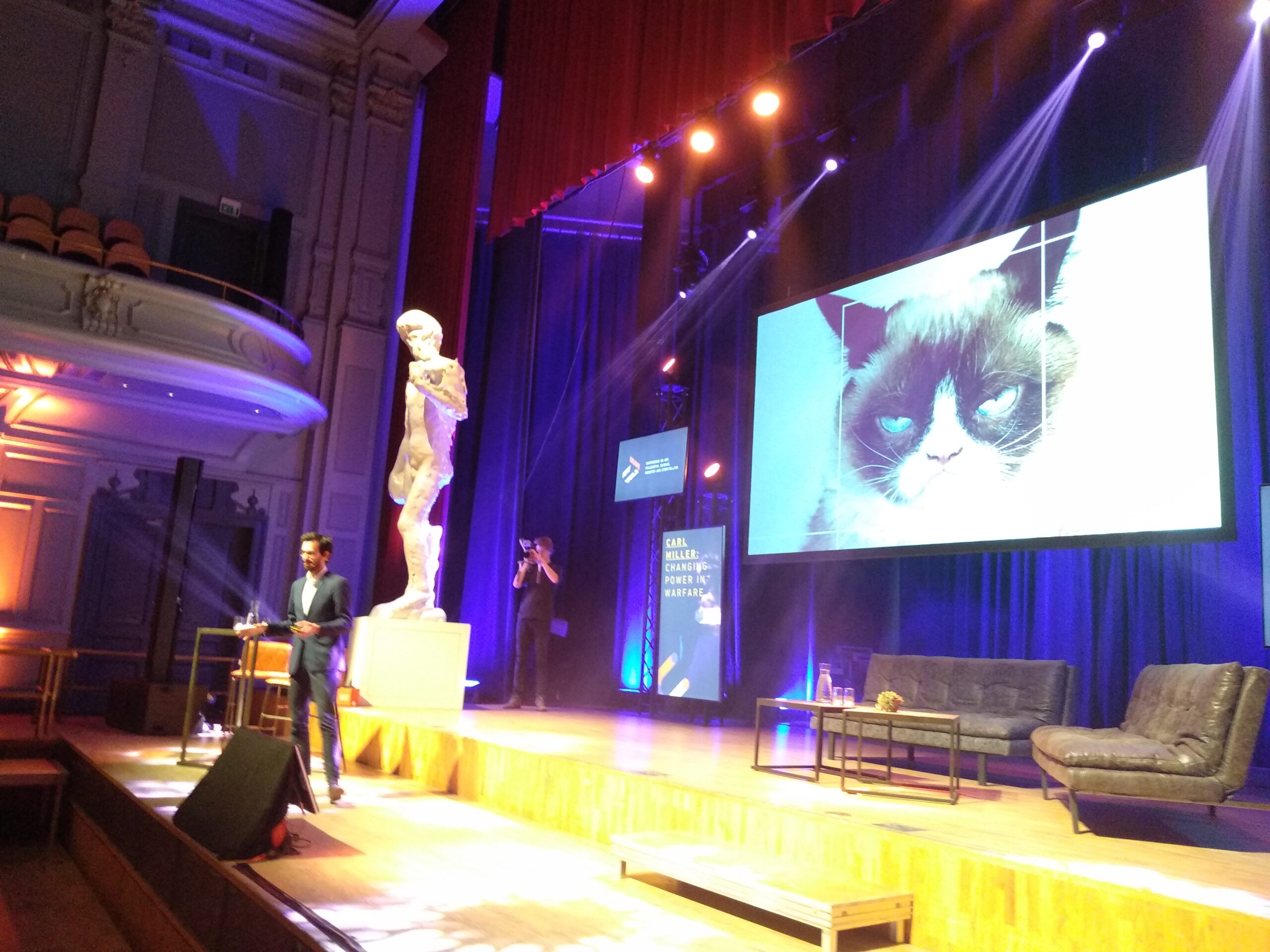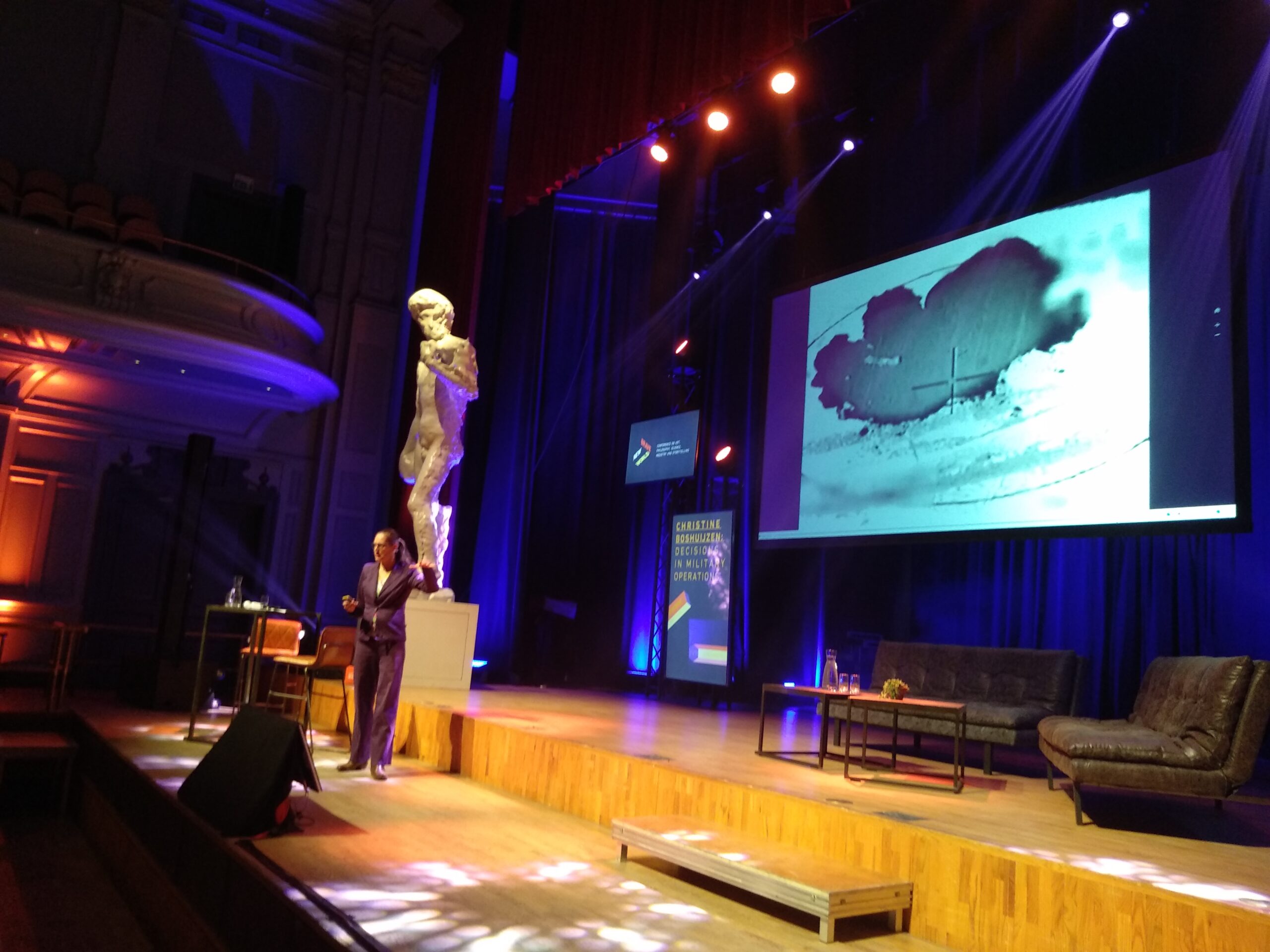 Donderdag stonden de eerste twee van in totaal vier thema’s centraal: oorlog(svoering) en vertrouwen in technologie. Voor wie een wonderland aan voorbeelden van high tech oorlogsvoering verwachtte, was de ochtend teleurstellend. ‘Uiteraard’ kwam het filmpje over de autonome killerdrone voorbij. Maar de meeste tijd werd besteed aan wat die nieuwe vormen van oorlog voeren eigenlijk zijn. En dat was interessanter dan zogenaamd zelfdenkende drones.