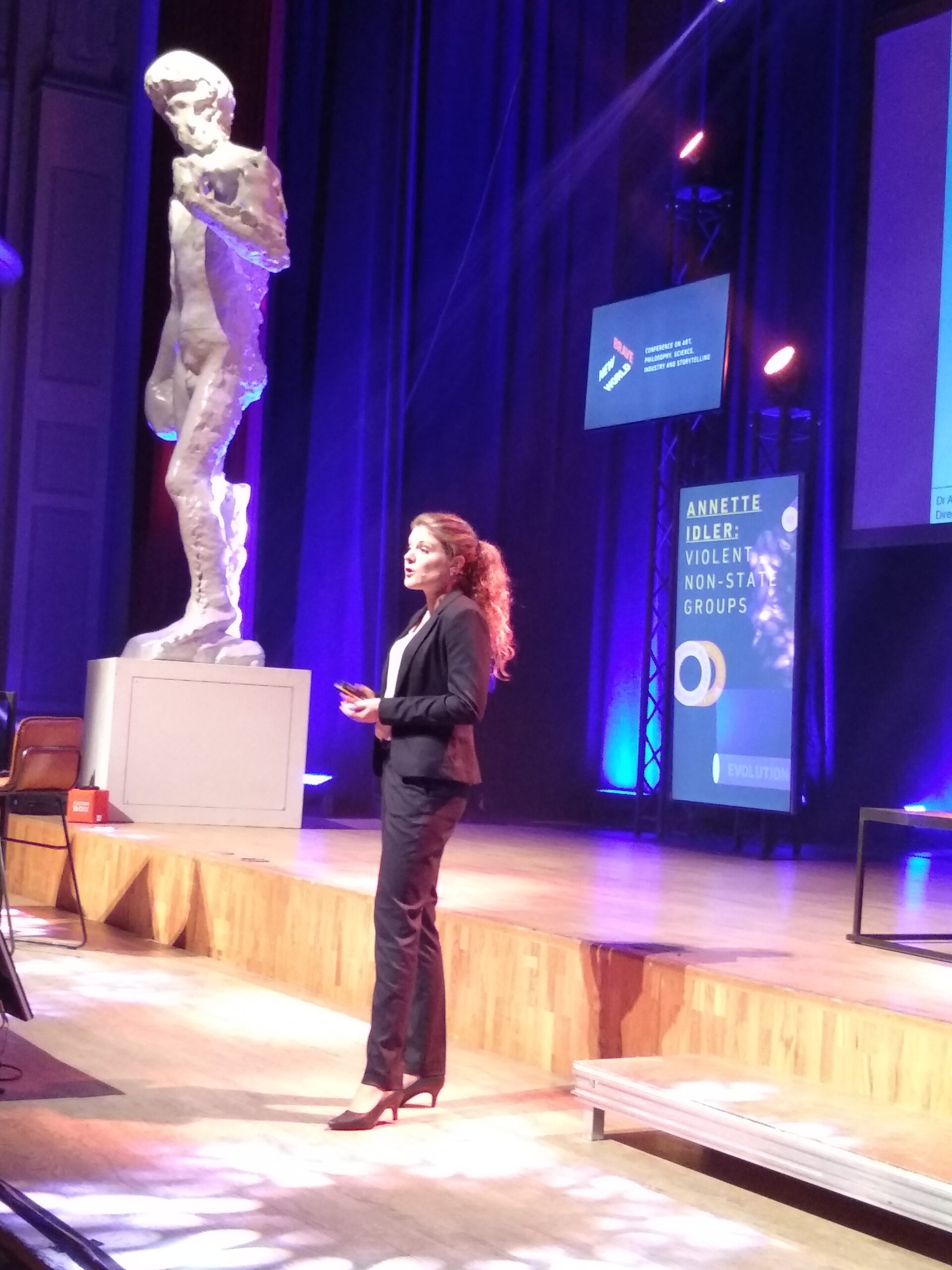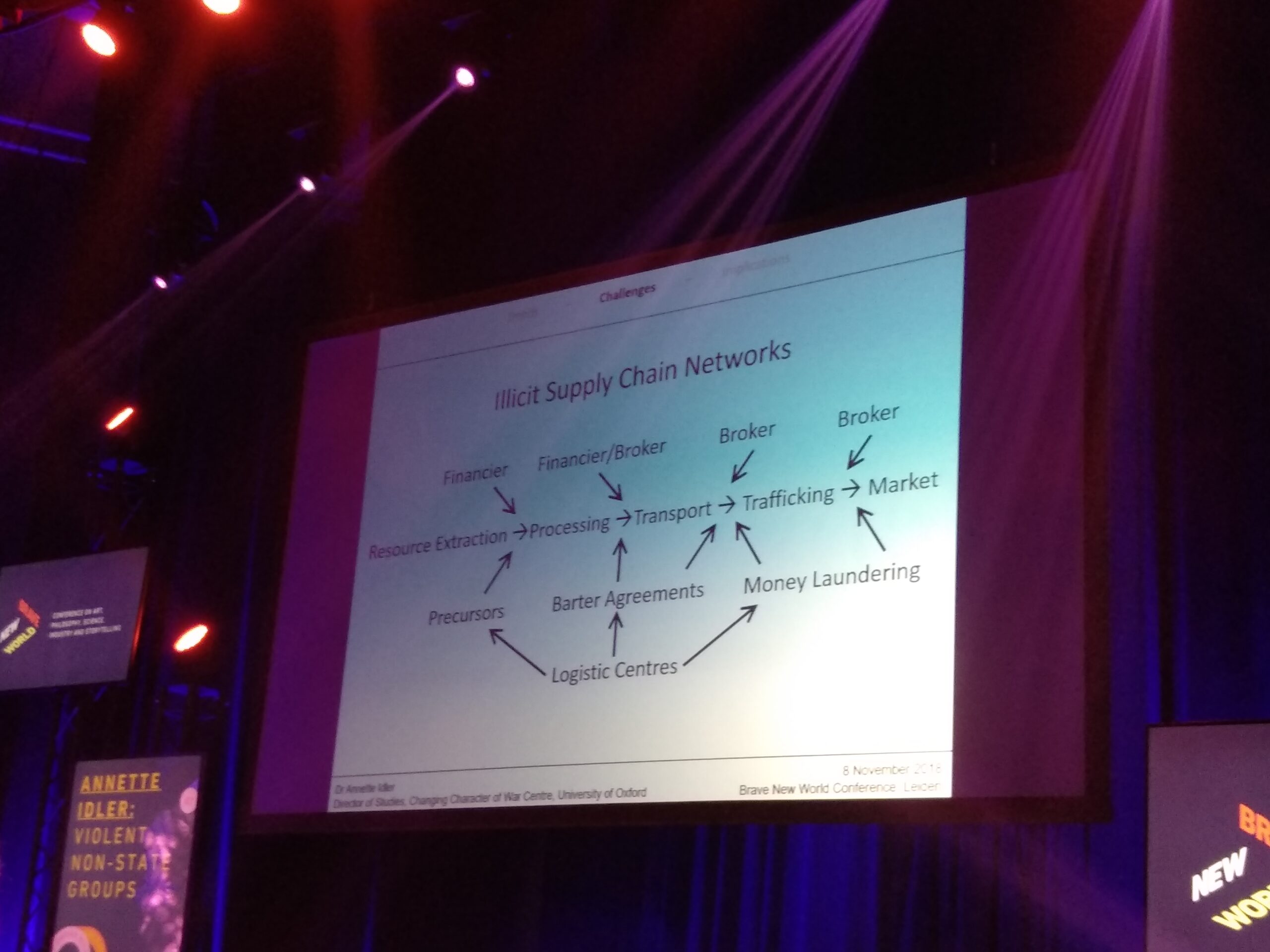 Had Freedman al gewezen op het sociale aspect van conflicten; dat werd uitgediept door Annette Idler. Geen vrolijk stemmend verhaal omdat ze wees op de vermenging van conflicten en criminaliteit bij niet-staat groepen. Technologie is voor hen niet primair nodig in het conflict, maar wel voor criminele activiteiten om de strijd te bekostigen. Winstgevendheid gaat dan voor idealisme (als dat er al is). Het is hier dat (gebrek aan) vertrouwen in de presentaties een steeds belangrijkere rol krijgt. Want wie is wie, als ook je buurman – in een kleine rol – mogelijk betrokken is. Of waarin ‘de criminelen’ ook zorg dragen voor veiligheid in de wijk, voor medische hulp, en ‘belastingen’ en verkeersboetes innen. Het worden complexe netwerken, met daarin “schaduwburgers”. Die verwevenheid betekent meteen ook dat niet alleen juridisch en militair moet worden opgetreden, maar vooral ook sociale interventies nodig zijn. Dat maakt deze vorm van conflict taai en lastig om aan te pakken.