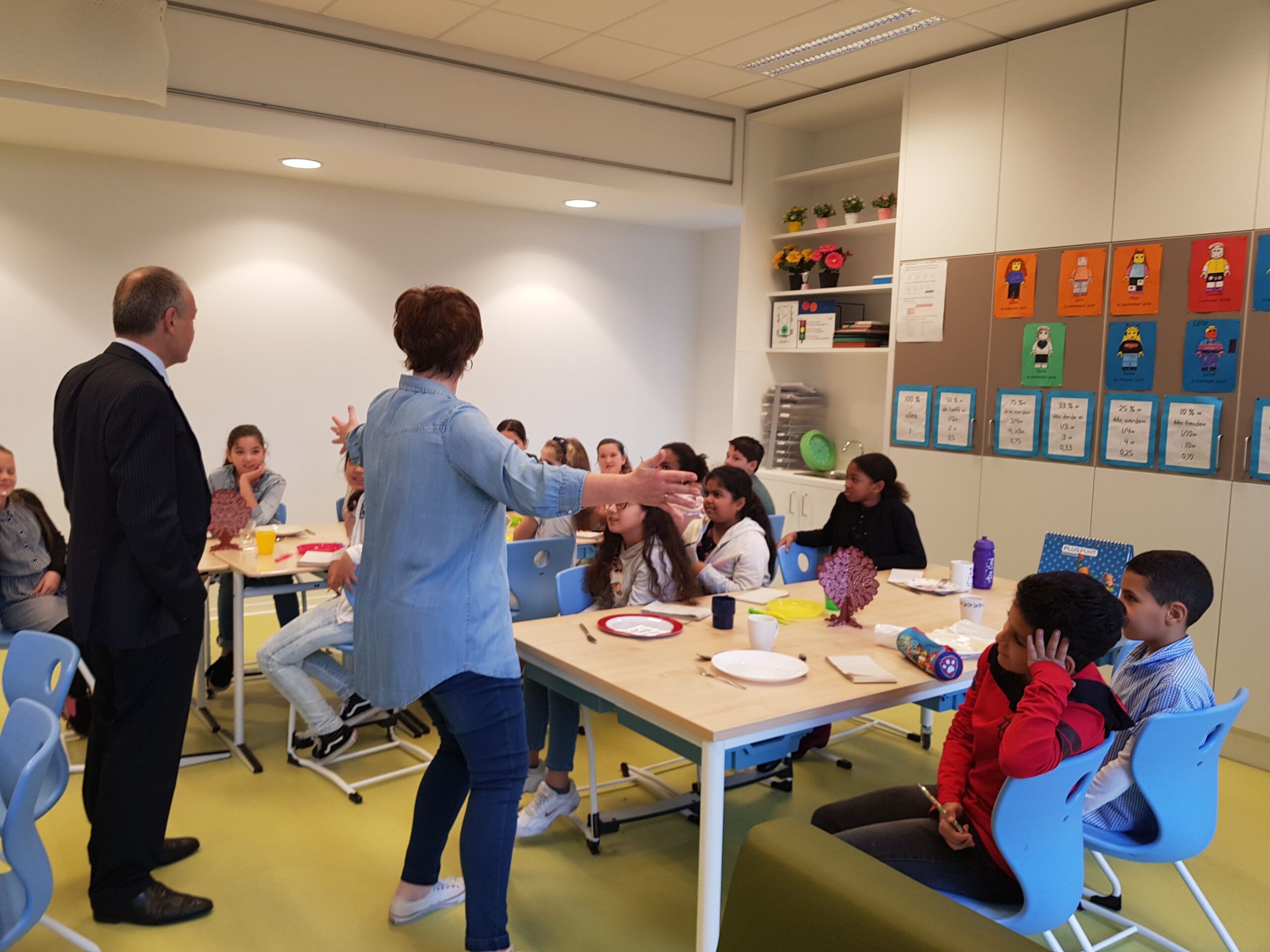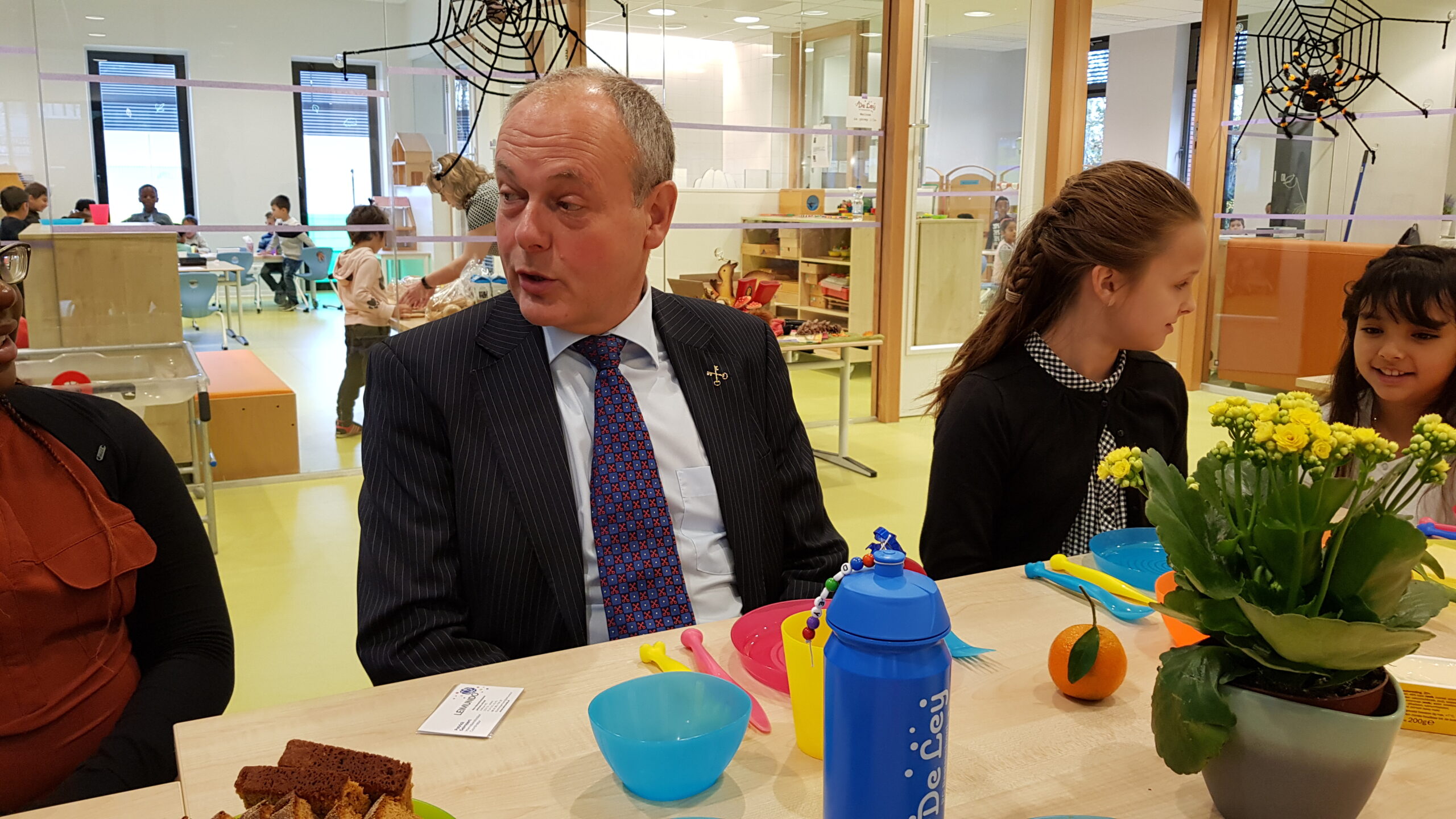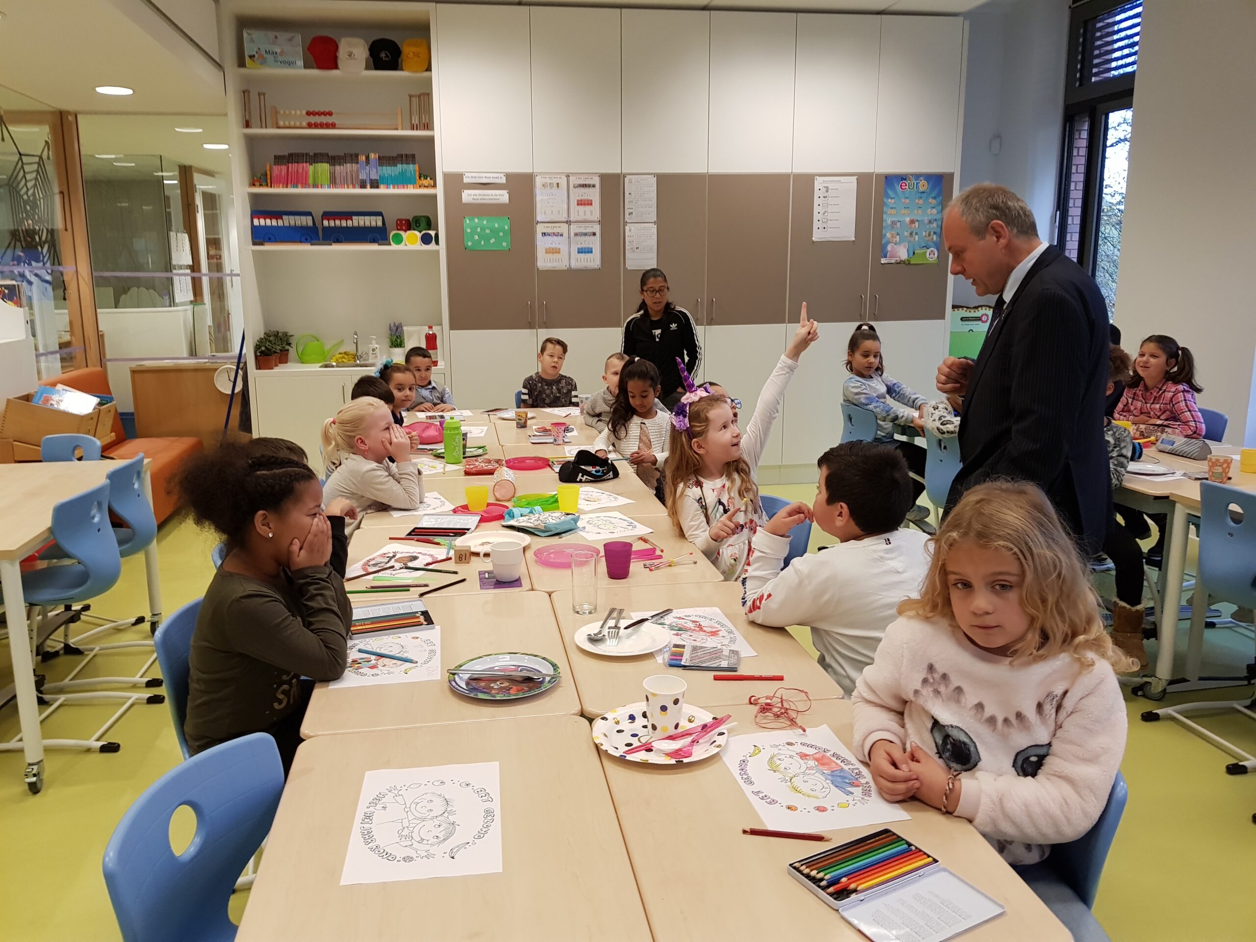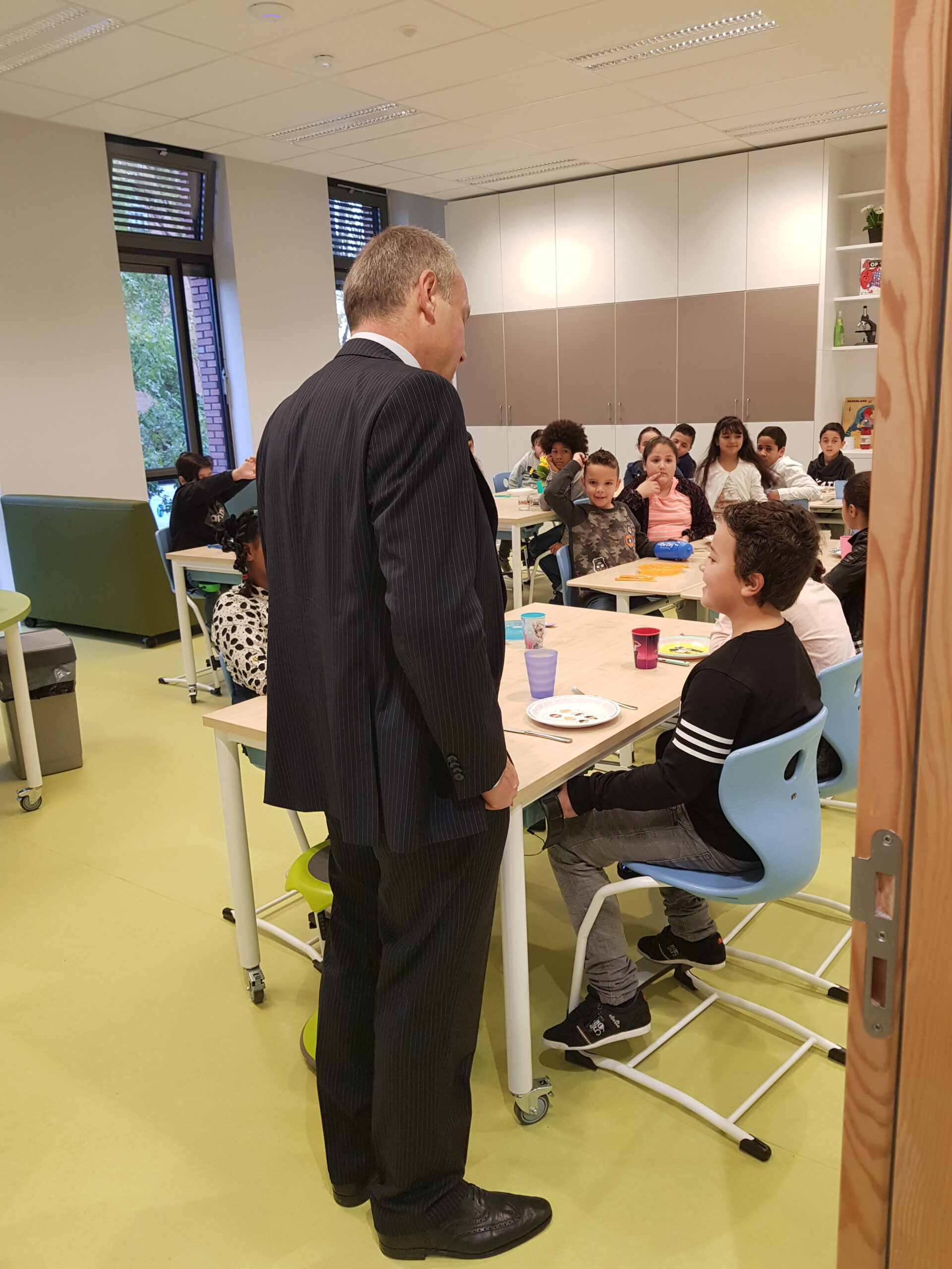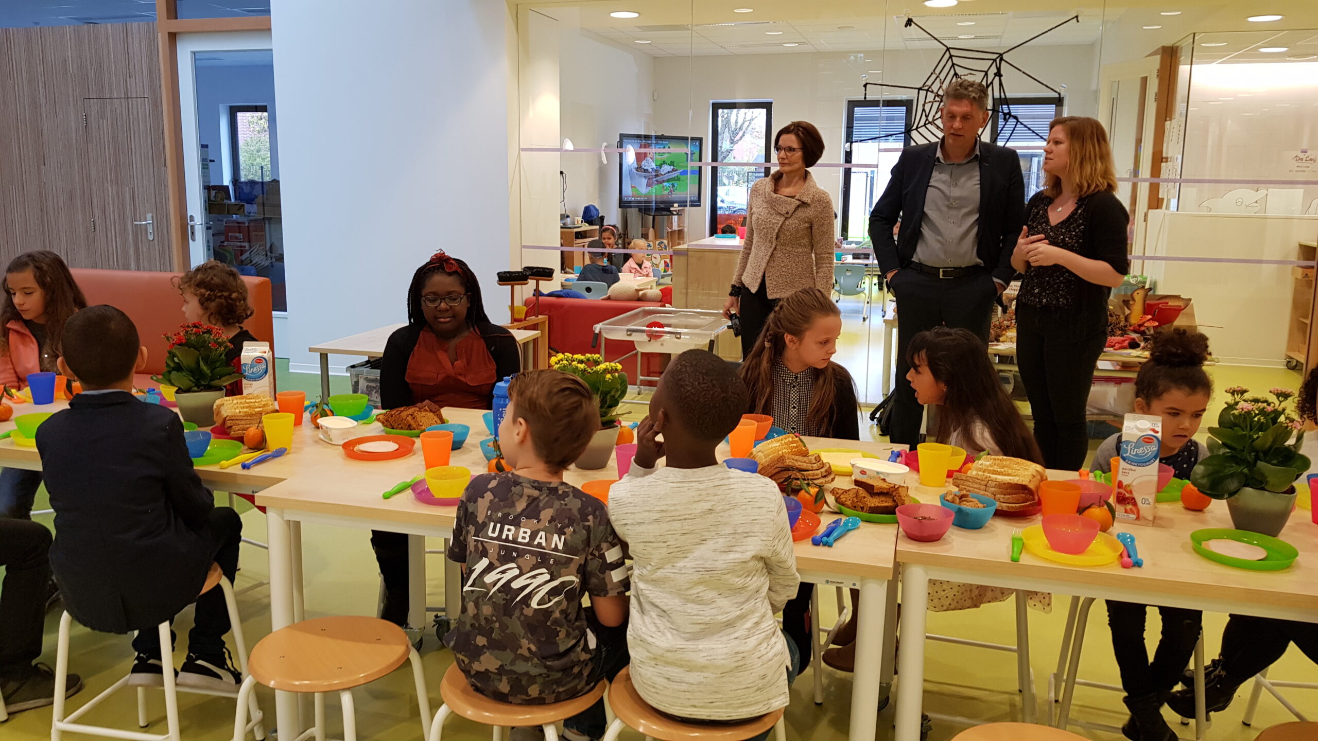 Chris de Waard ging naar het Nationaal Schoolontbijt op De Ley en sprak met directeur Anja van Schagen, met burgemeester Lenferink, met een aantal leerlingen en met directeur Babette van Leeuwen van basisschool Leimundo .
