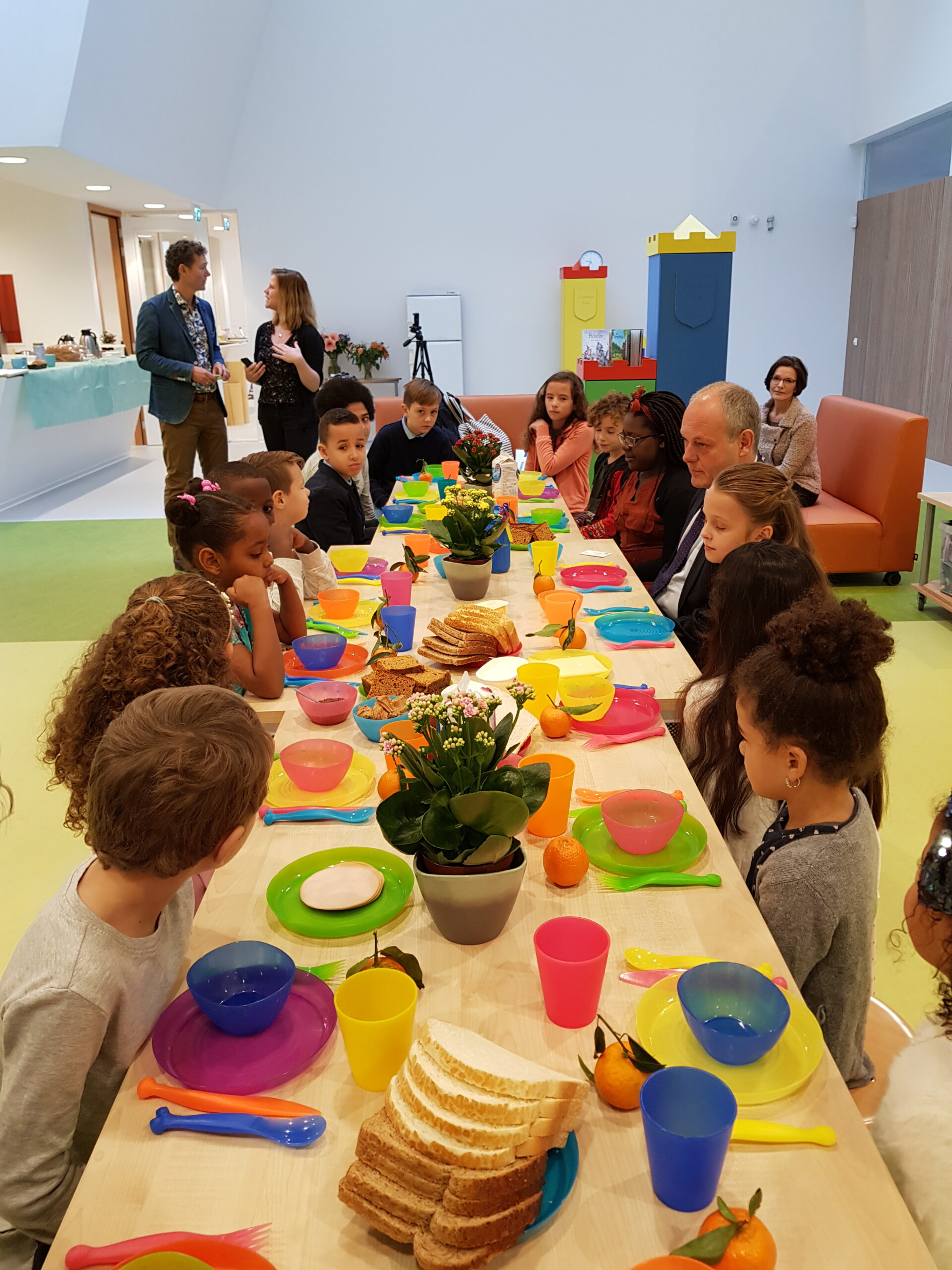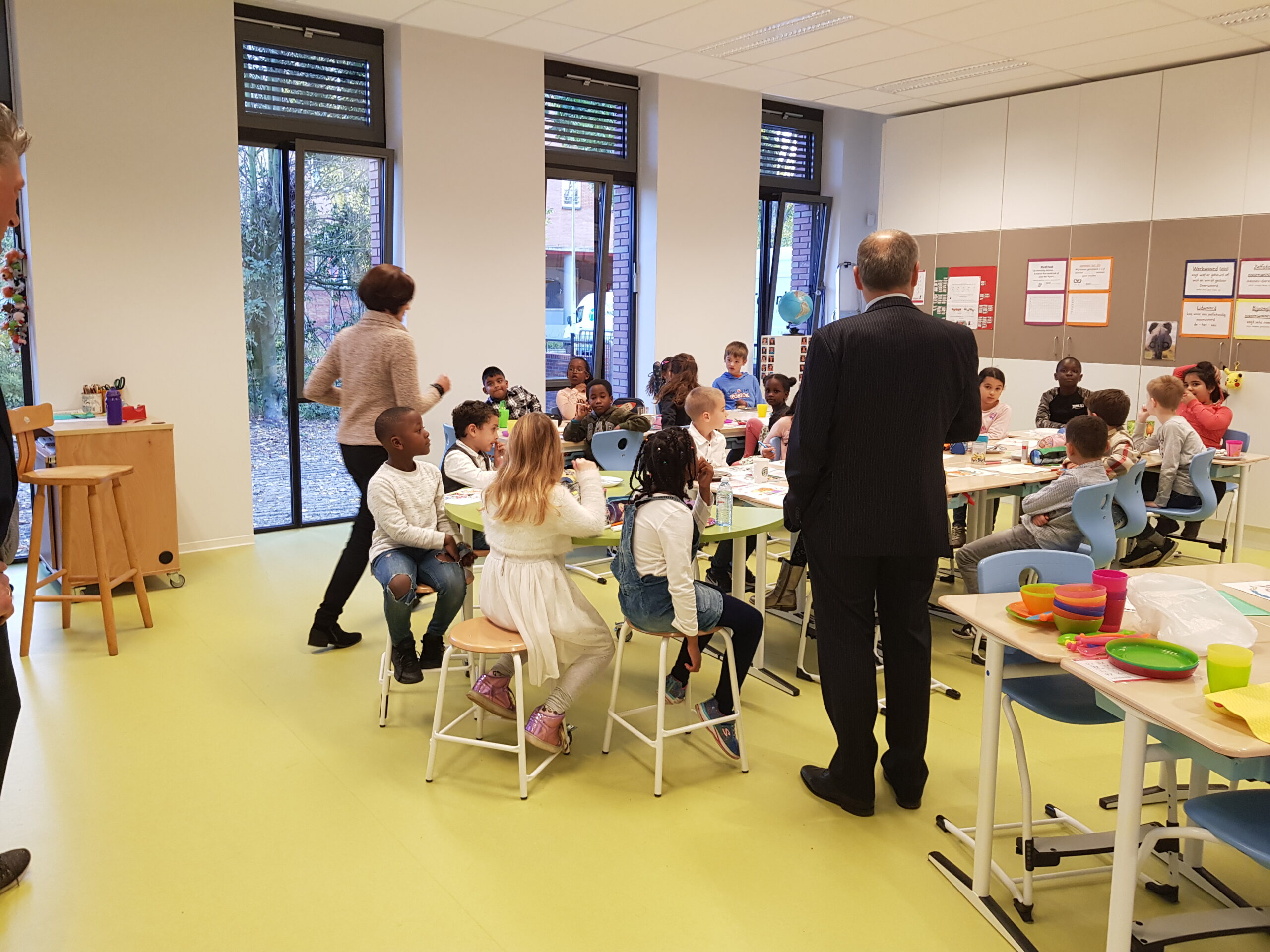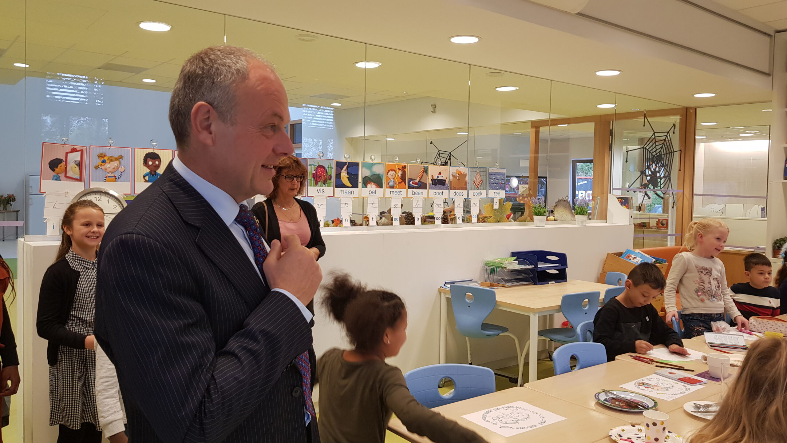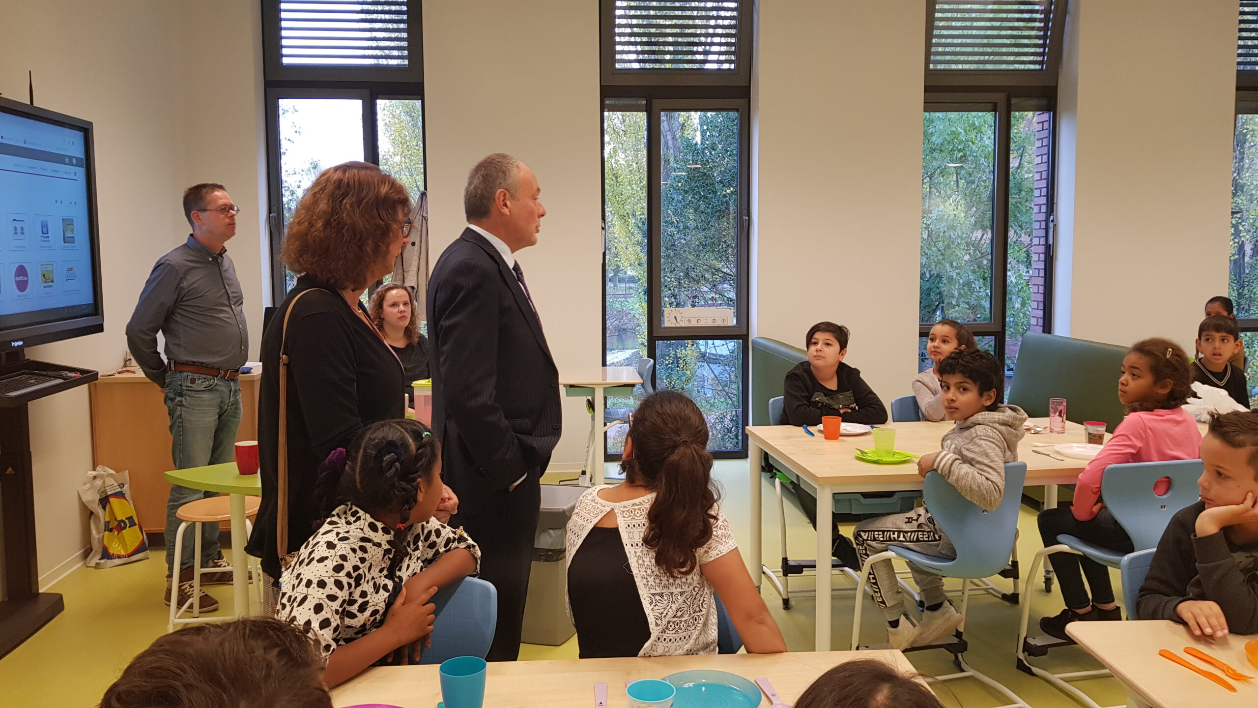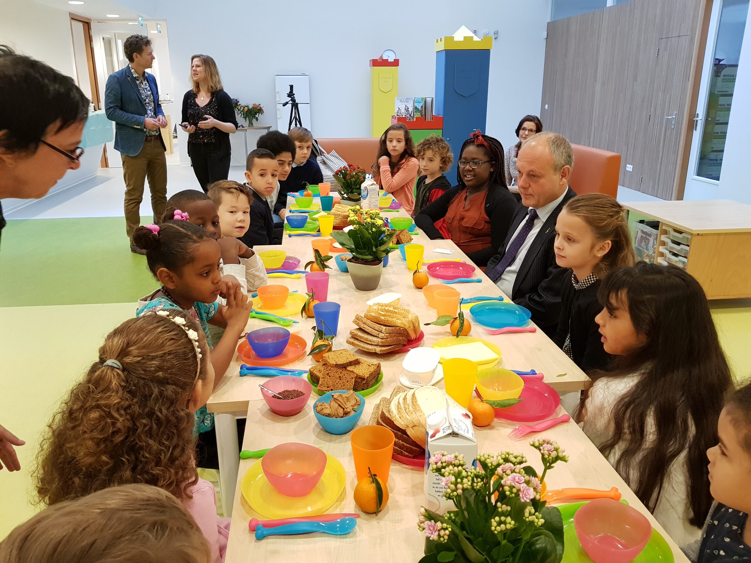 Chris de Waard ging naar het Nationaal Schoolontbijt op De Ley en sprak met directeur Anja van Schagen, met burgemeester Lenferink, met een aantal leerlingen en met directeur Babette van Leeuwen van basisschool Leimundo .