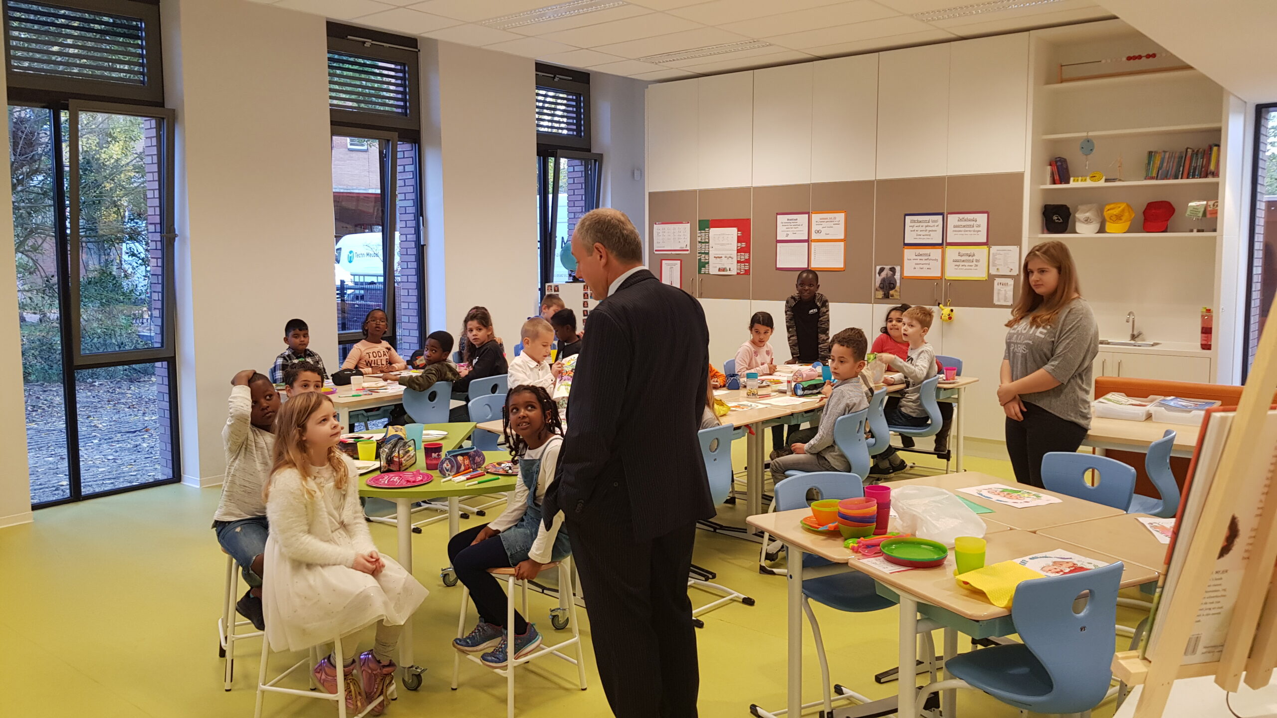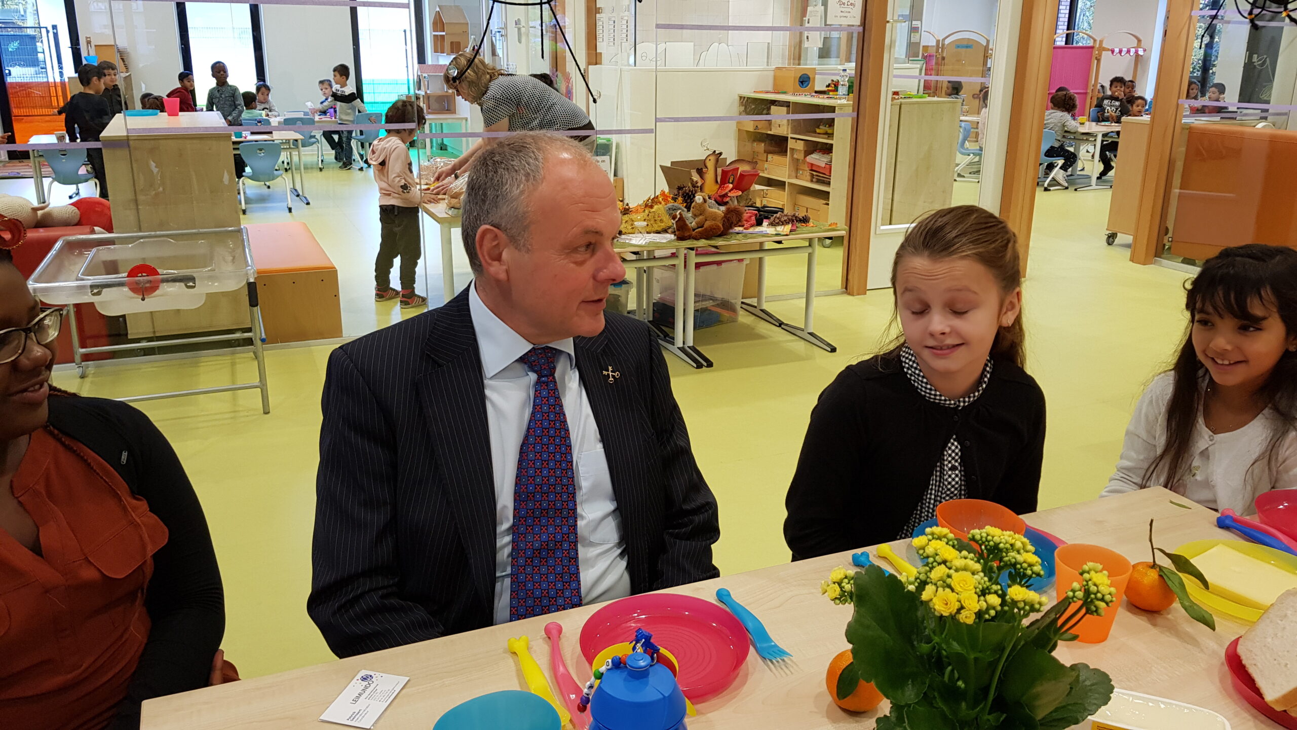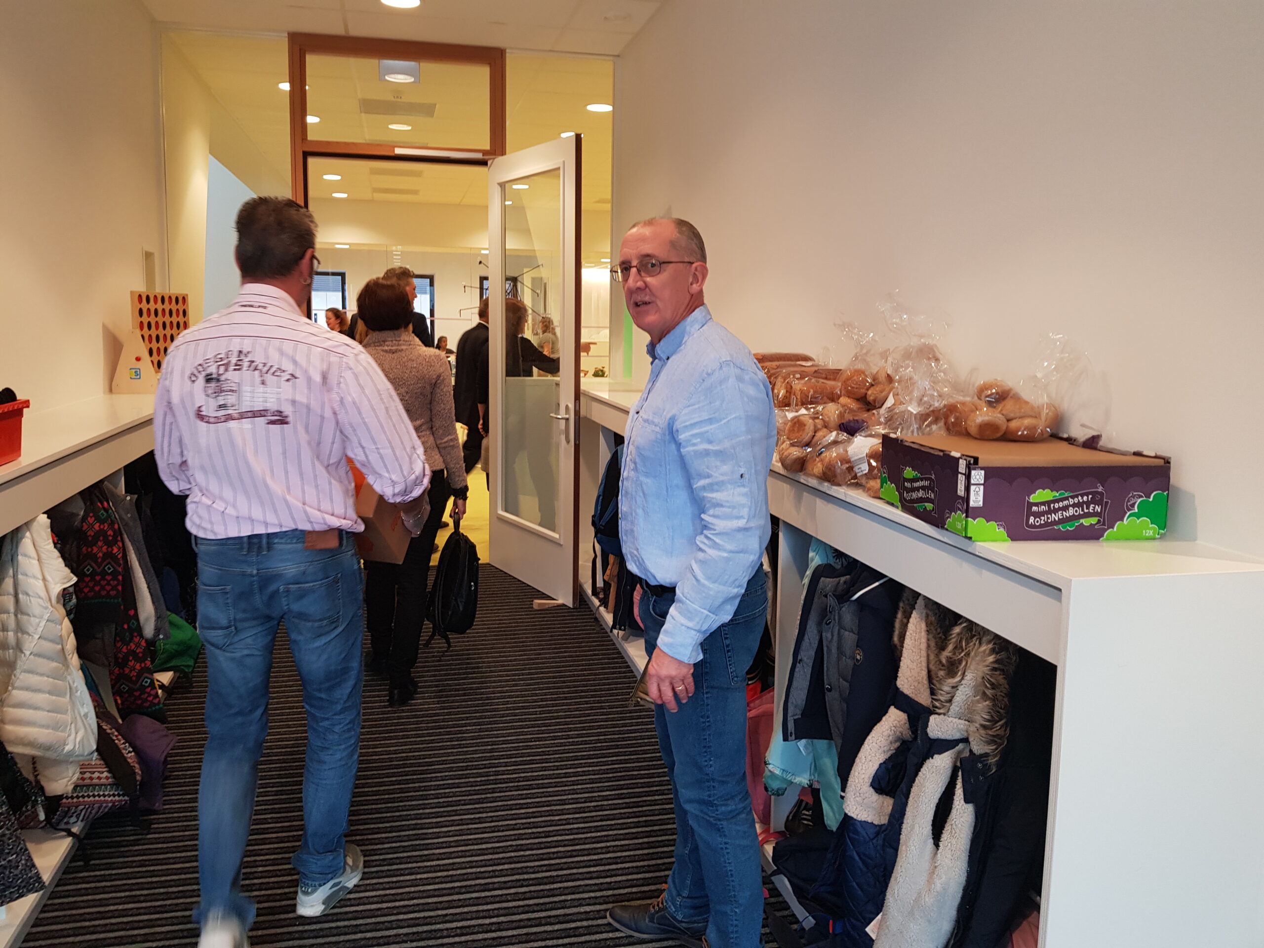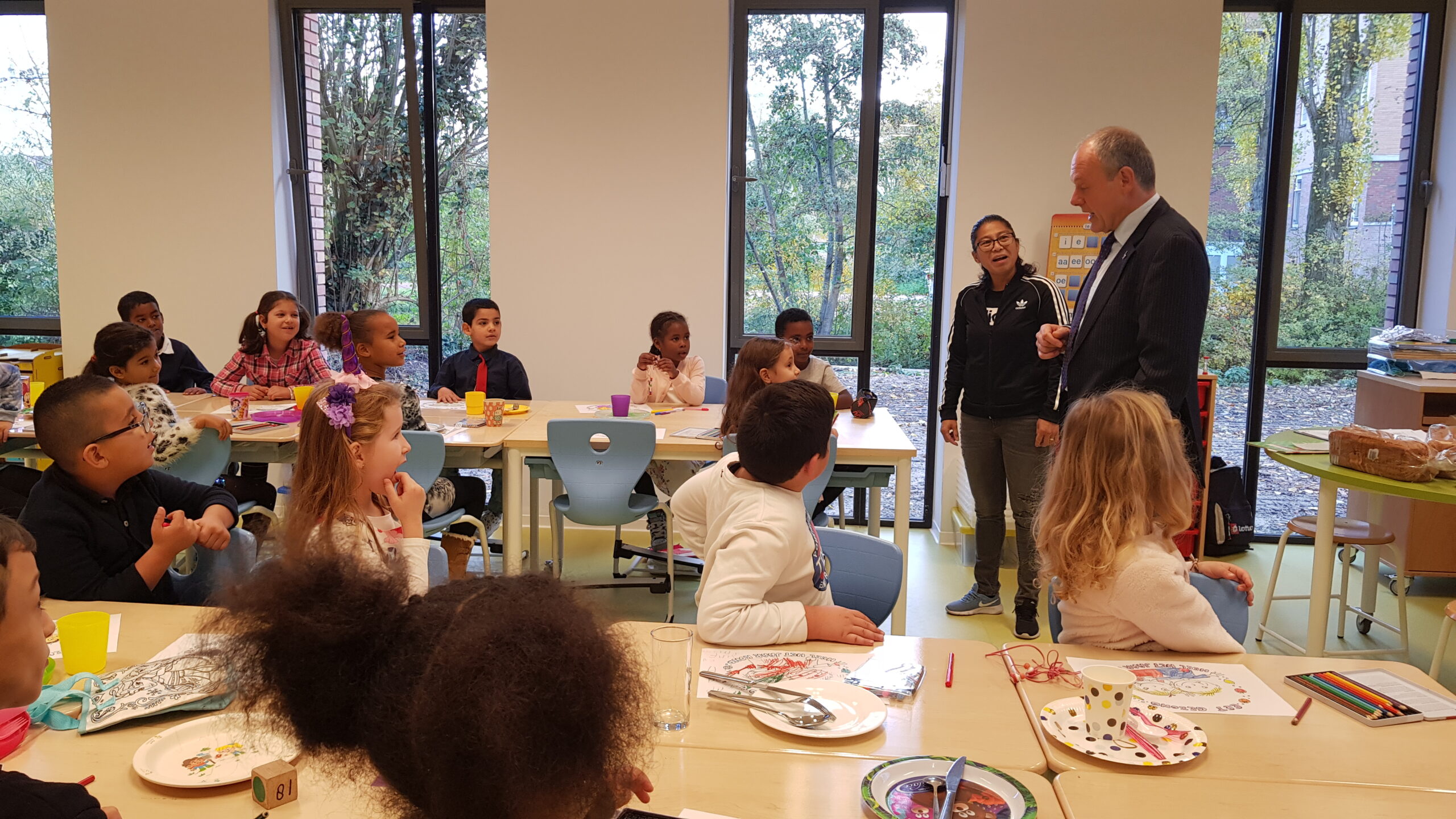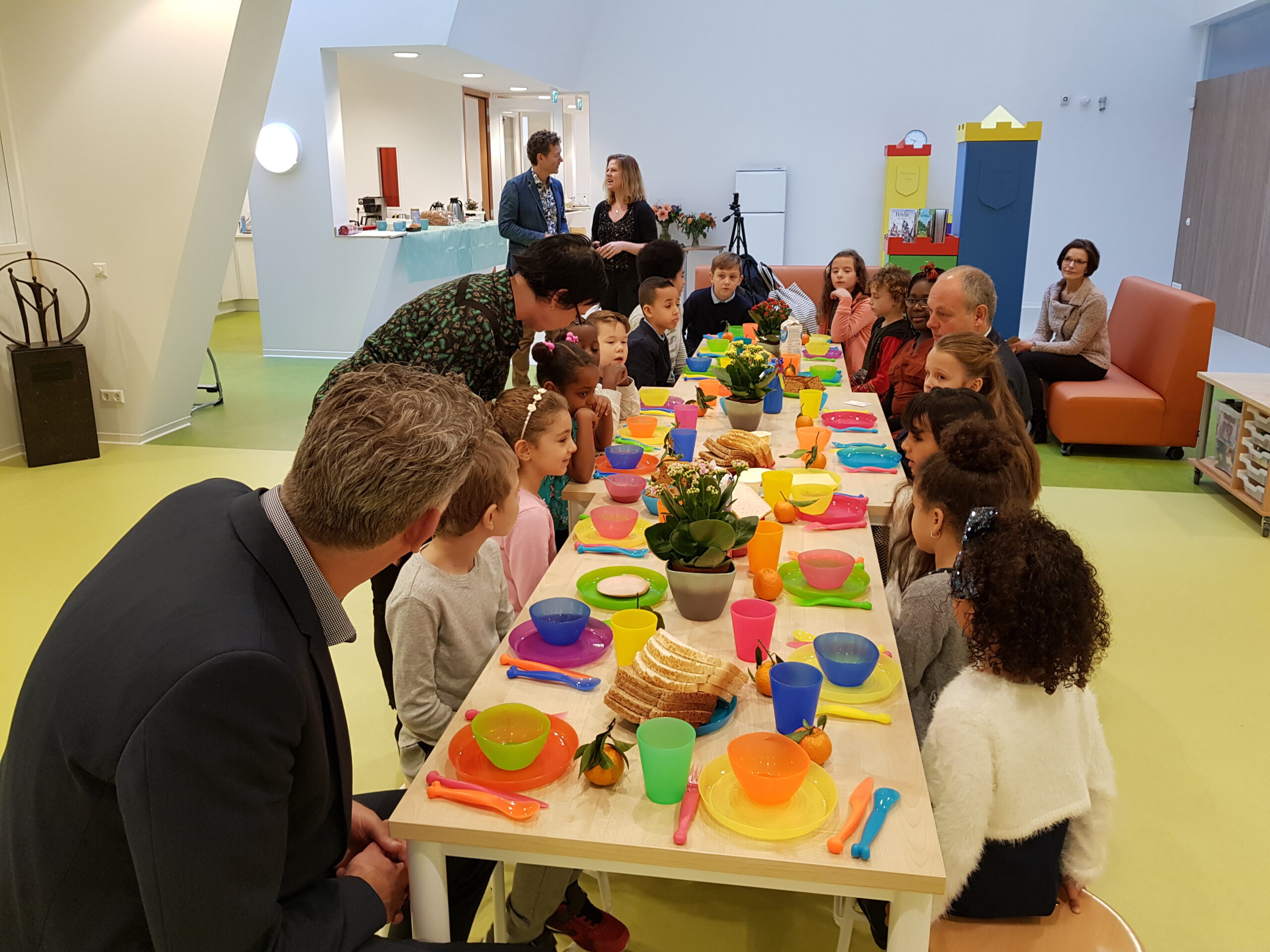 Chris de Waard ging naar het Nationaal Schoolontbijt op De Ley en sprak met directeur Anja van Schagen, met burgemeester Lenferink, met een aantal leerlingen en met directeur Babette van Leeuwen van basisschool Leimundo .