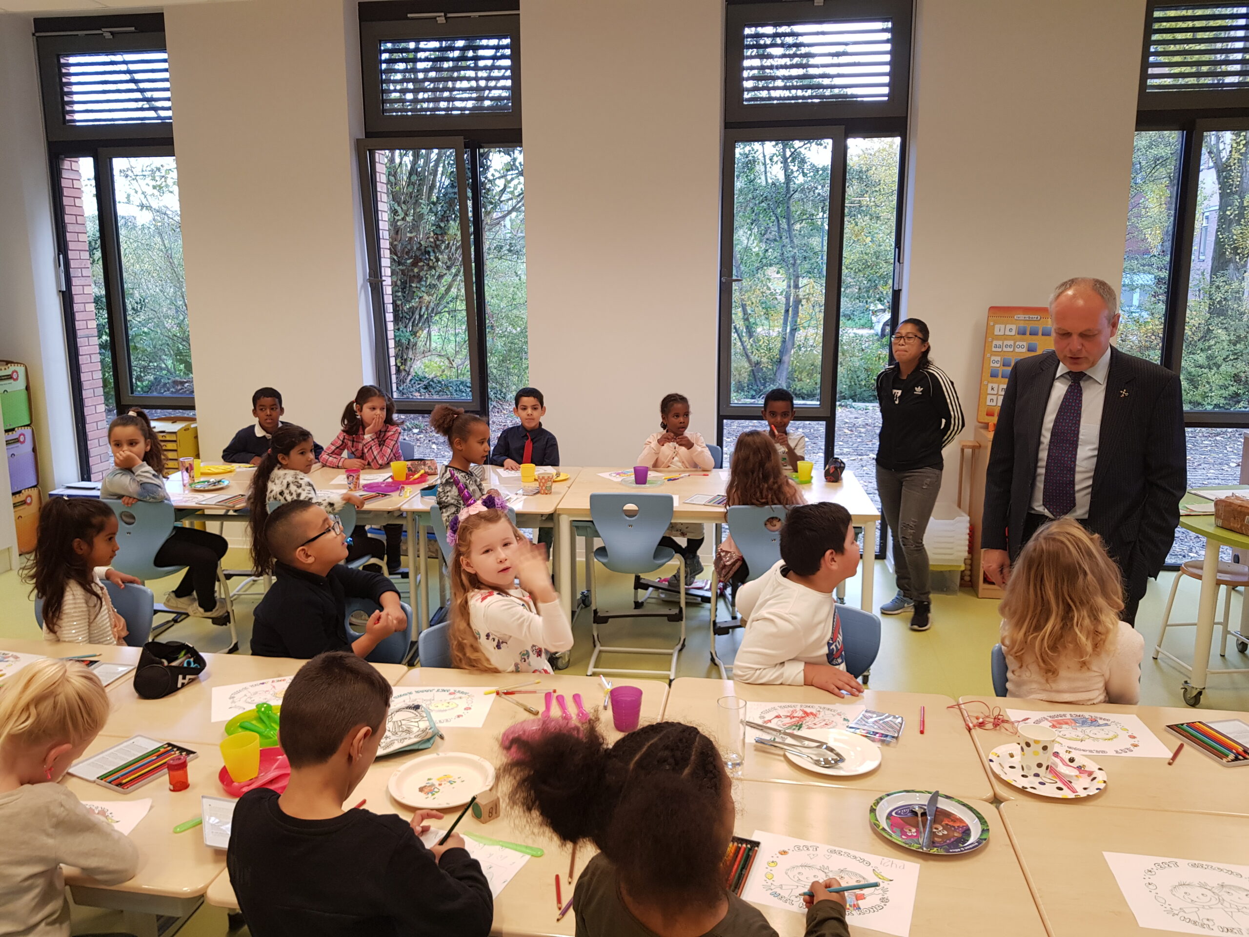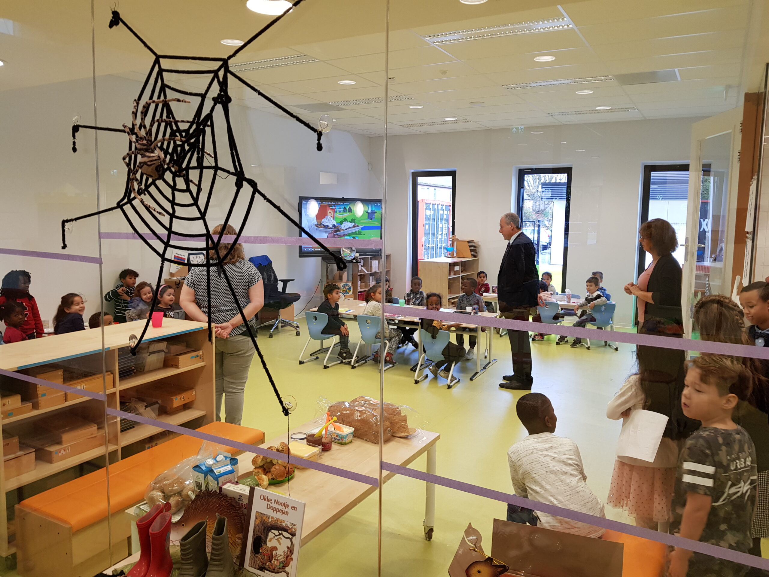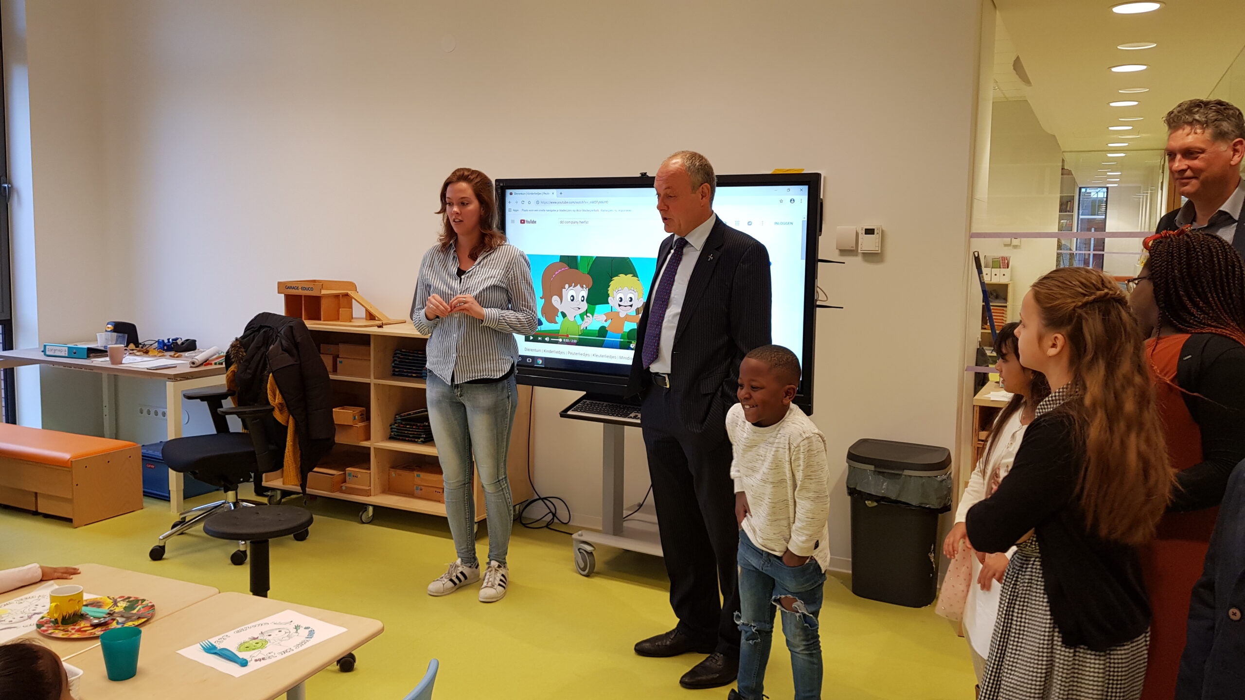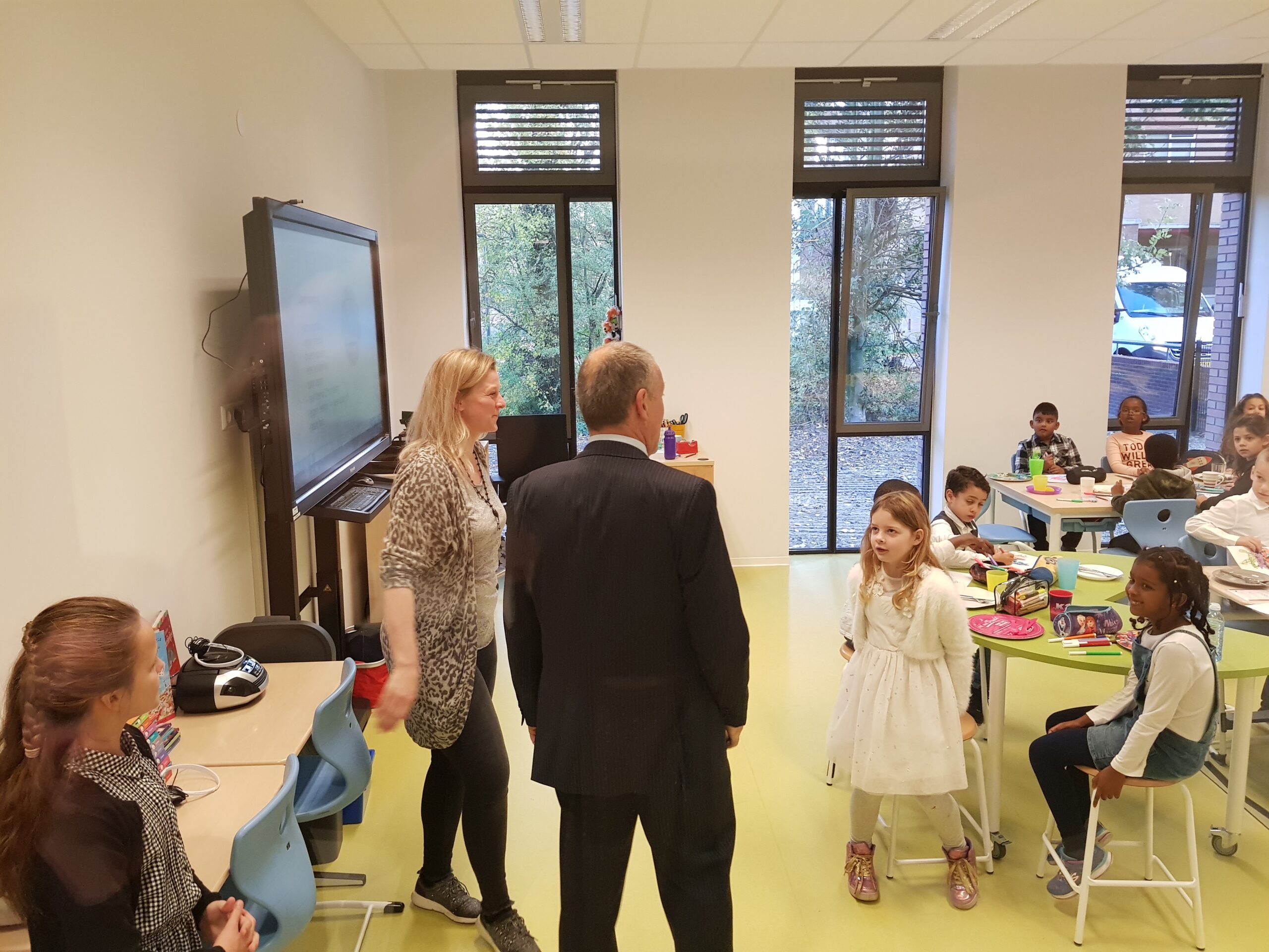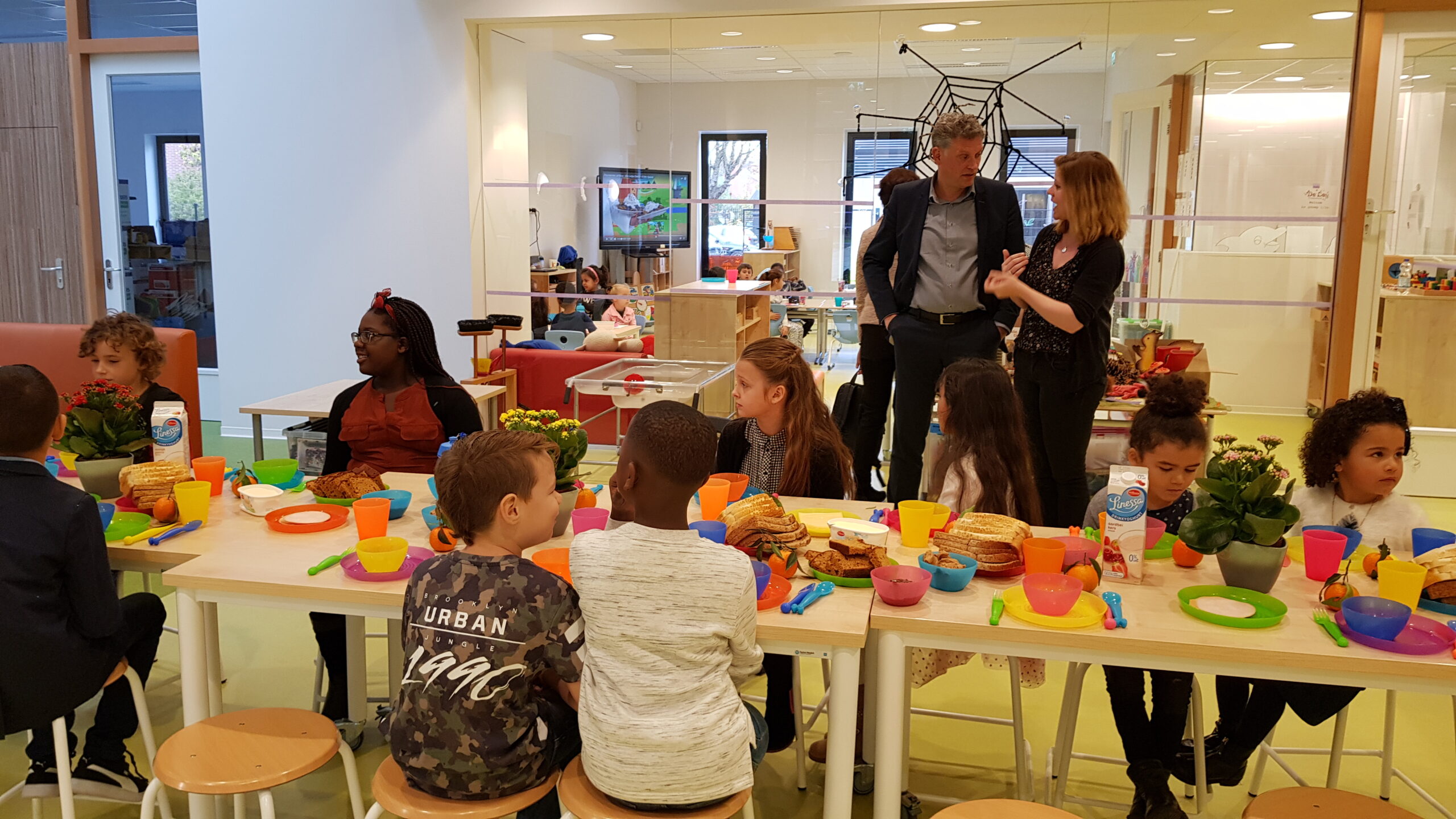 Chris de Waard ging naar het Nationaal Schoolontbijt op De Ley en sprak met directeur Anja van Schagen, met burgemeester Lenferink, met een aantal leerlingen en met directeur Babette van Leeuwen van basisschool Leimundo .