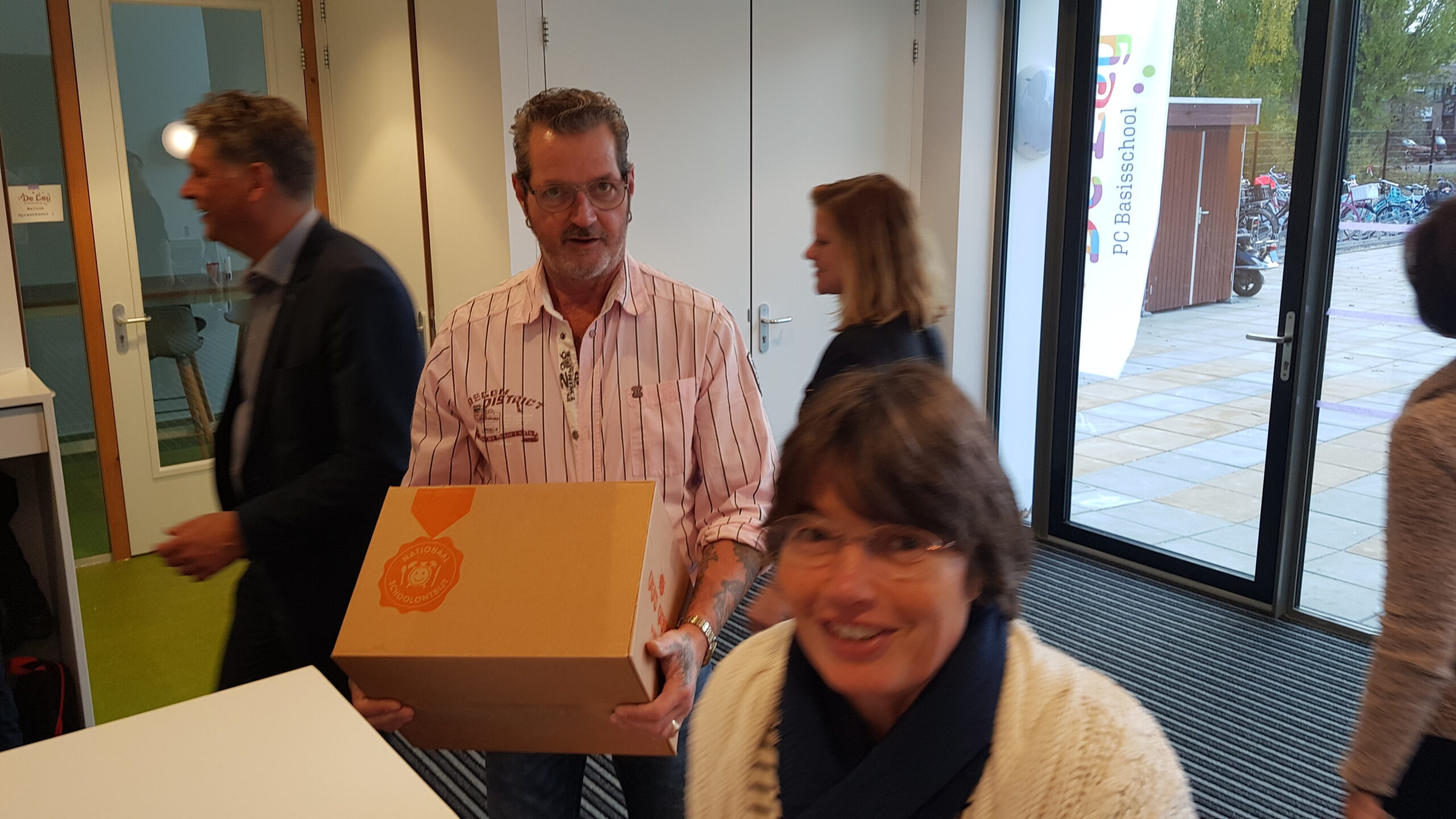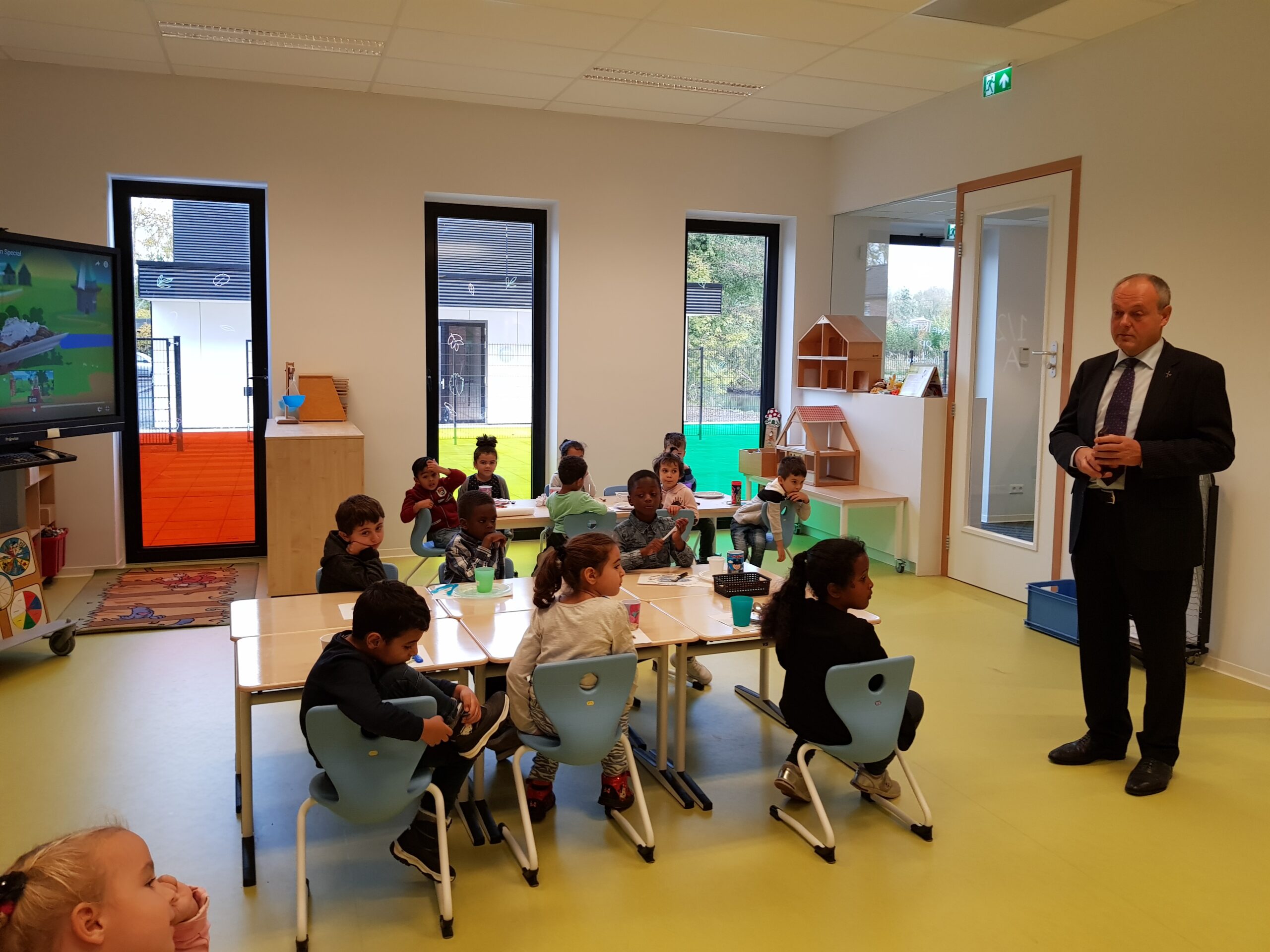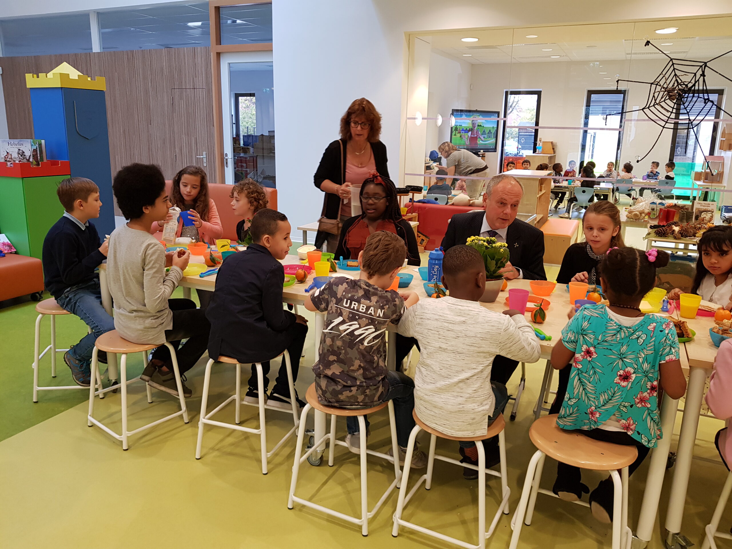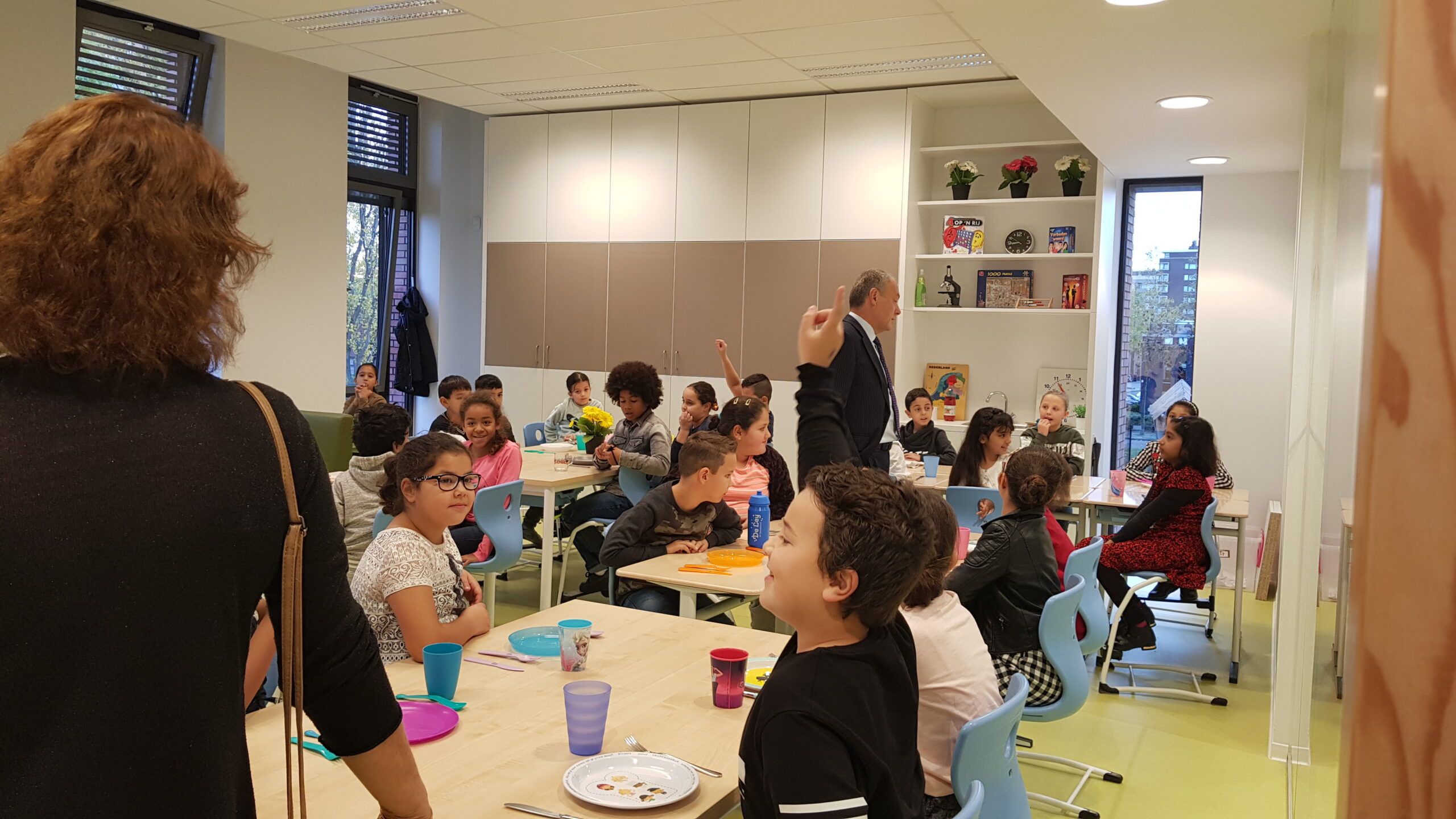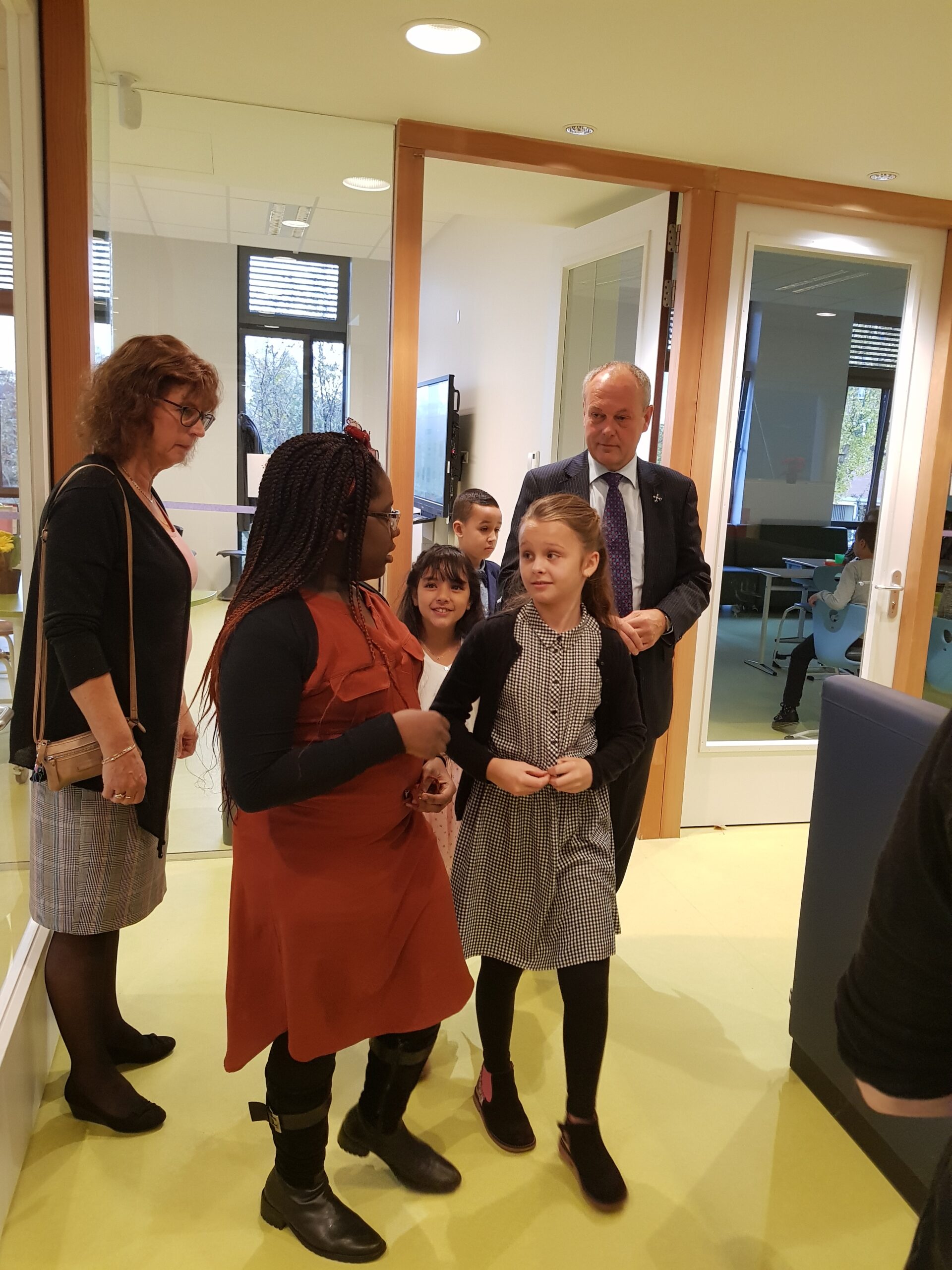 Chris de Waard ging naar het Nationaal Schoolontbijt op De Ley en sprak met directeur Anja van Schagen, met burgemeester Lenferink, met een aantal leerlingen en met directeur Babette van Leeuwen van basisschool Leimundo .