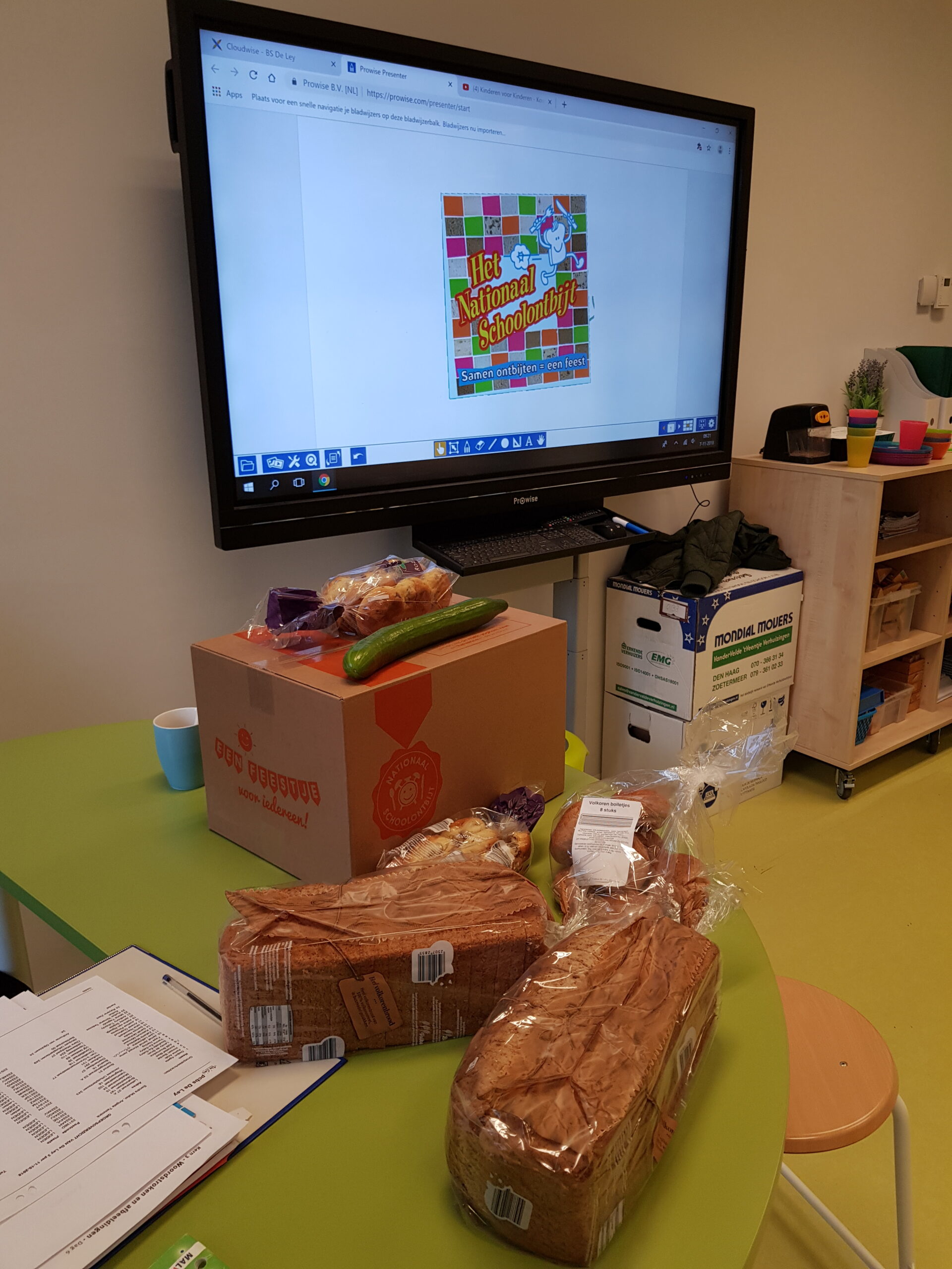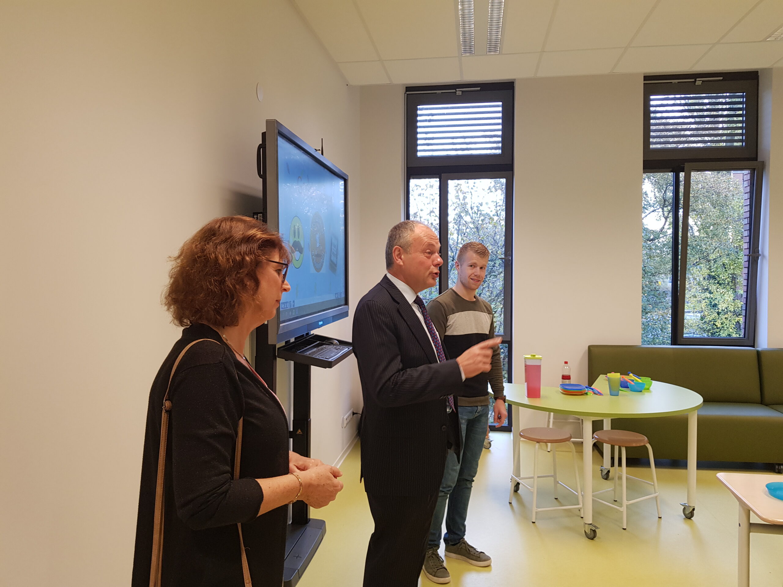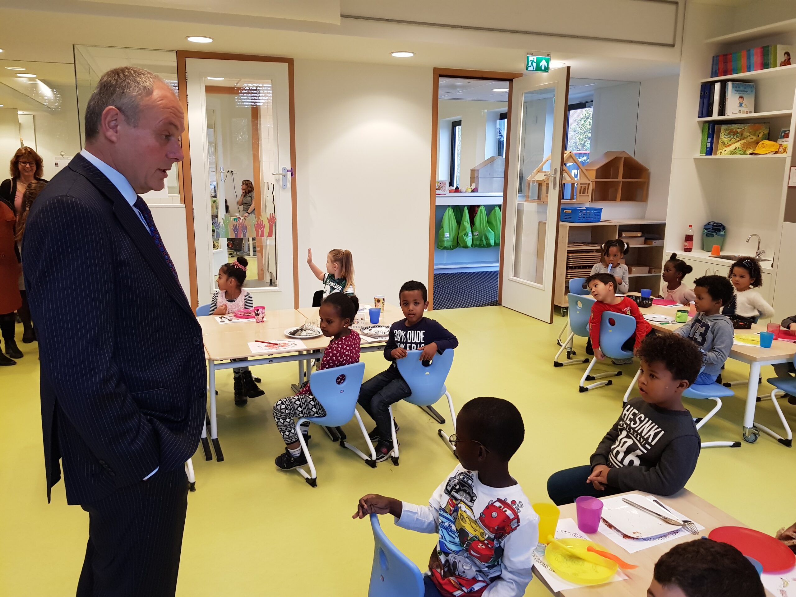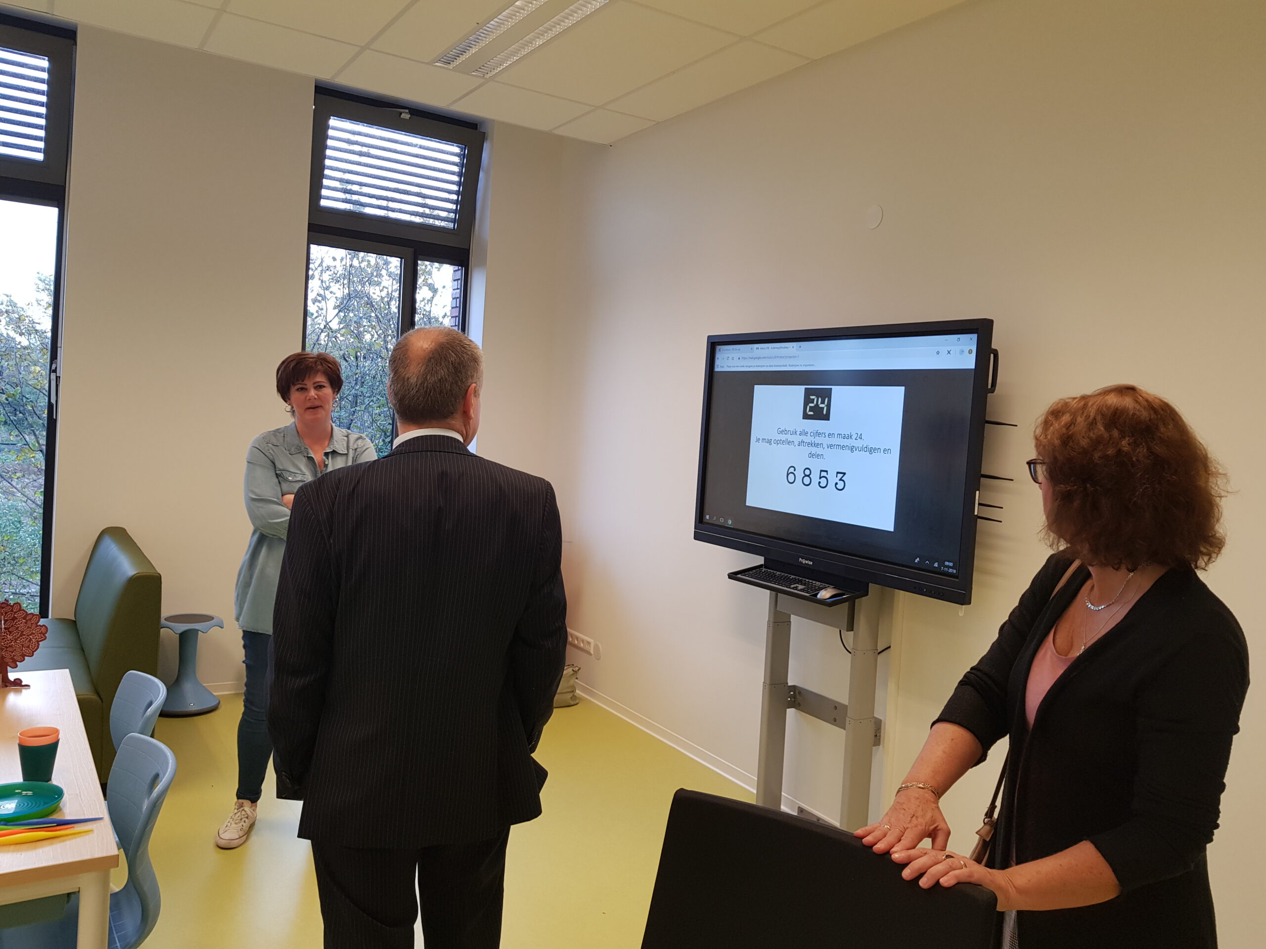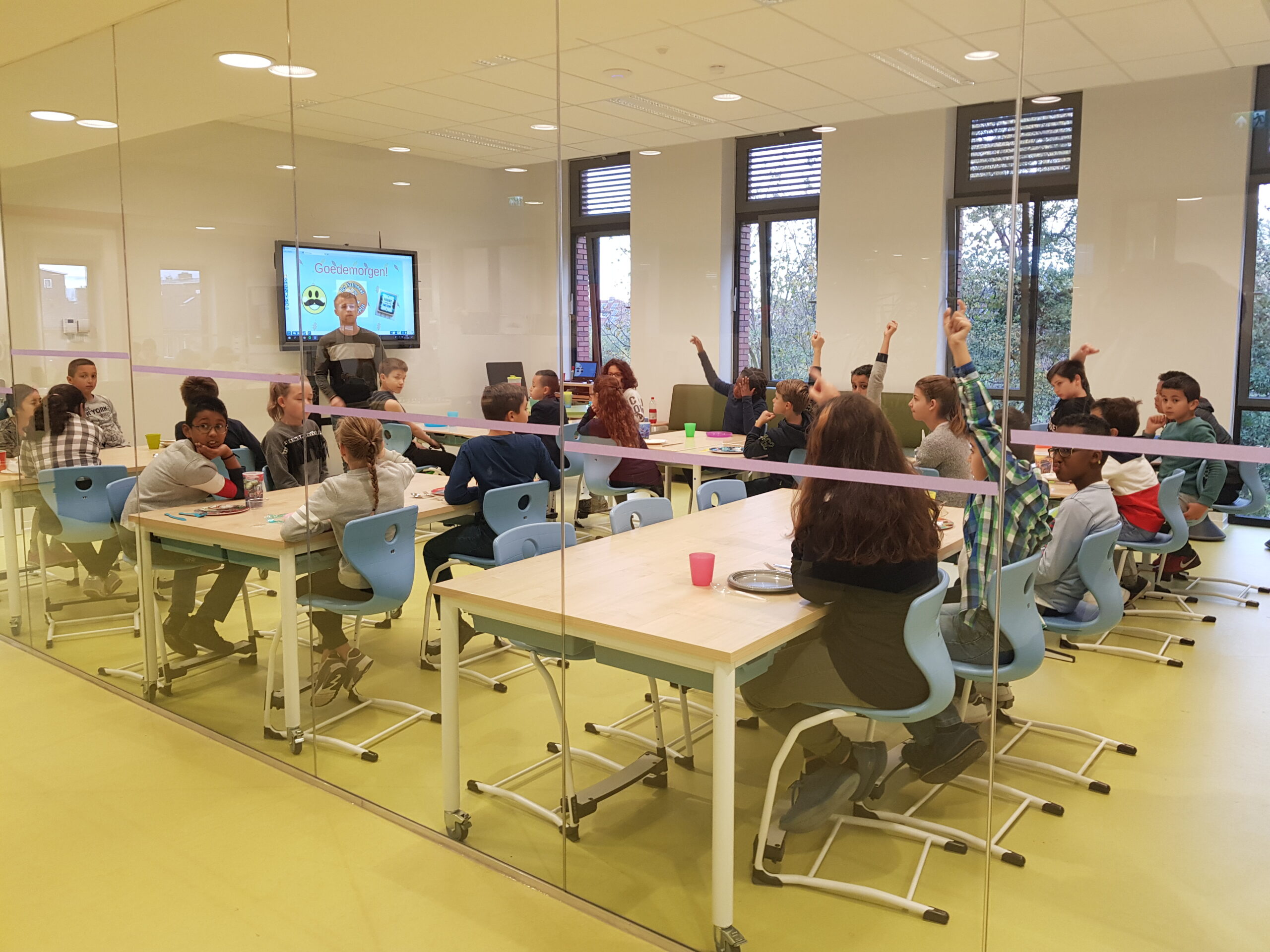 Chris de Waard ging naar het Nationaal Schoolontbijt op De Ley en sprak met directeur Anja van Schagen, met burgemeester Lenferink, met een aantal leerlingen en met directeur Babette van Leeuwen van basisschool Leimundo .