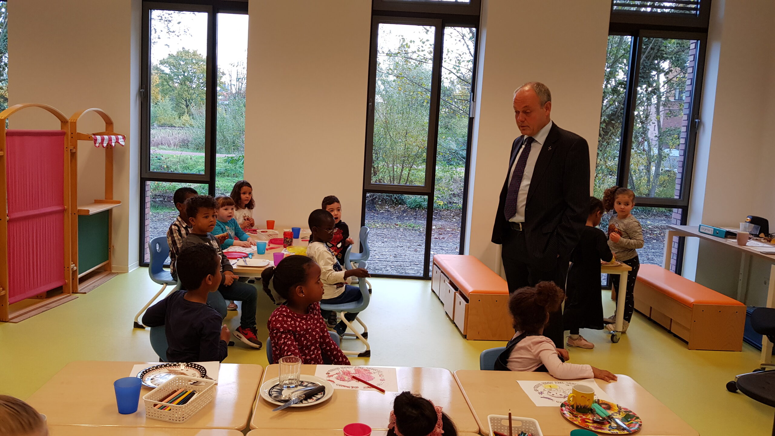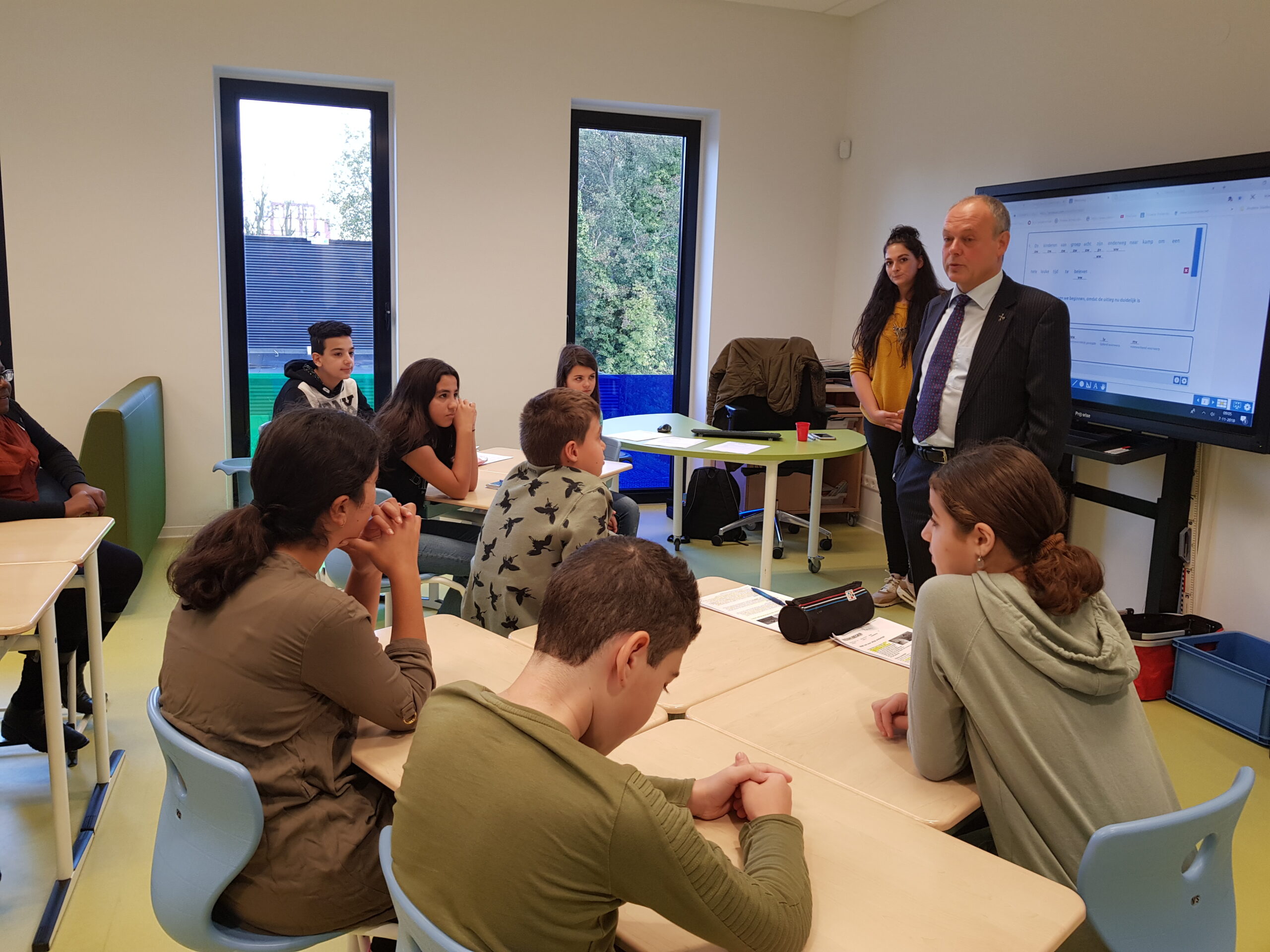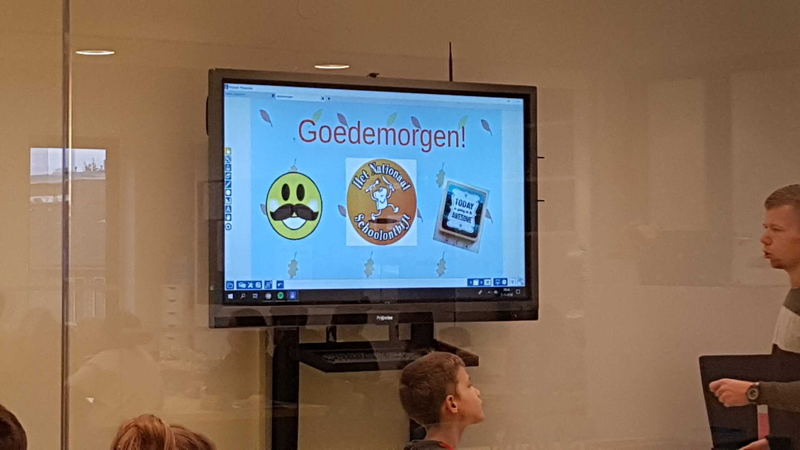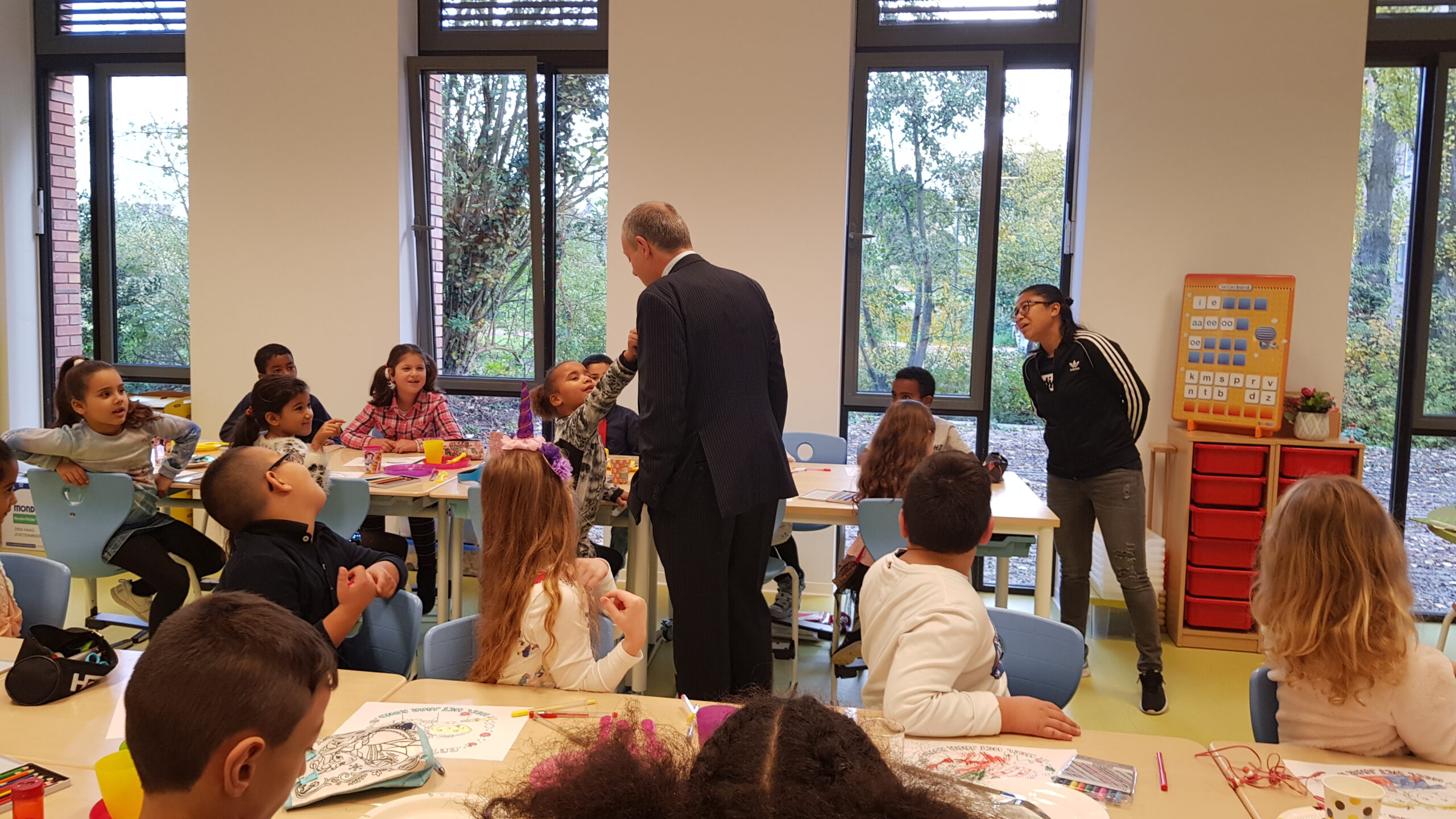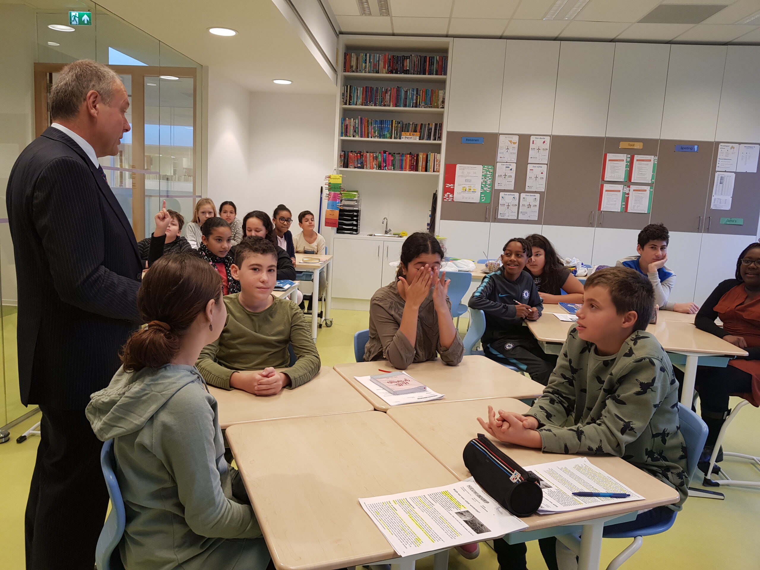 Chris de Waard ging naar het Nationaal Schoolontbijt op De Ley en sprak met directeur Anja van Schagen, met burgemeester Lenferink, met een aantal leerlingen en met directeur Babette van Leeuwen van basisschool Leimundo .