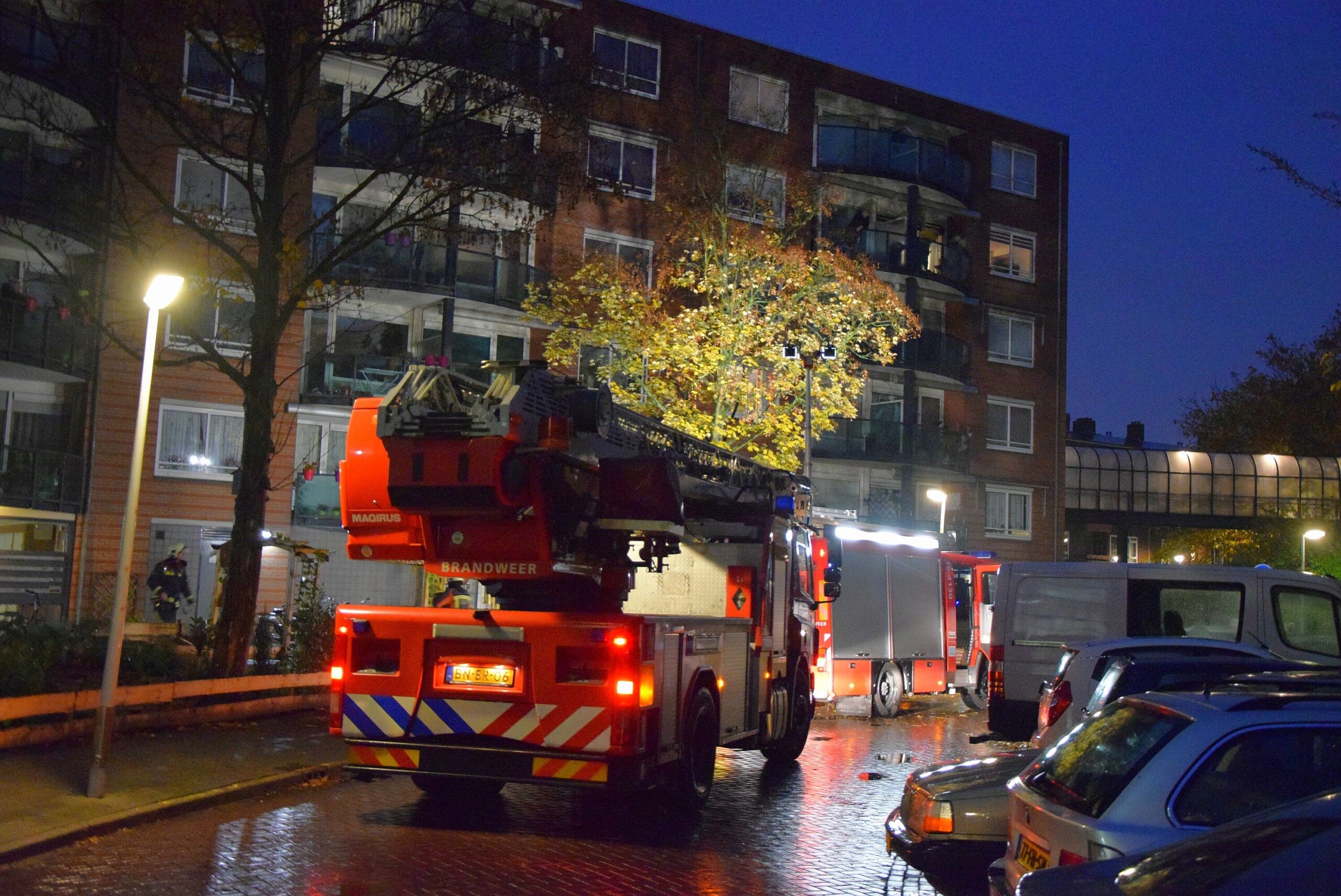 Bij een keukenbrandje in een appartement in de de Albertine Agnesstraat in Leiden-Noord hebben de bewoners rook ingeademd. Het ambulancepersoneel heeft de bewoners in de ambulance nagekeken.