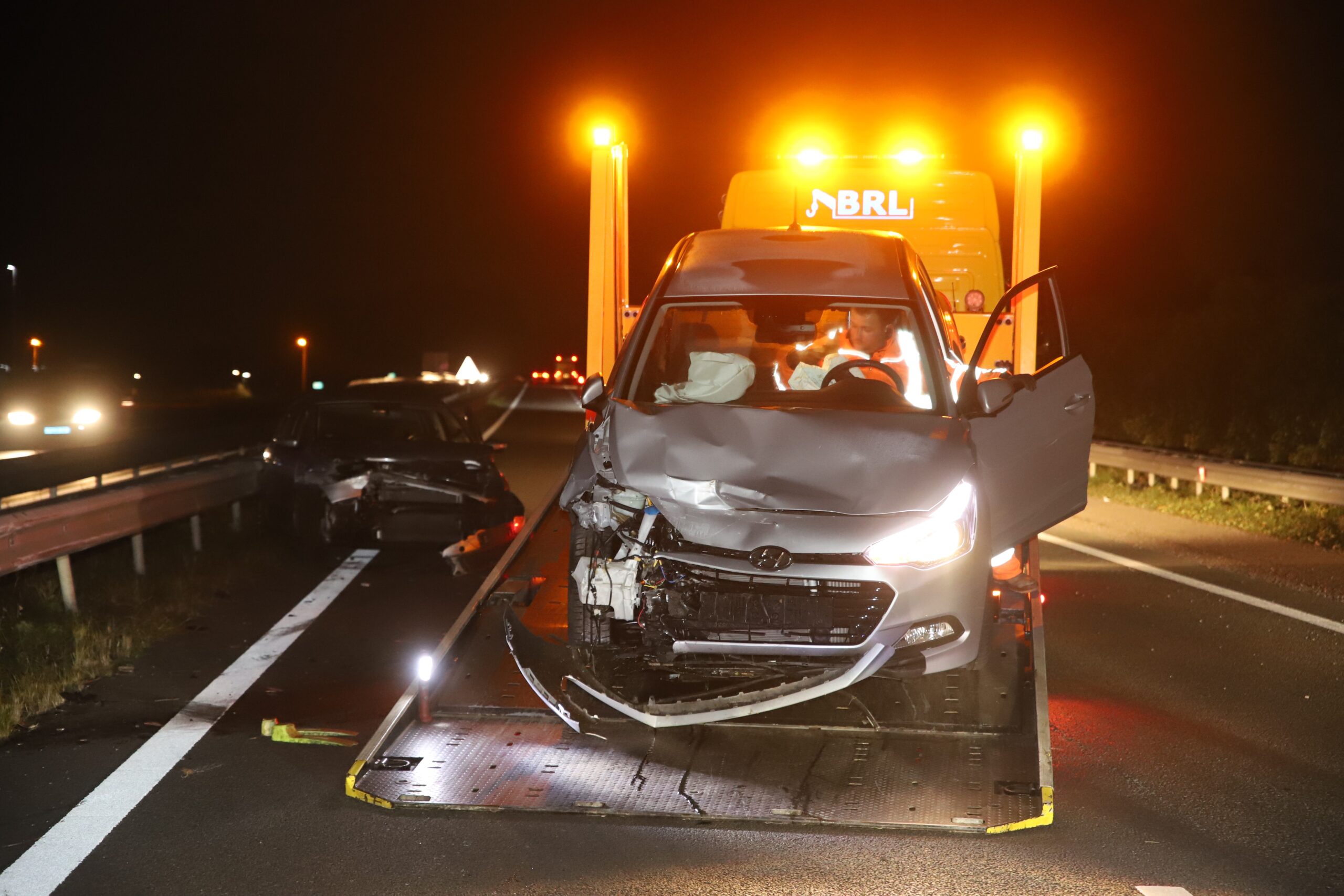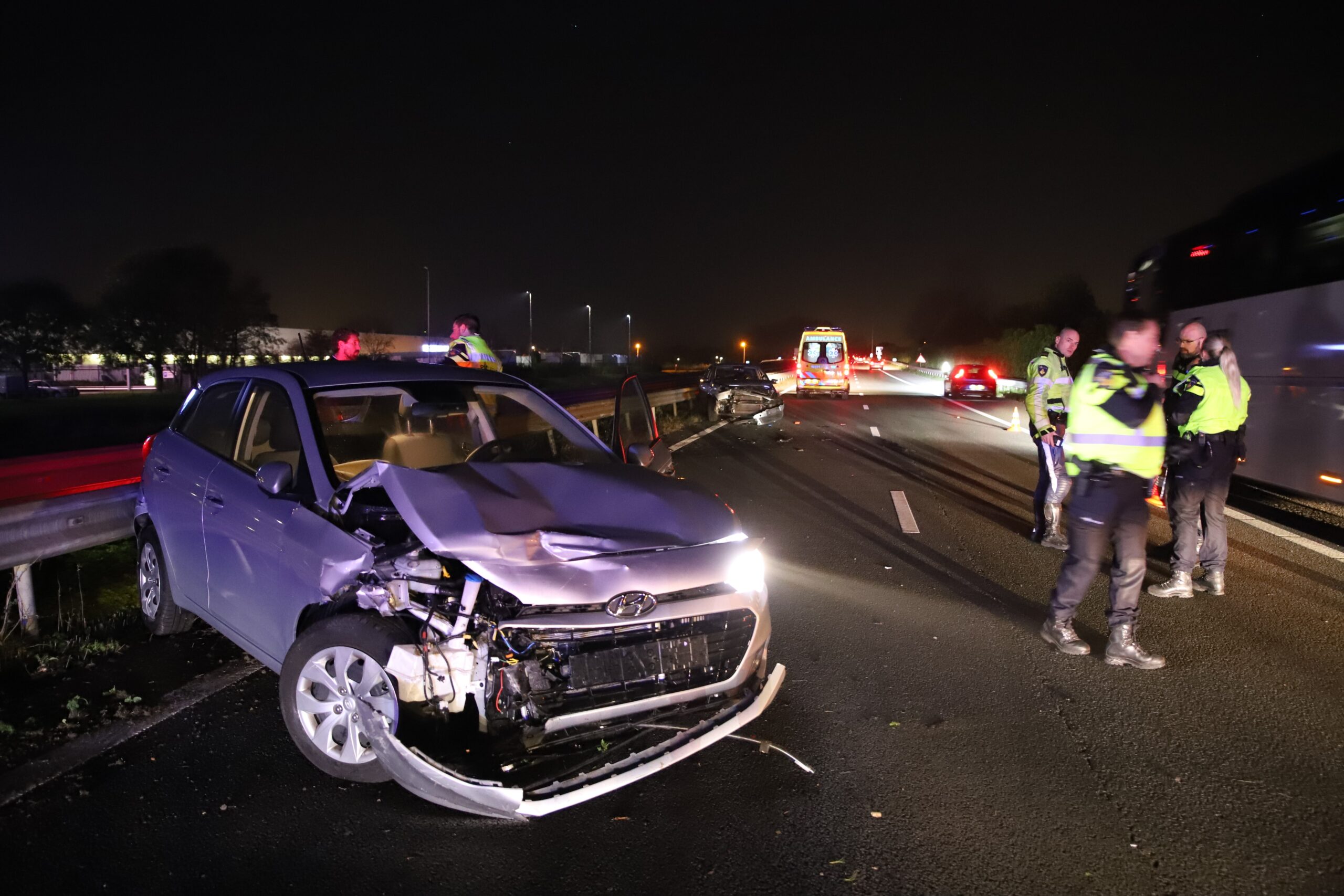 Één slachtoffer in de ambulance. Voor de afhandeling van de aanrijding werden beide rijstroken enige tijd afgesloten. Het verkeer werd via de vluchtstrook omgeleid.