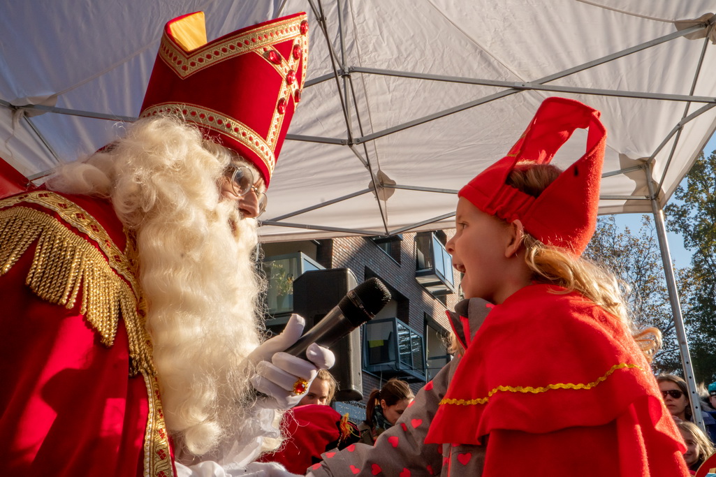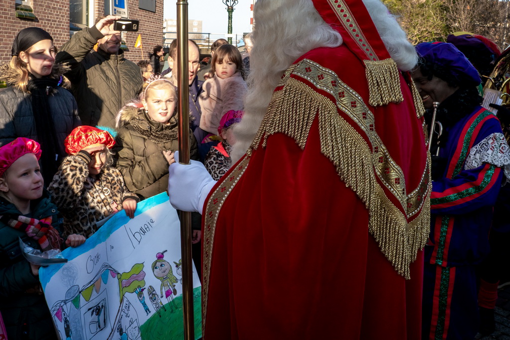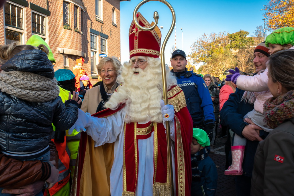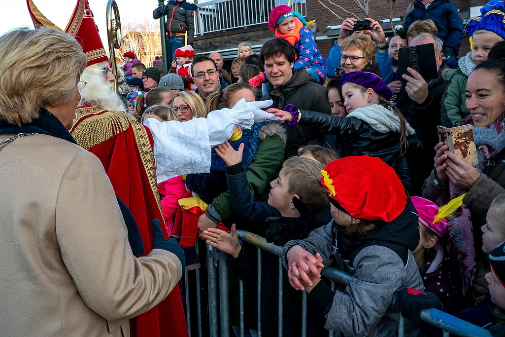 Sinterklaas kwam zaterdagmorgen met een boot vol pieten en cadeaus aan in Leiderdorp. Traditiegetrouw legde de stoomboot aan bij de Ockenrode, waar de goedheiligman en zijn uitsluitend zwarte hulpjes werden ontvangen door burgemeester Laila Driessen en de rest van het dorp. Zo leek het althans, want het publiek was massaal toegestroomd.
