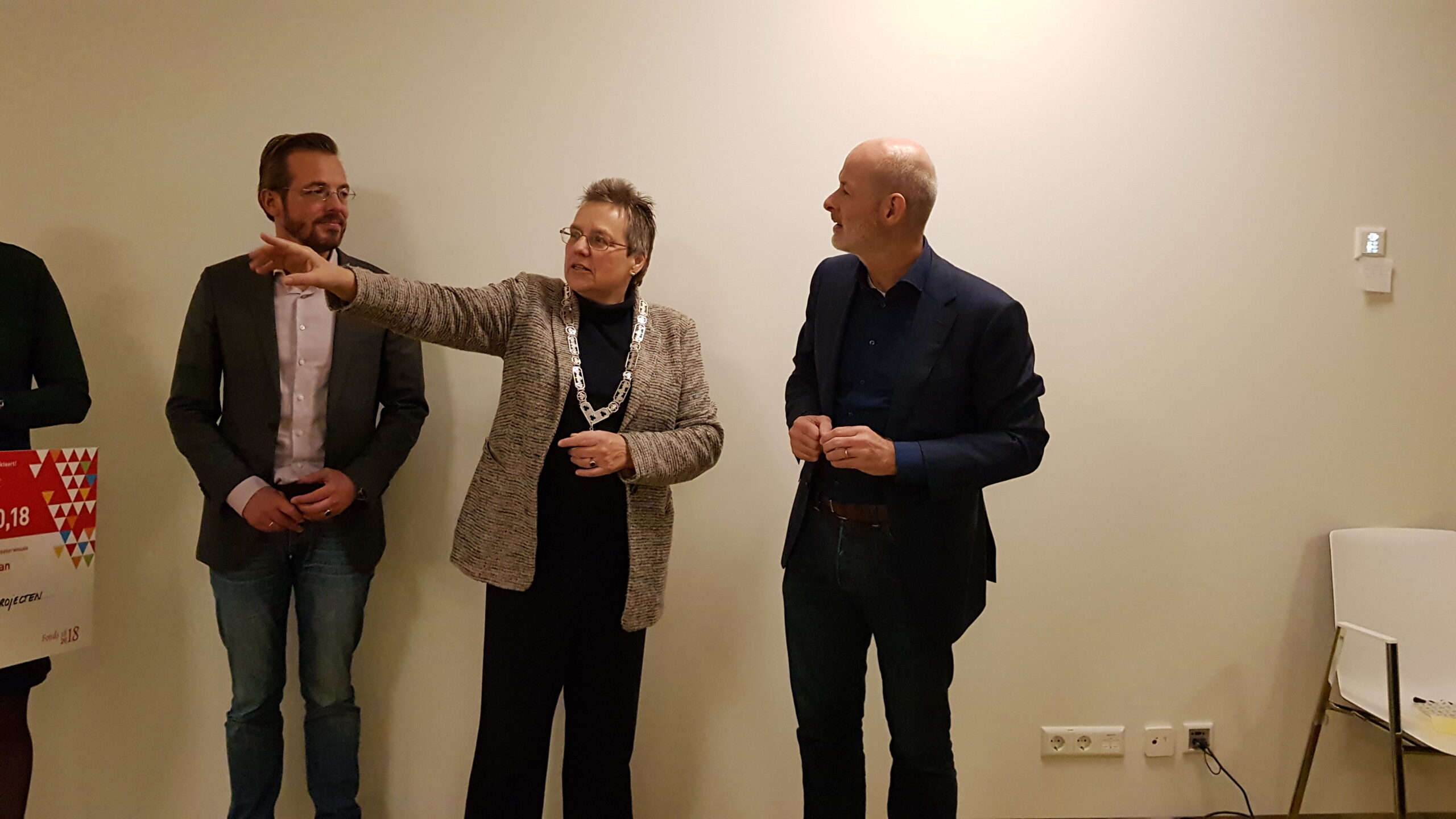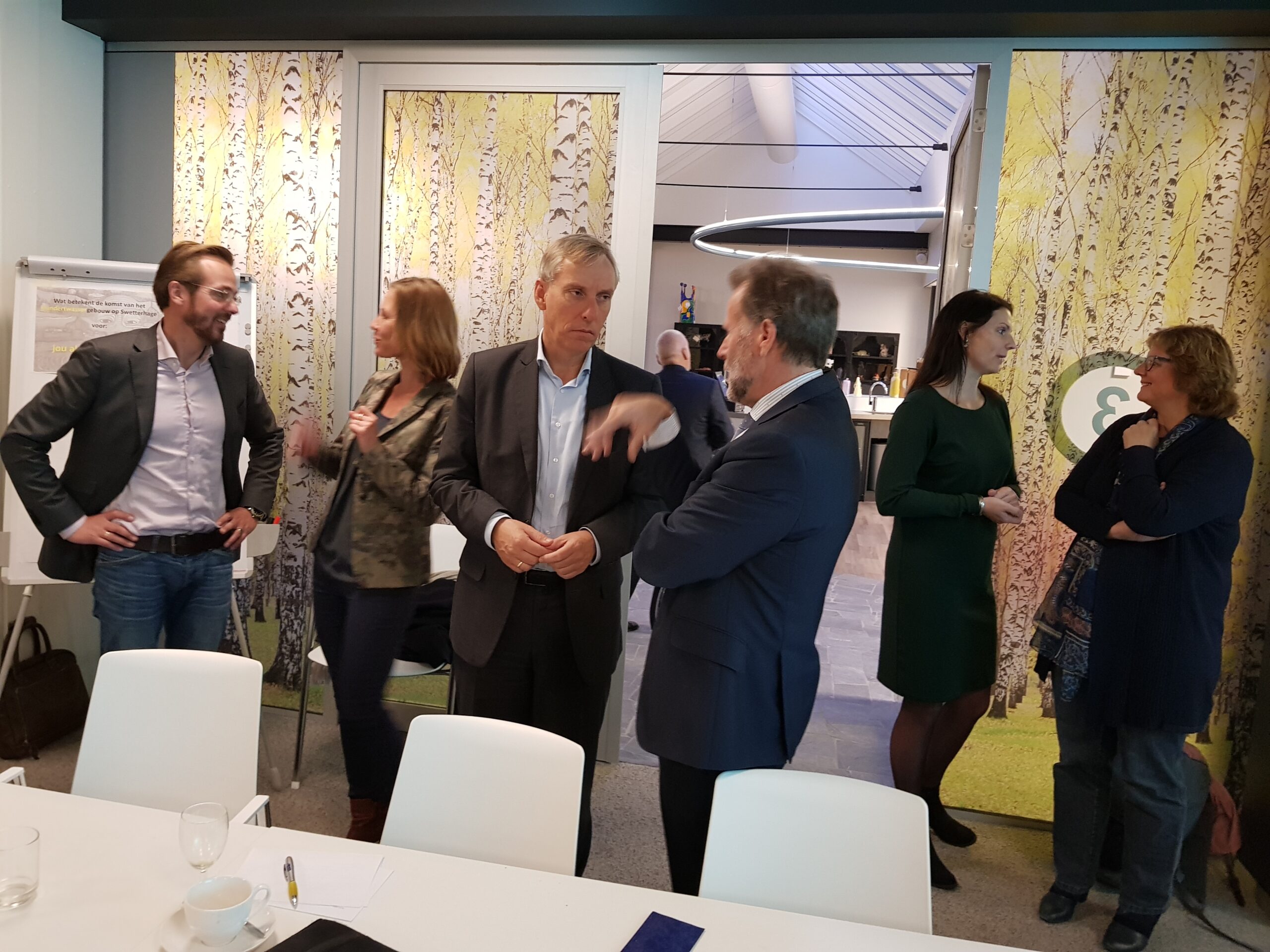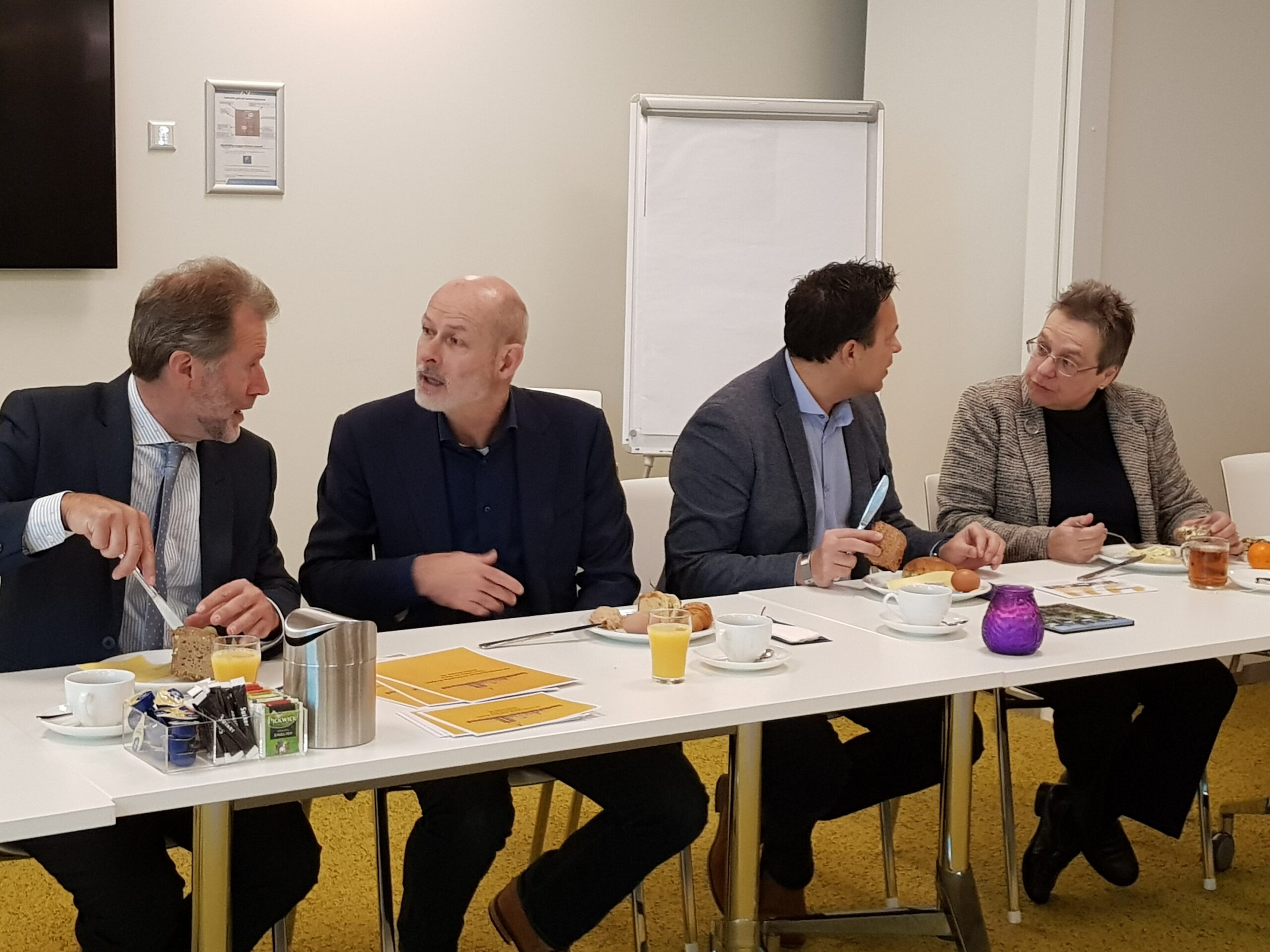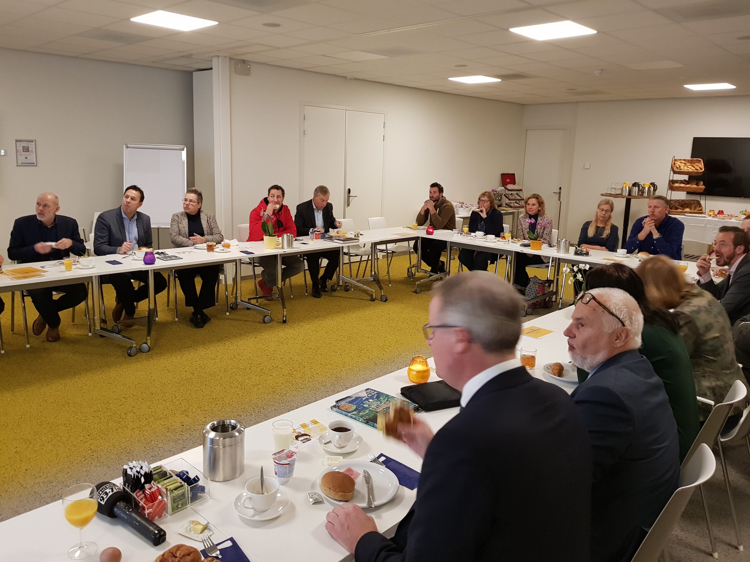 Chris de Waard ging langs bij het ontbijt en sprak met aanwezige ondernemers, burgemeester Bloemen, George de Water van de Raad van Bestuur van Gemiva, directeur Ten Bokkel Huinink van Fonds 1818, wethouder Ton de Gans en projectleider Sandra Larsen.