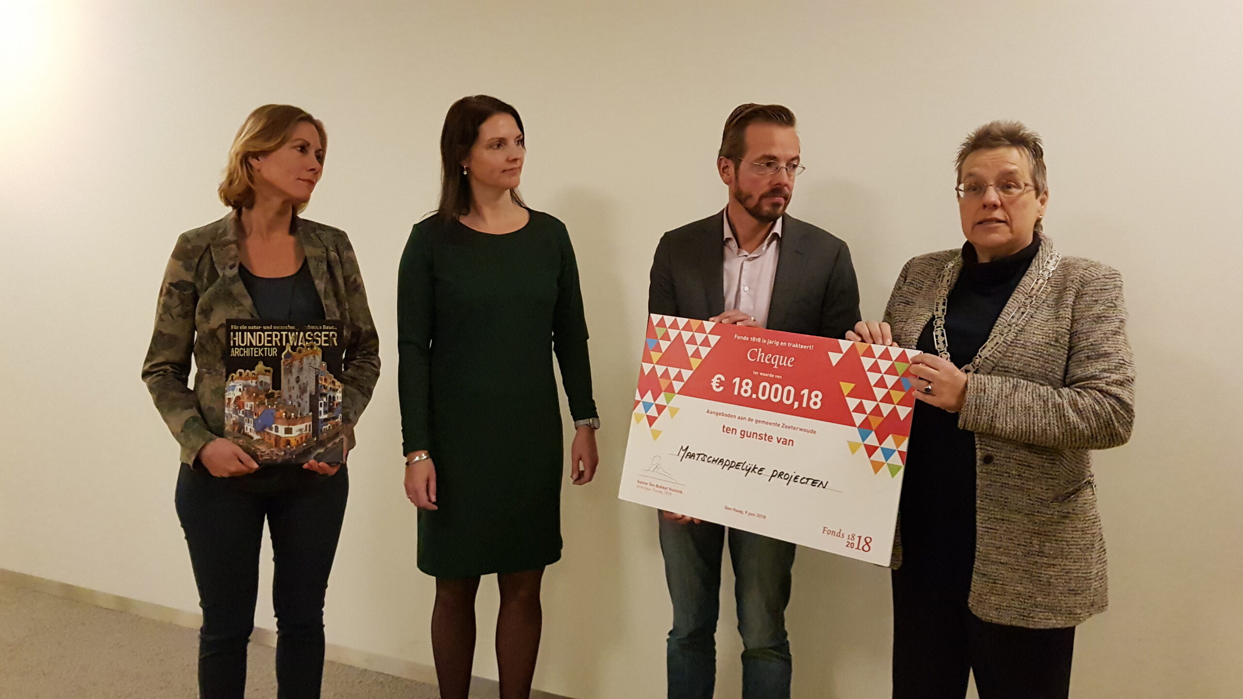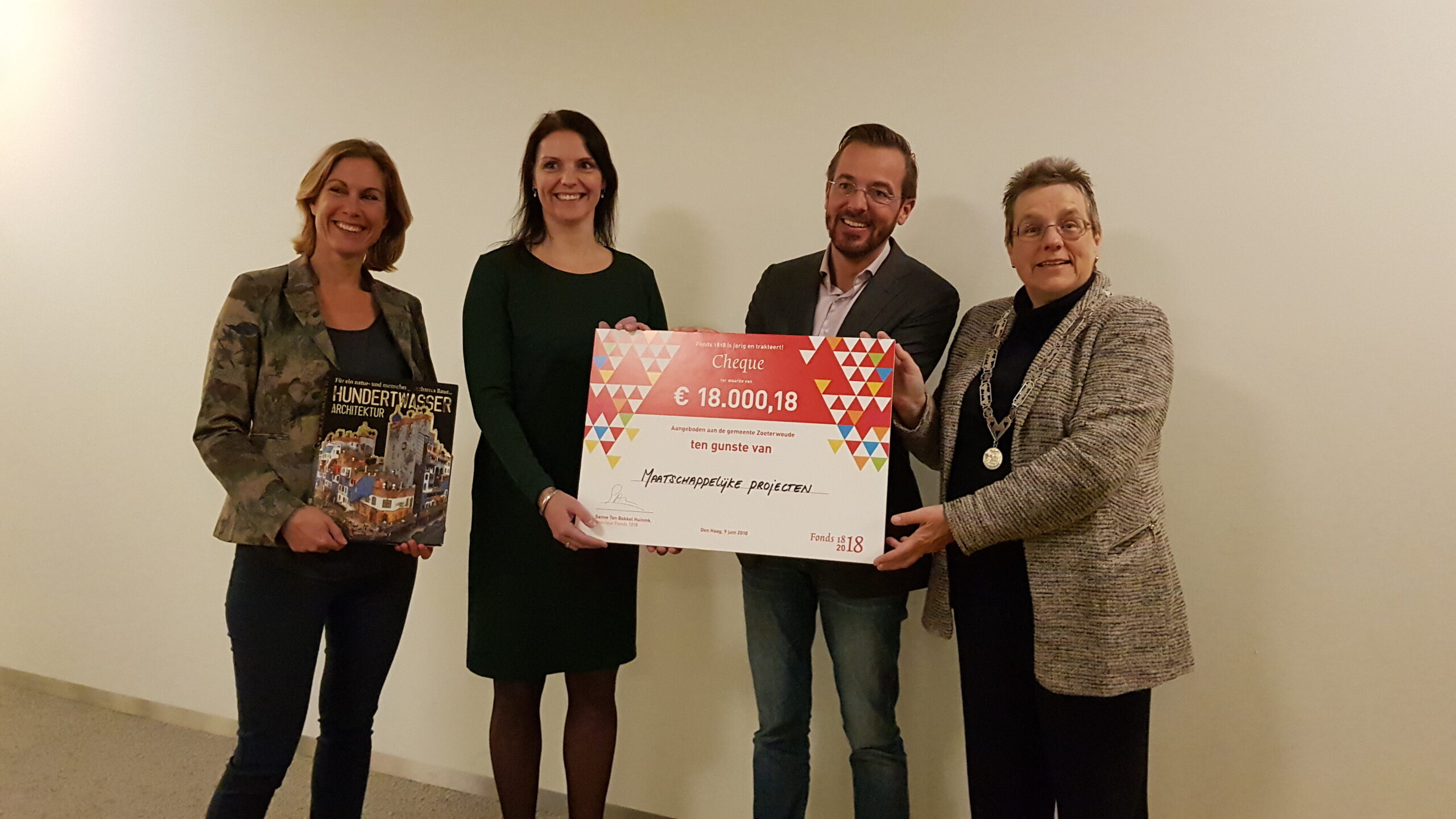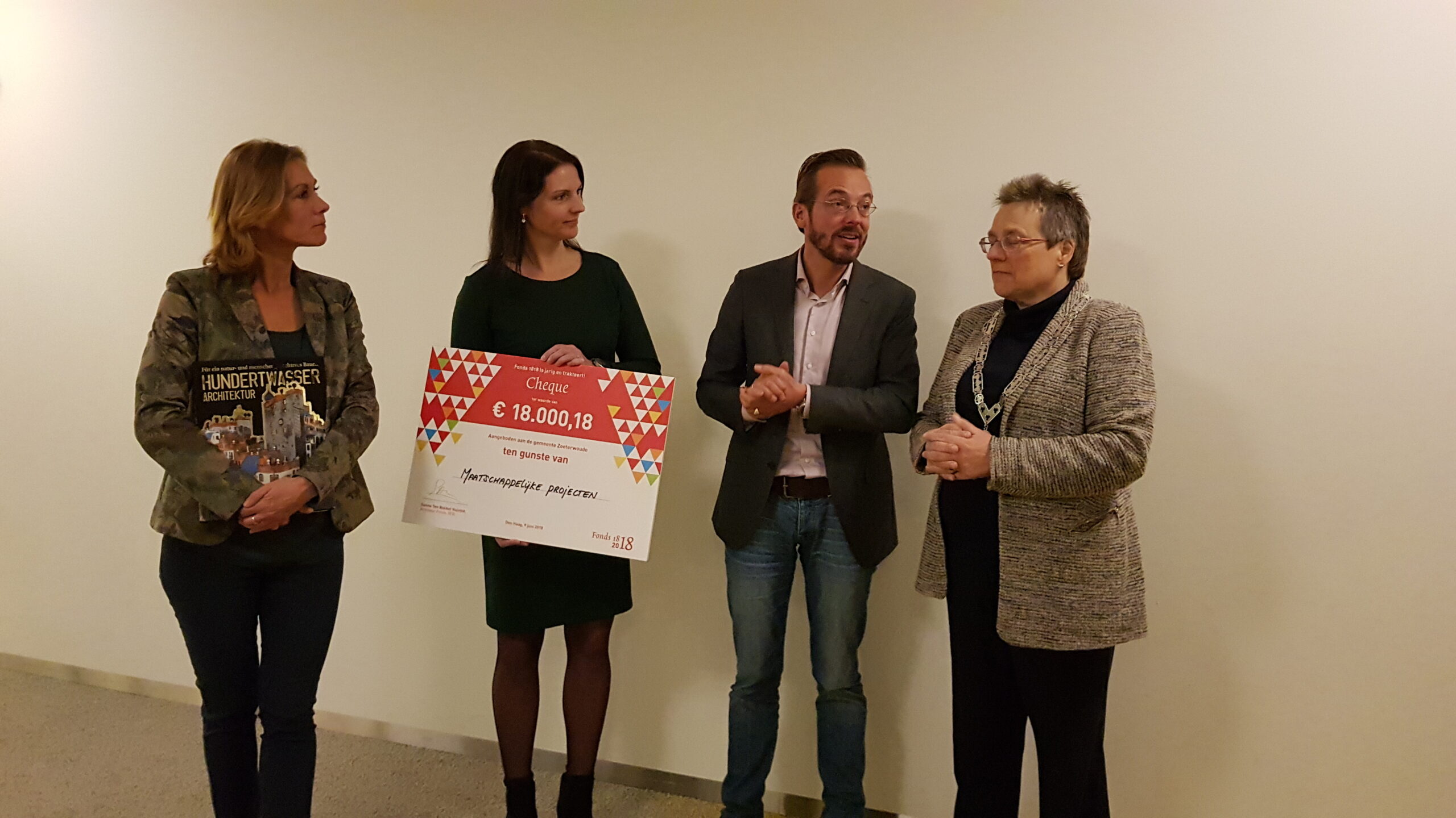 Tijdens een ondernemersontbijt bij de Gemiva-SVG-groep locatie Swetterhage in Zoeterwoude heeft burgemeester Liesbeth Bloemen een cheque uitgereikt van 18.000,18 euro ten behoeve van het Hundertwassergebouw dat de instelling voor mensen met een verstandelijke beperking wil realiseren als nieuw dagbestedings-gebouw. Het geld kreeg de gemeente van Fonds 1818 dat daarmee het tweehonderdjarig bestaan vierde.
