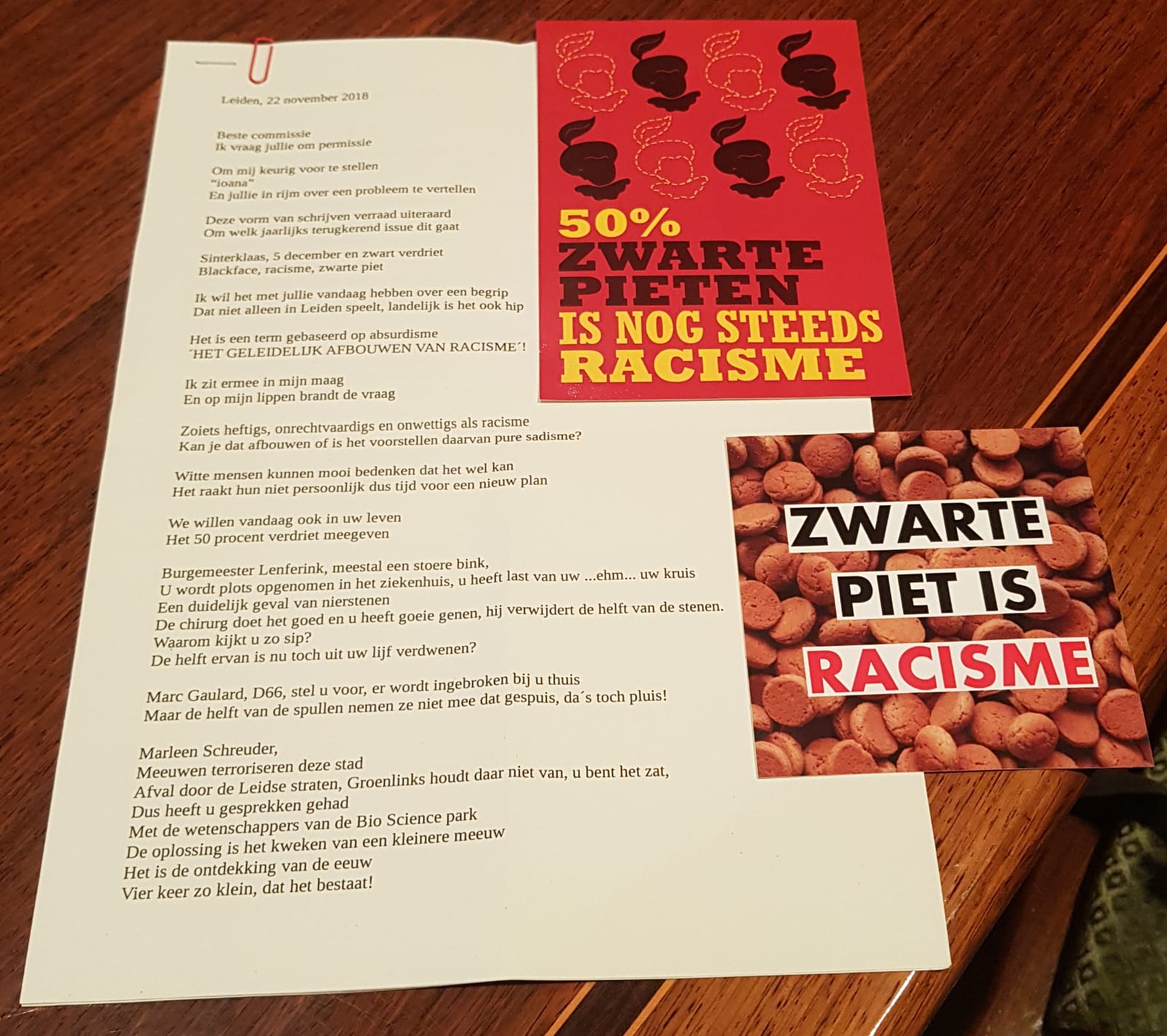 De discussie over zwarte piet is dus vooral in de stad gevoerd en ook aan het besluit om in twee stappen afscheid te nemen van het zwarte hulpje van de sint, kwam de politiek niet te pas. De organisatie ‘No More Blackface Leiden’ is blij dat zwarte piet volgend jaar uit Leiden verdwijnt, maar wil eigenlijk ook nog wel een uitspraak van de Leidse gemeenteraad over het in hun ogen racistische fenomeen. Woordvoerster ‘Ioana’ kwam inspreken op rijm en noemde daarbij het geleidelijk afbouwen van racisme ‘absurdistisch’.