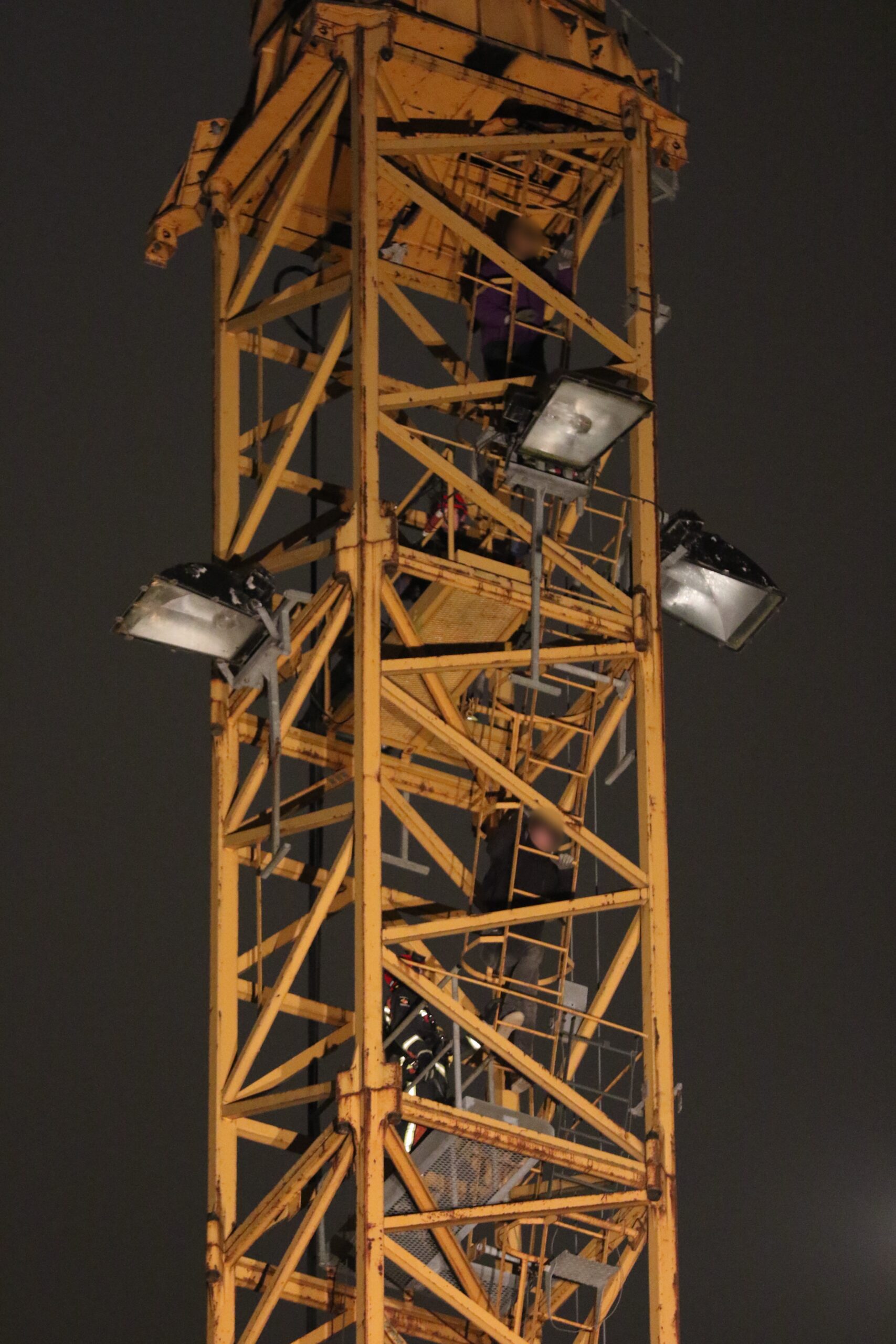 Rond 1.25 uur begonnen de hulpdiensten aan de eerste reddingspoging. Die mislukte omdat de ladderwagen van de brandweer te kort bleek te zijn. Een tweede poging was wel succesvol. Het duo is meegenomen naar het bureau.