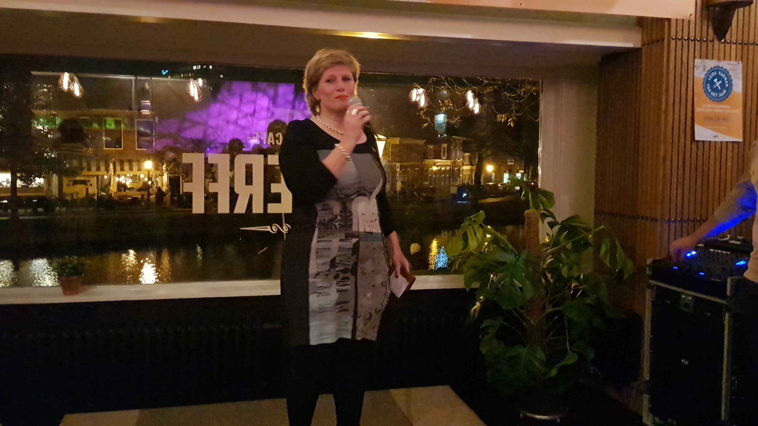 Chris de Waard sprak bij de bekendmaking van de winnaars achtereenvolgens met slager Piet van der Vooren, wethouder Yvonne van Delft van economische zaken, kapper Eric die tweede werd en met organisator Mels Hartman van de Horeca Groep uit Leiden.