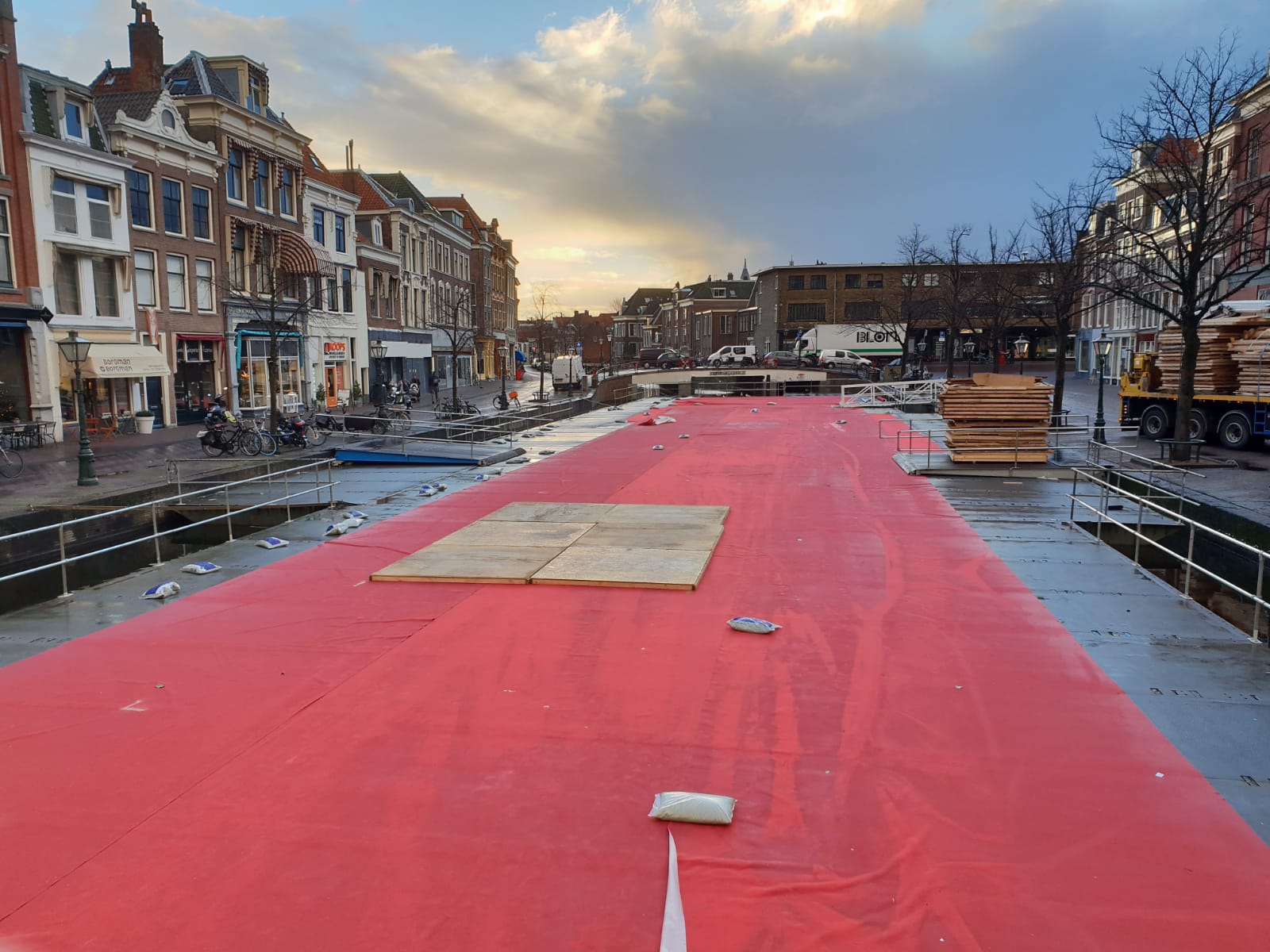 Nadat zaterdag de drijvende ijsbaan op Nieuwe Rijn al open ging, wordt deze week ook hard gewerkt aan de opbouw van de aangrenzende drijvende kerstmarkt. Die opent aanstaande vrijdag en blijft tot en met de kerst open.