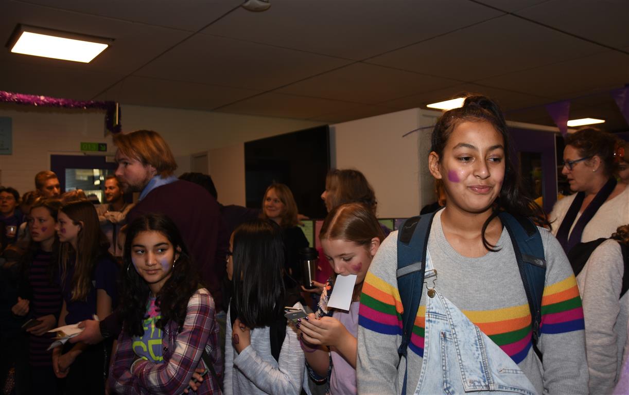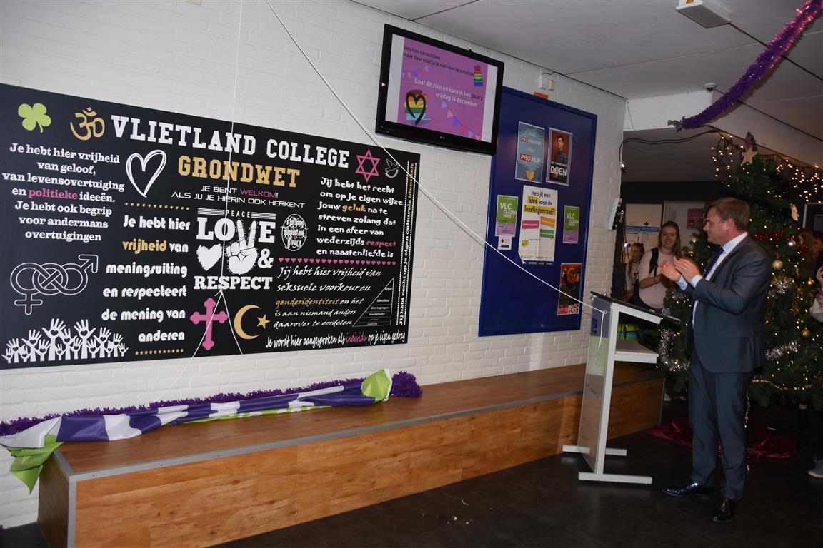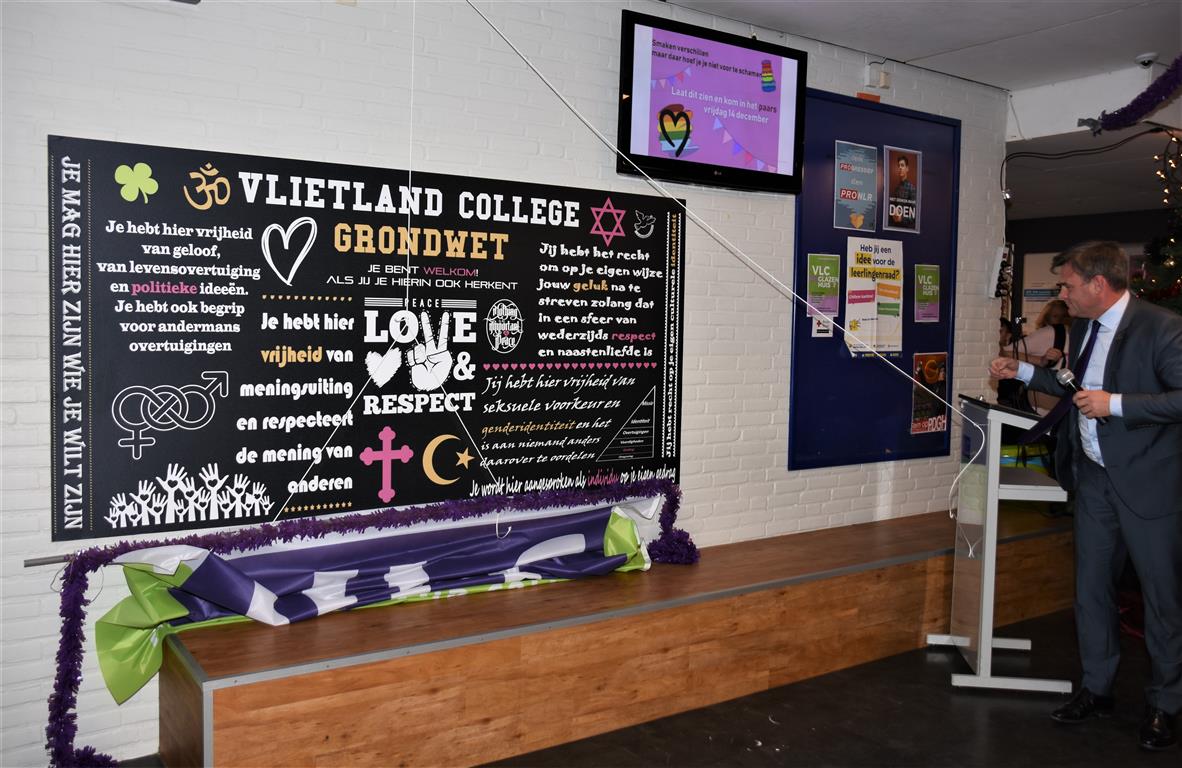 Aan het slot van de pauze onthulde de wethouder in de hal de ‘Grondwet’ van het Vlietland College. Op dit bord staan de gedragsregels waar iedereen op school zich aan dient te houden.