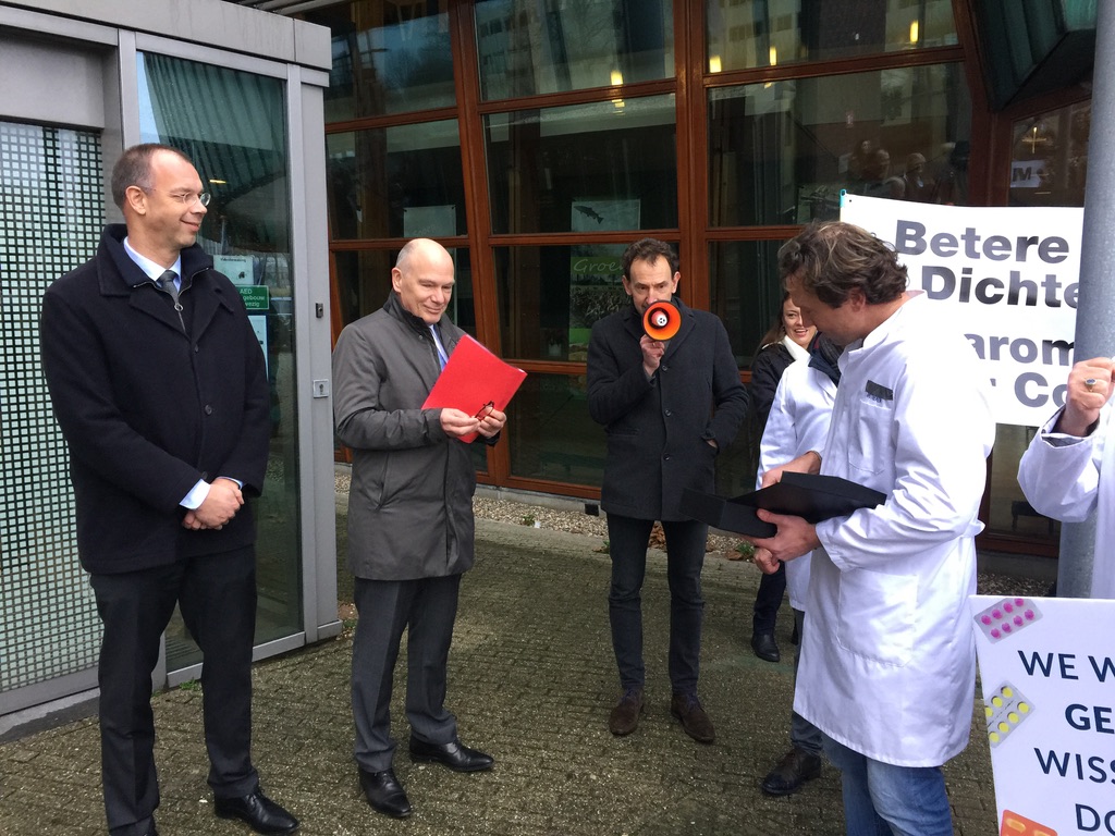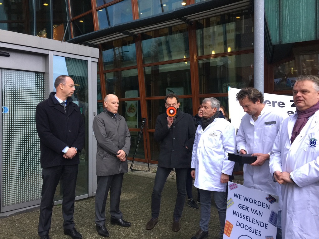 Bij de ingang staan de voorzitter van de Raad van Bestuur Ton van Houten en Divisiemanager Zorg Jan Kroes van Zorg en Zekerheid klaar om de petitie en de bijbehorende award in ontvangst te nemen en een kleine vertegenwoordiging uit te nodigen met elkaar in gesprek te gaan.