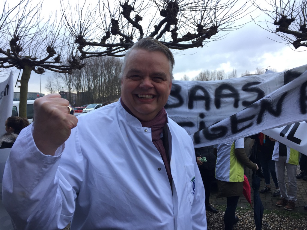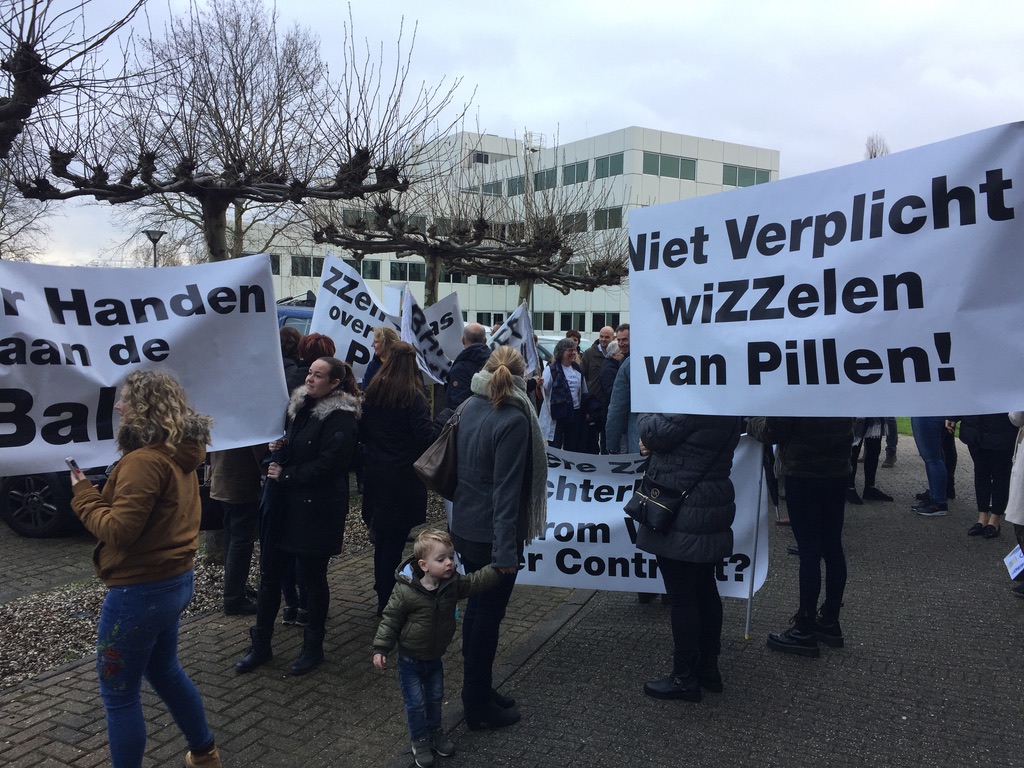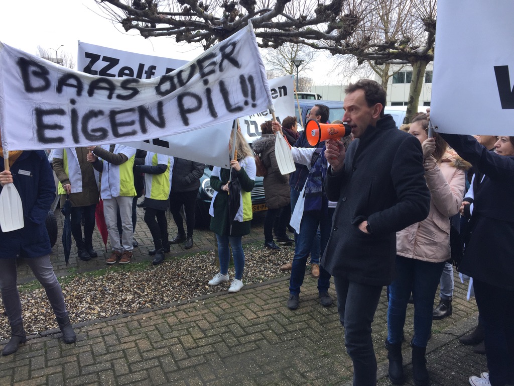 Apothekers op de barricade zijn geen alledaags verschijnsel, maar vandaag staan er zo’n vijfitg boze apothekers en medewerkers in witte jassen bij het hoofdkantoor van Zorg en Zekerheid. Ze zijn het zzat, staat er op de meegebrachte spandoeken. Nog een beetje onwennig wordt er gescandeerd: Geen zorg, geen zekerheid.