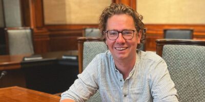 Verslaggever Gerry van Bakel in gesprek met apotheker Sloothaak.