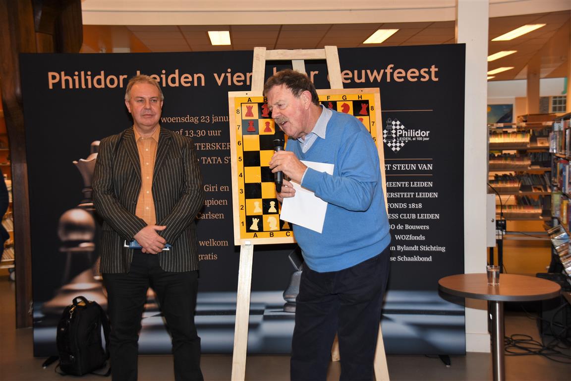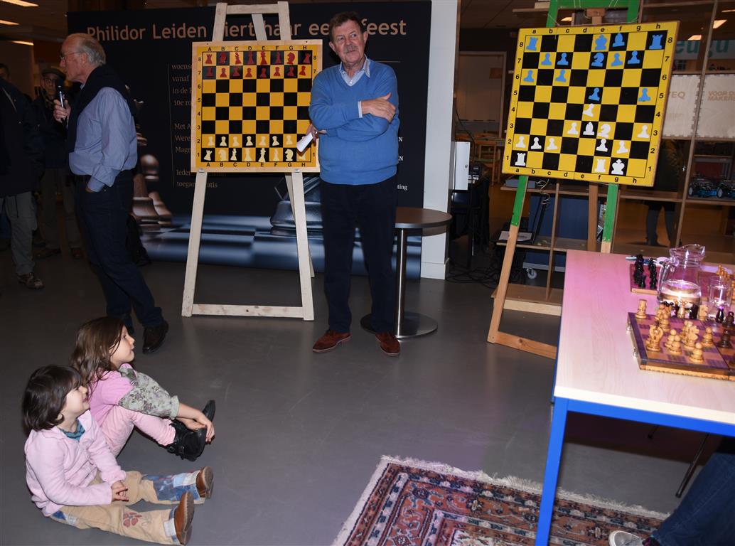 Voorzitter Gerard Visser van de honderdjarige schaakclub is zaterdagmiddag zeer in zijn nopjes met de aandacht van het publiek voor zijn club Philidor. Een vijftigtal mensen zijn naar de openbare bibliotheek van BplusC in de Nieuwstraat gekomen om de grootmeester aan het werk te zien. Daarnaast exposeert kunstcollectief Leidsche Mondialen met werken die door het schaakspel zijn geinspireerd. Het komend jaar staan er nog meer mooie evenementen op het programma om het jubileum luister bij te zetten. Met als hoogtepunt de komst van Tata Steel schaaktoernooi naar de Pieterskerk op woensdag 23 januari.