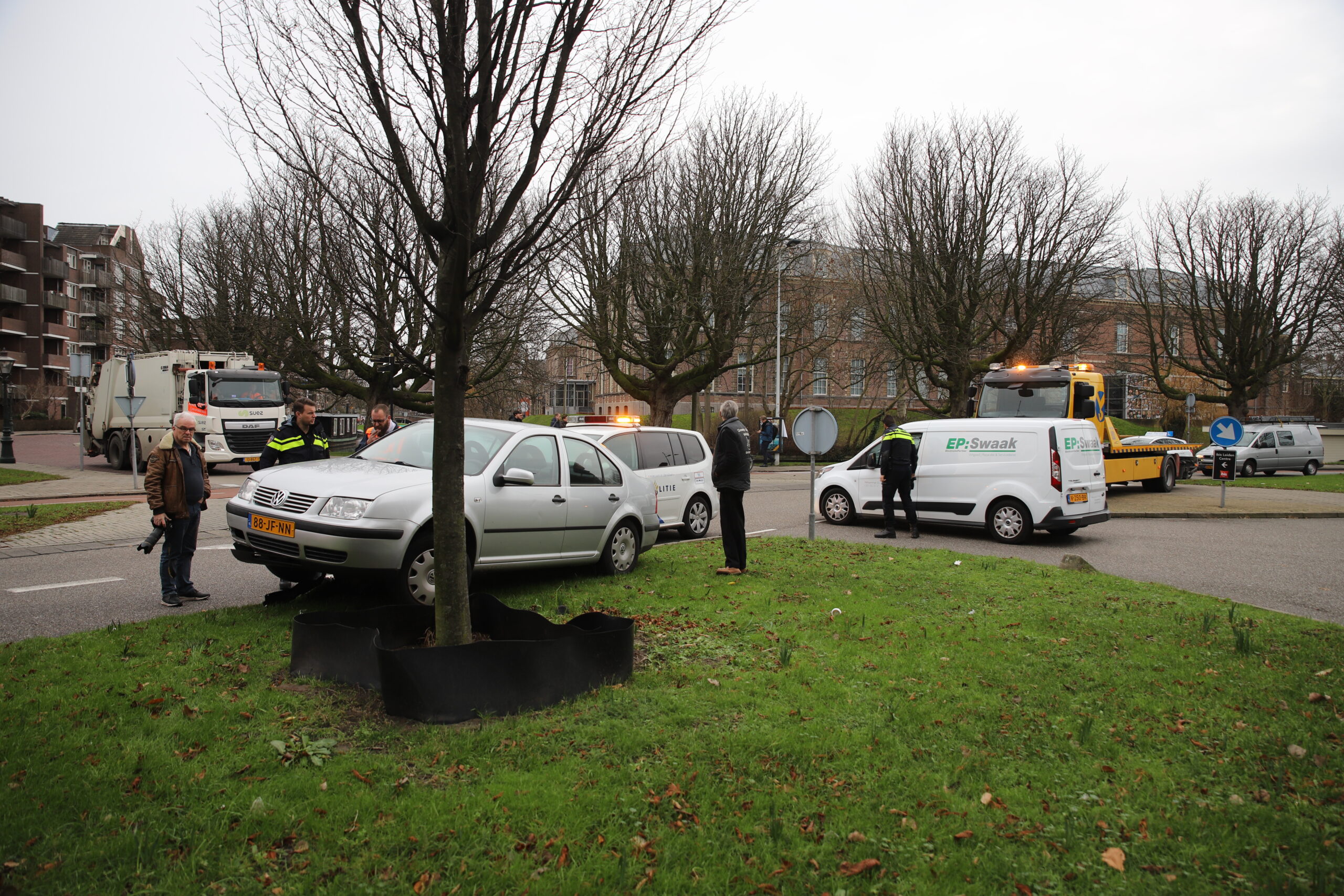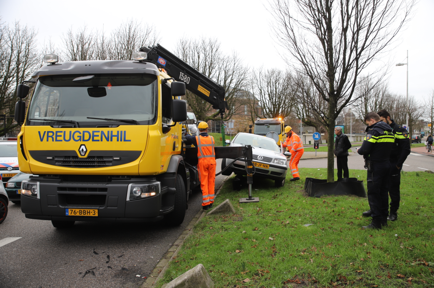 Een personenauto is vanmorgen op het Stationsplein in Leiden op een stootblok terecht gekomen. Dat gebeurde na een uitwijkactie voor een andere auto, die vervolgens is doorgereden. Het voertuig is met een kraan van het blok afgehaald.