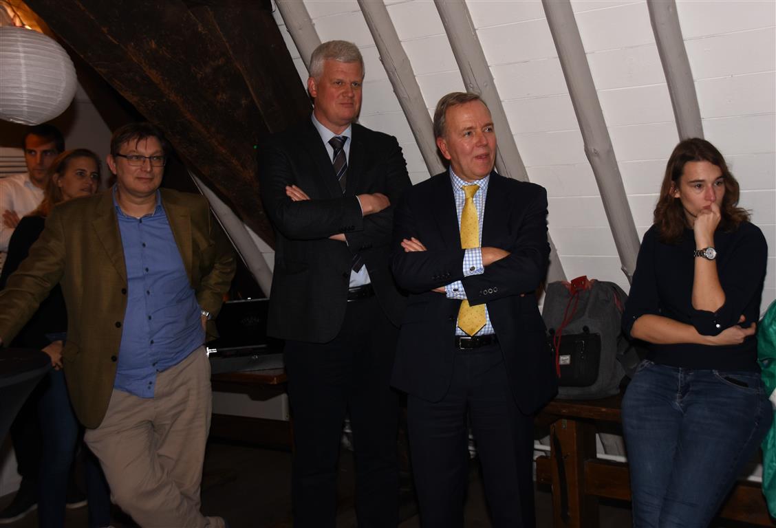 Chris de waard in gesprek met CDA-fractievoorzitter Joost Bleijie en schaatshal-bestuurslid Willem van Vliet.