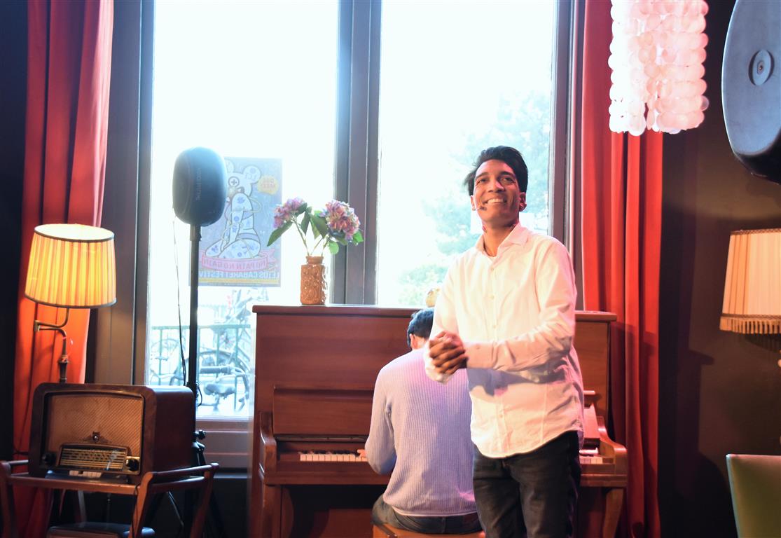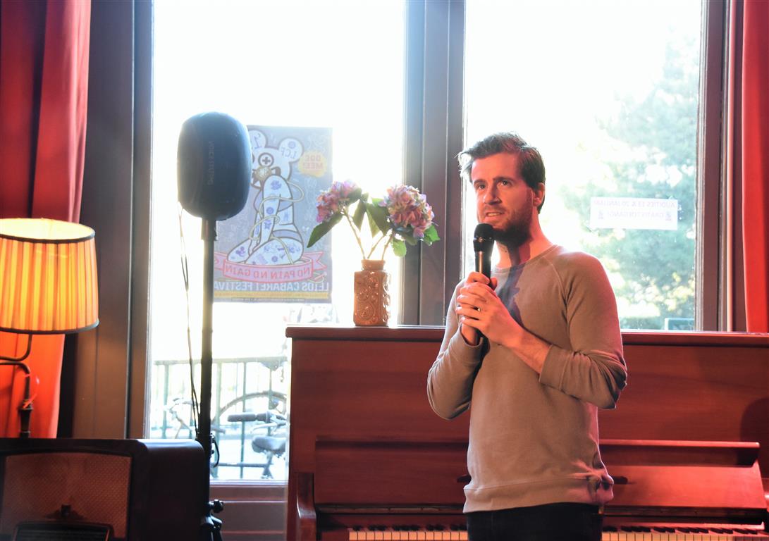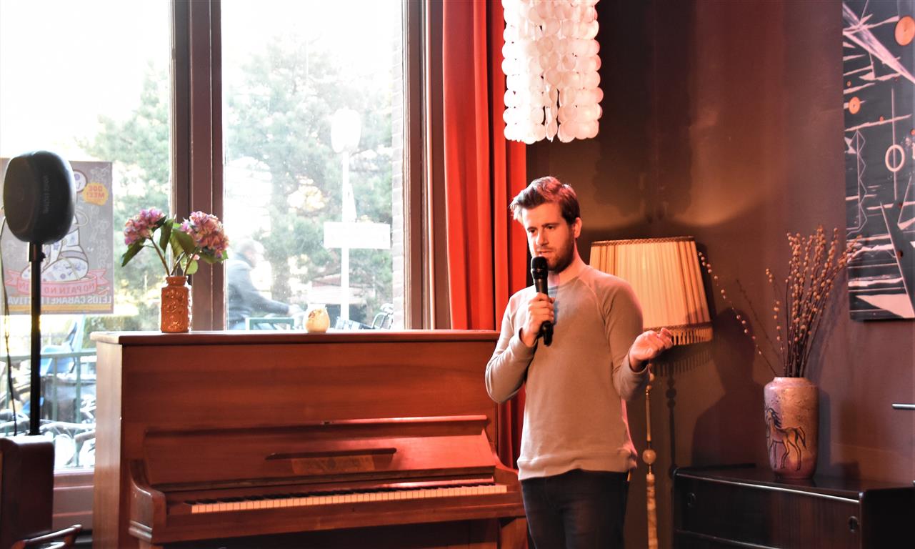 Zelfspot en relativering: belangrijke begrippen voor cabaretiers, zo bleek. Da’s de inhoud. Maar er bestaat ook zoiets als podiumpersoonlijkheid: hoe kom je over, ben je te verstaan, communiceer je met je publiek. Bram Ryde uit Gent heeft best grappige momenten. Zo heeft hij “een meerderwaardigheidscomplex en als hij op vakantie is mist hij zichzelf het meest”. ‘Gevoeligheid’ – “ik ben een gevoelig mens” – moet hier de rode draad zijn. Maar die wordt aan barrels geschoten door een soms onverstaanbaar luide stem, waardoor (vast) de pointe te vaak verloren gaat. Het kan best zijn dat ‘het Belgisch’ zich hier wreekt.