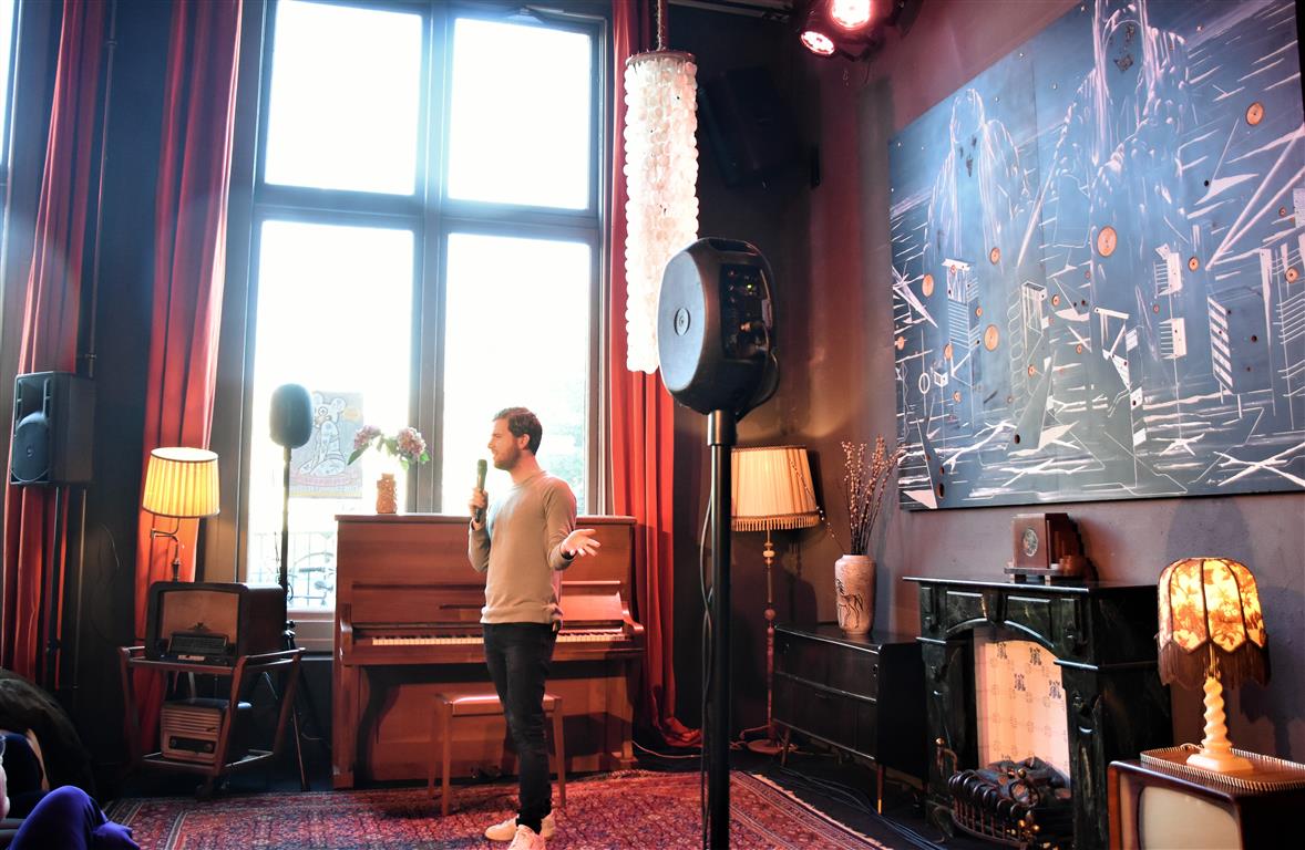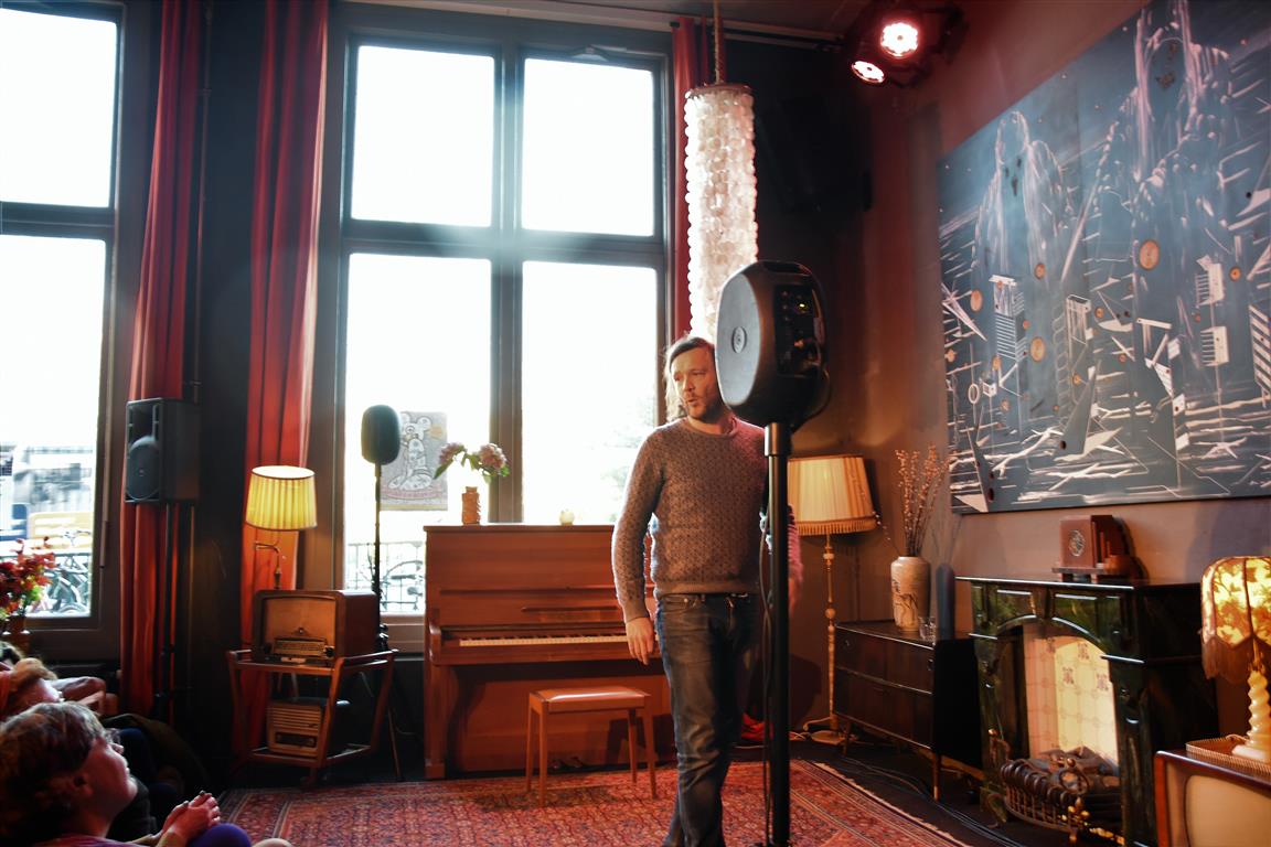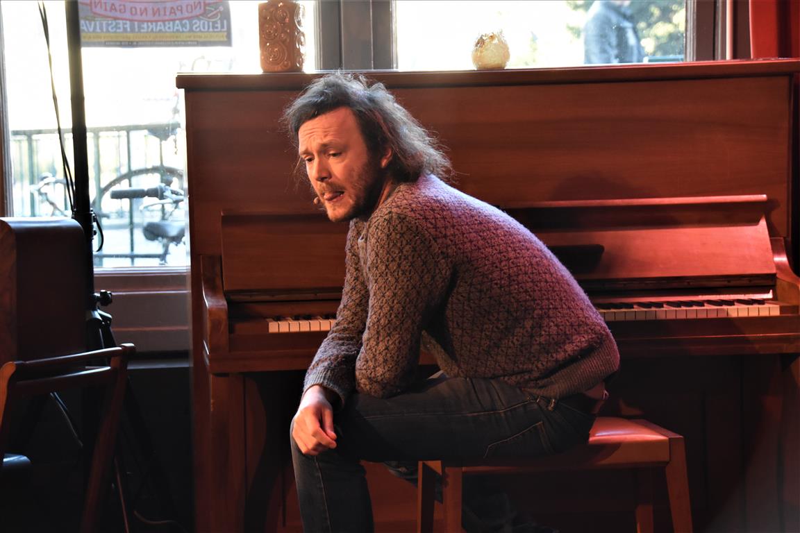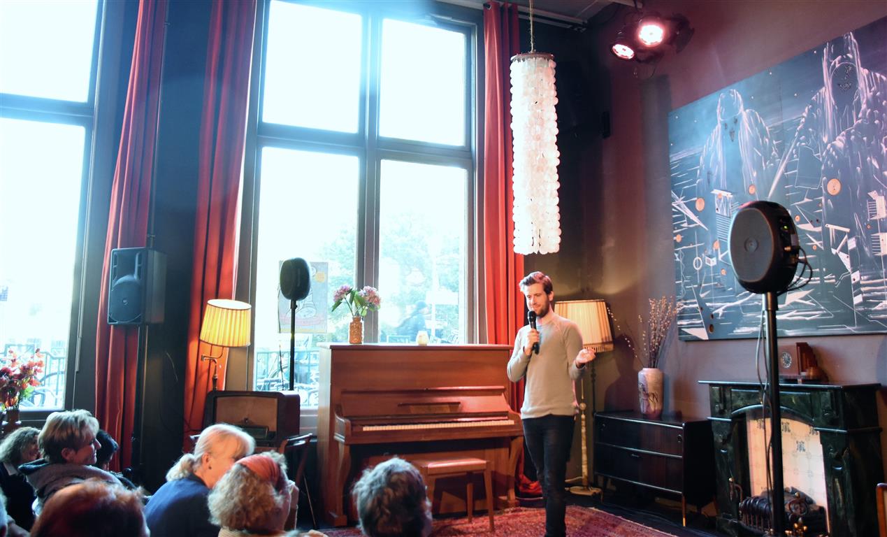 Senne Gins had de enigszins ondankbare positie de laatste te zijn (alhoewel, Bram Ryde waarschijnlijk de taaiste had door te moeten áftrappen). Ook hij is één van de vijf kanshebbers (mijn inschatting) voor een volgende ronde. Er zijn niet veel mensen die “besluiten wonderkind te worden”. Jammer genoeg is hij dan al tien, en in de jaren erna is het gezin waarin hij opgroeit zó druk (met exotische vakanties, wintersport en wat dies meer zij) dat-i eigenlijk geen tijd heeft om te ontwikkelen “voor een jonge componist met ambities is dat kansarmoede”. Toch komt hij op z’n pootjes terecht en heeft nu zelf “twee wonderkinderen”, zijn dochters. Ook een bron van inspiratie, als hij het verschil niet weet tussen broekkousen (maillots) en leggings en beide dametjes naar school stuurt in broekkousen… zonder rokje erboven. Ellende aan het eind van de schooldag. Maar dat geldt ook voor de handige doe-het-zelver die hij (niet) is en die de nieuwe wasmachine aansluit. Volgens de, blijkbaar opwindende, verkoopster moet hij daarvoor ‘muilvocht’ gebruiken “Dat ligt niet aan jullie. Ik begreep het ook niet”. Van de ene opwinding komen we uiteindelijk in de andere om te eindigen in een relaas over de sex-afspeellijst op Spotify. Laten we het erop houden dat Gins liggend op z’n rug pianospelend tot de sterkere toneelbeelden van deze zondag hoort.