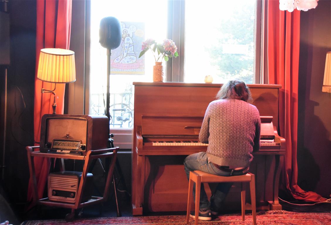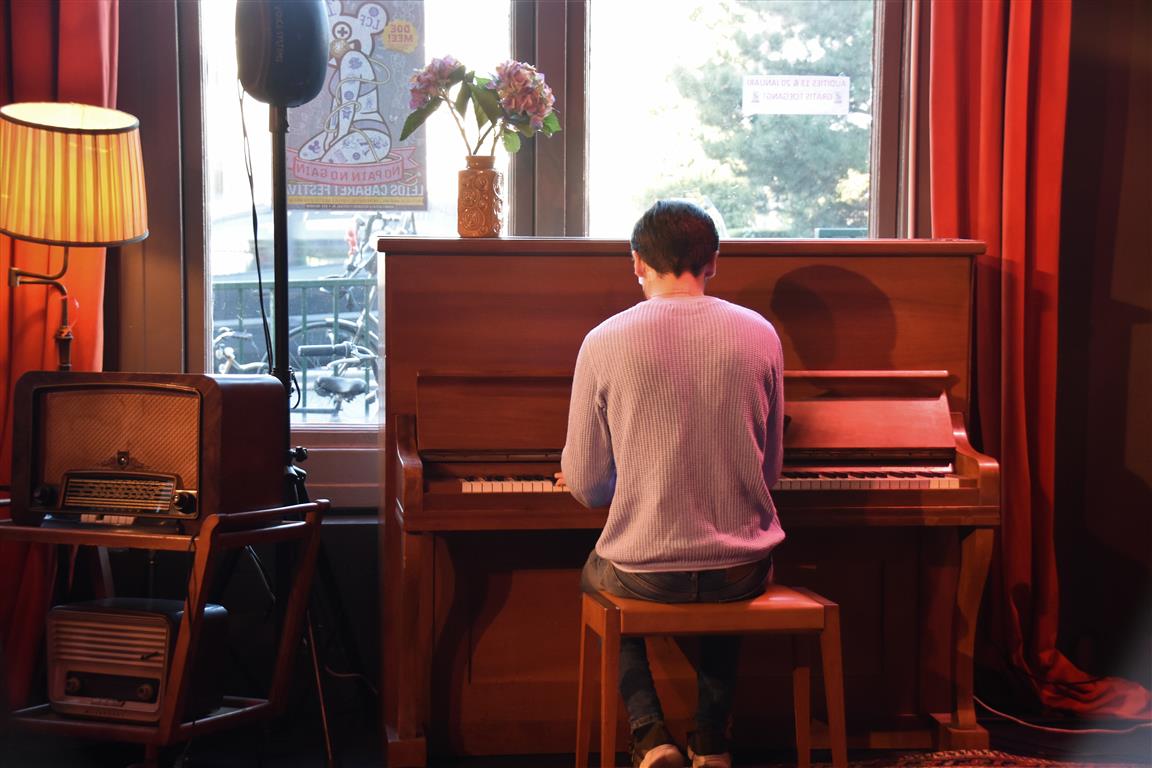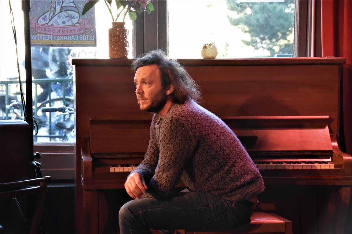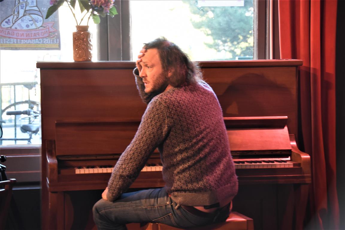 Senne Gins had de enigszins ondankbare positie de laatste te zijn (alhoewel, Bram Ryde waarschijnlijk de taaiste had door te moeten áftrappen). Ook hij is één van de vijf kanshebbers (mijn inschatting) voor een volgende ronde. Er zijn niet veel mensen die “besluiten wonderkind te worden”. Jammer genoeg is hij dan al tien, en in de jaren erna is het gezin waarin hij opgroeit zó druk (met exotische vakanties, wintersport en wat dies meer zij) dat-i eigenlijk geen tijd heeft om te ontwikkelen “voor een jonge componist met ambities is dat kansarmoede”. Toch komt hij op z’n pootjes terecht en heeft nu zelf “twee wonderkinderen”, zijn dochters. Ook een bron van inspiratie, als hij het verschil niet weet tussen broekkousen (maillots) en leggings en beide dametjes naar school stuurt in broekkousen… zonder rokje erboven. Ellende aan het eind van de schooldag. Maar dat geldt ook voor de handige doe-het-zelver die hij (niet) is en die de nieuwe wasmachine aansluit. Volgens de, blijkbaar opwindende, verkoopster moet hij daarvoor ‘muilvocht’ gebruiken “Dat ligt niet aan jullie. Ik begreep het ook niet”. Van de ene opwinding komen we uiteindelijk in de andere om te eindigen in een relaas over de sex-afspeellijst op Spotify. Laten we het erop houden dat Gins liggend op z’n rug pianospelend tot de sterkere toneelbeelden van deze zondag hoort.