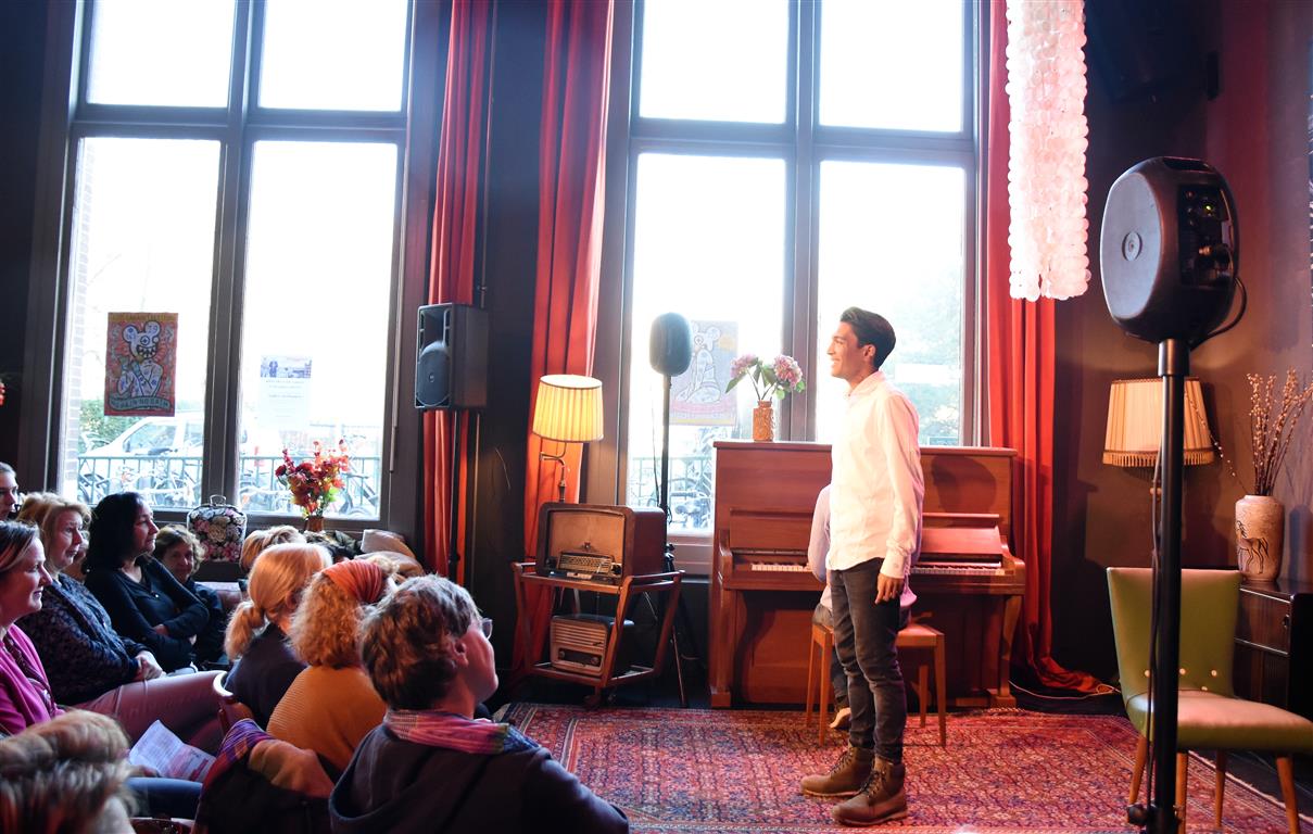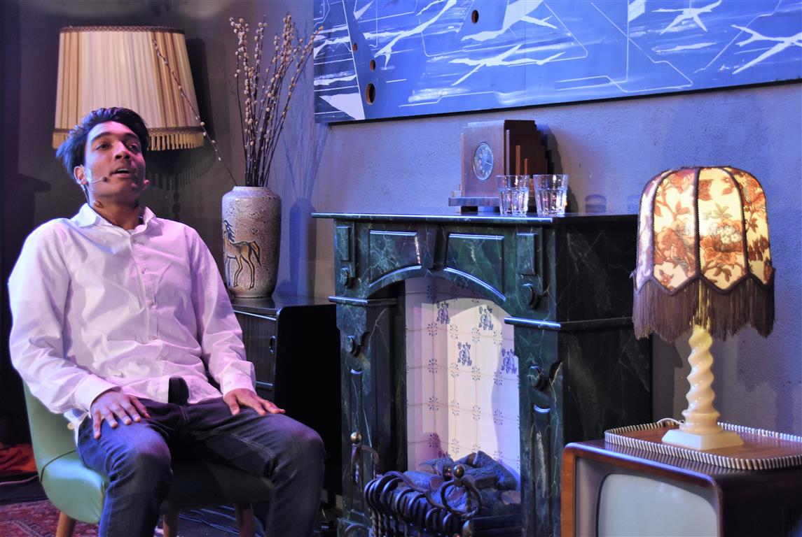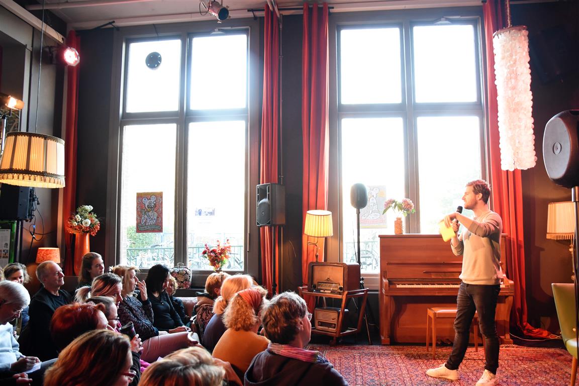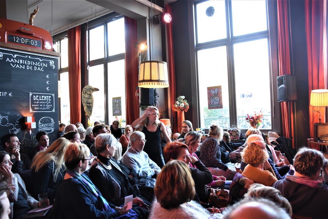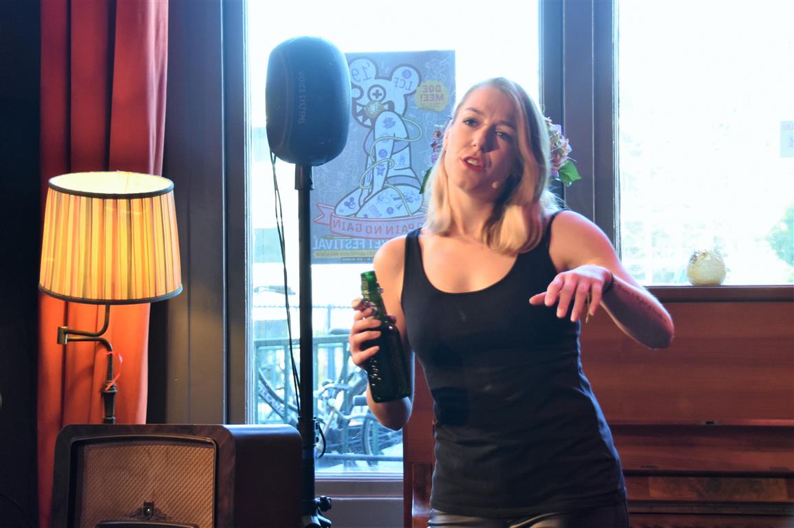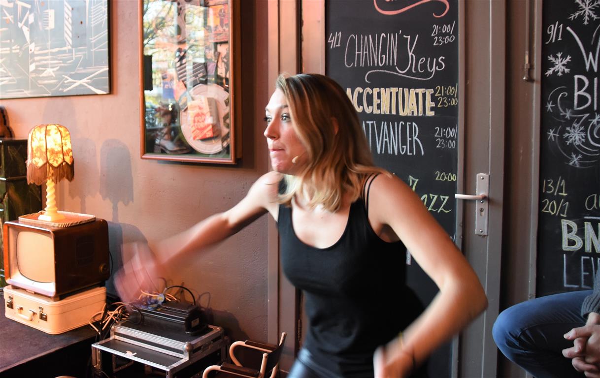 Dergelijke inkijkjes in andere levens, kreeg het publiek nog twee keer. Allereerst een lekker onverbloemde twintig minuten schets van een meisjes-vrouwenleven door Mariska van Houts. Ze past in een traditie, een beginnende, van vrouwen die nadrukkelijk (eindelijk) het perspectief en de beleving van de ene helft van de wereldbevolking overbrengen. Daarin past dat je, angstig geworden door “een écht enge film. Niet zo’n zaag-de-arm eraf”, over de trap en gang rent naar het wc en “dan je tieten moet vasthouden”. Om even aan de mannen in het publiek plastisch voor te doen dat dat anders pijn kan doen, ’s nachts, zonder ondersteunend materiaal. Of de wereld van een meisje dat ontwikkeling doormaakt naar ‘vrouw’, inclusief alle lichamelijke verschijnselen. “ego-vernietigend”, schetst Van Houts, met orthopedische elastiekjes, pukkels, pijnlijke borsten-groei “moest ik met m’n moeder mee om ‘een leuk topje’ te kopen. Waarom denk je dat meisjes op die leeftijd ruime vesten aan hebben??”. En haar ergernis over “het fotoverraad” op social media, waar alles mooi, stevig en pijnloos lijkt. Méér hiervan; vast goed voor ons allen om elkaar beter te snappen.
