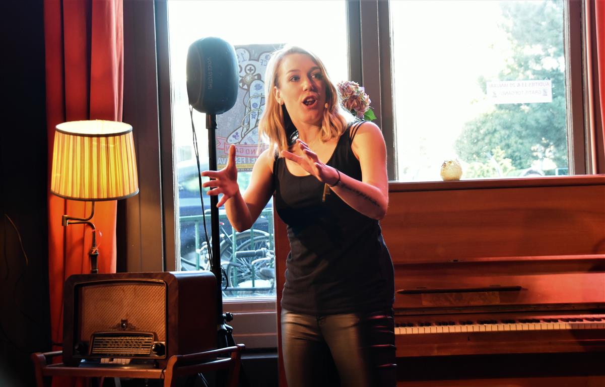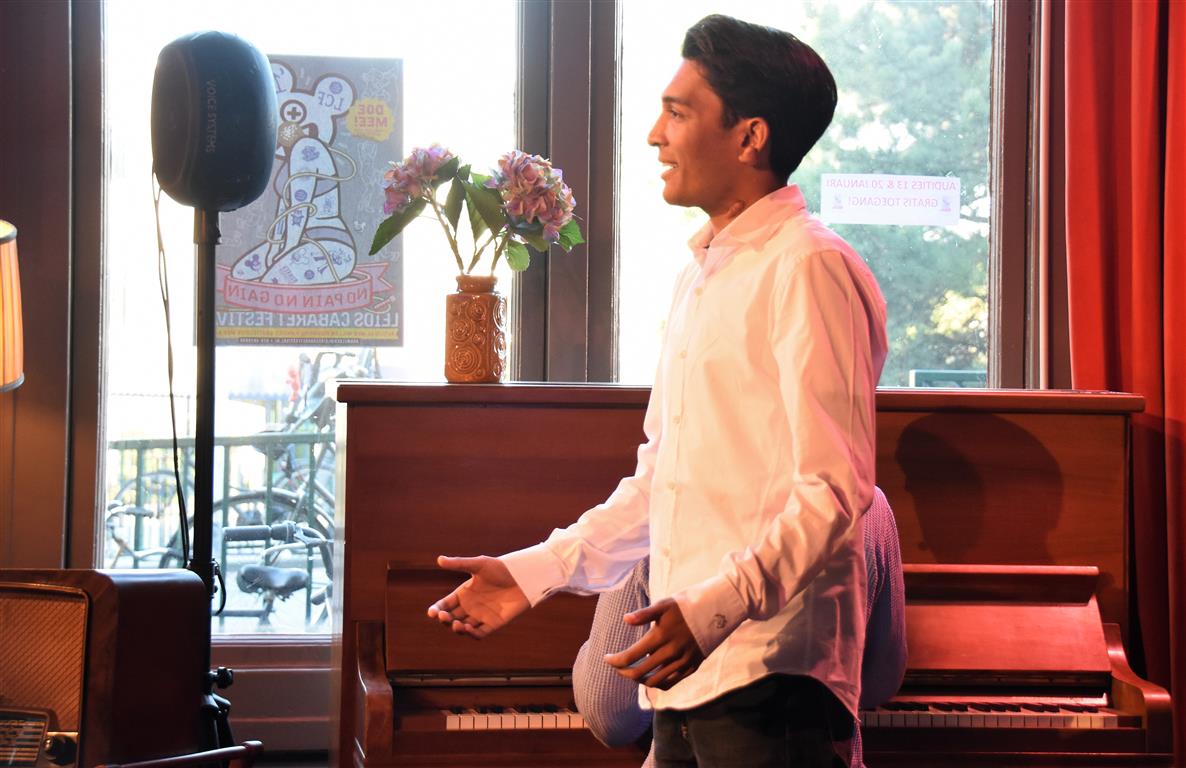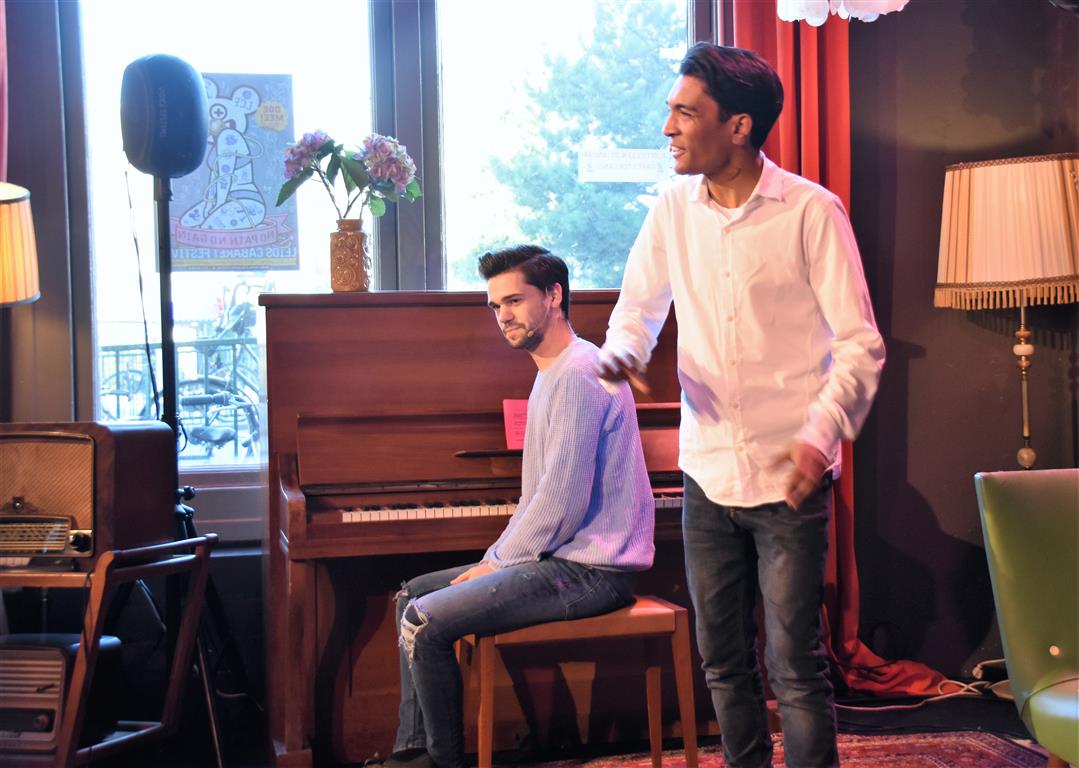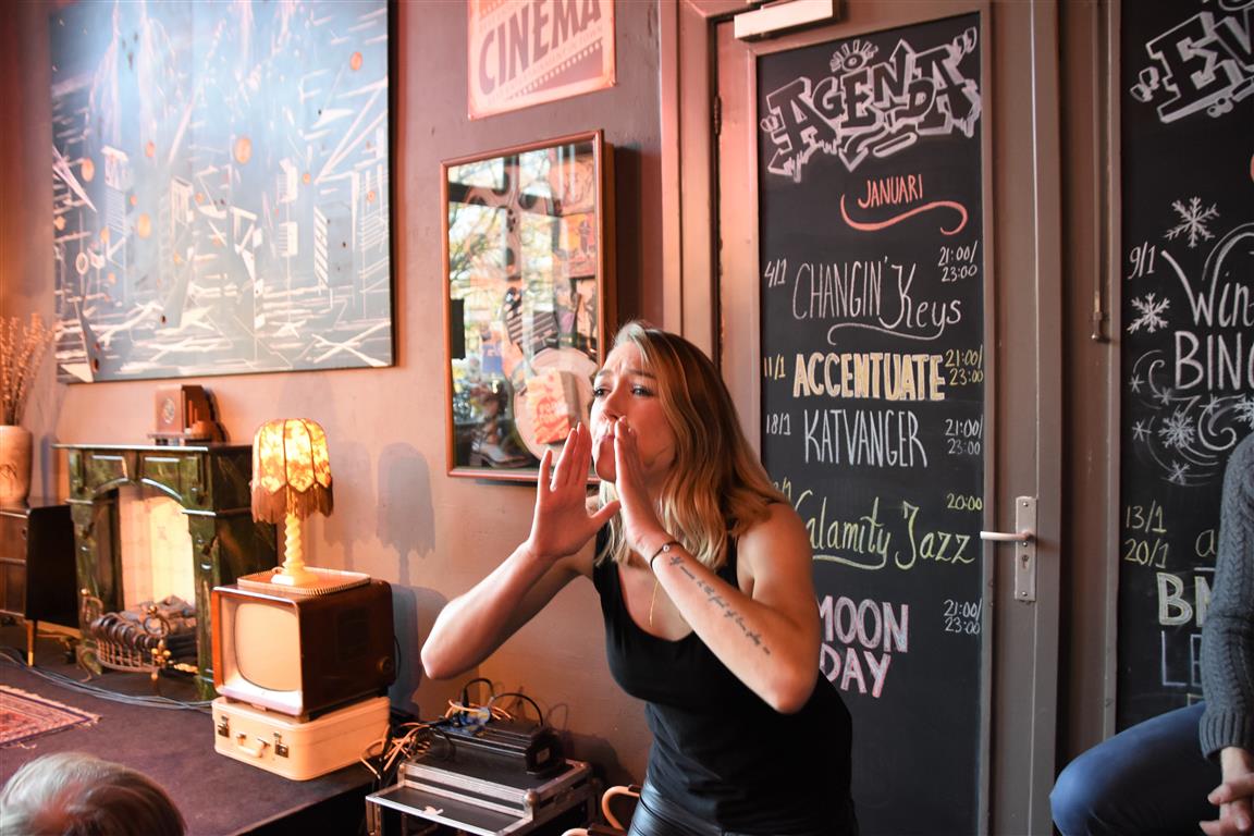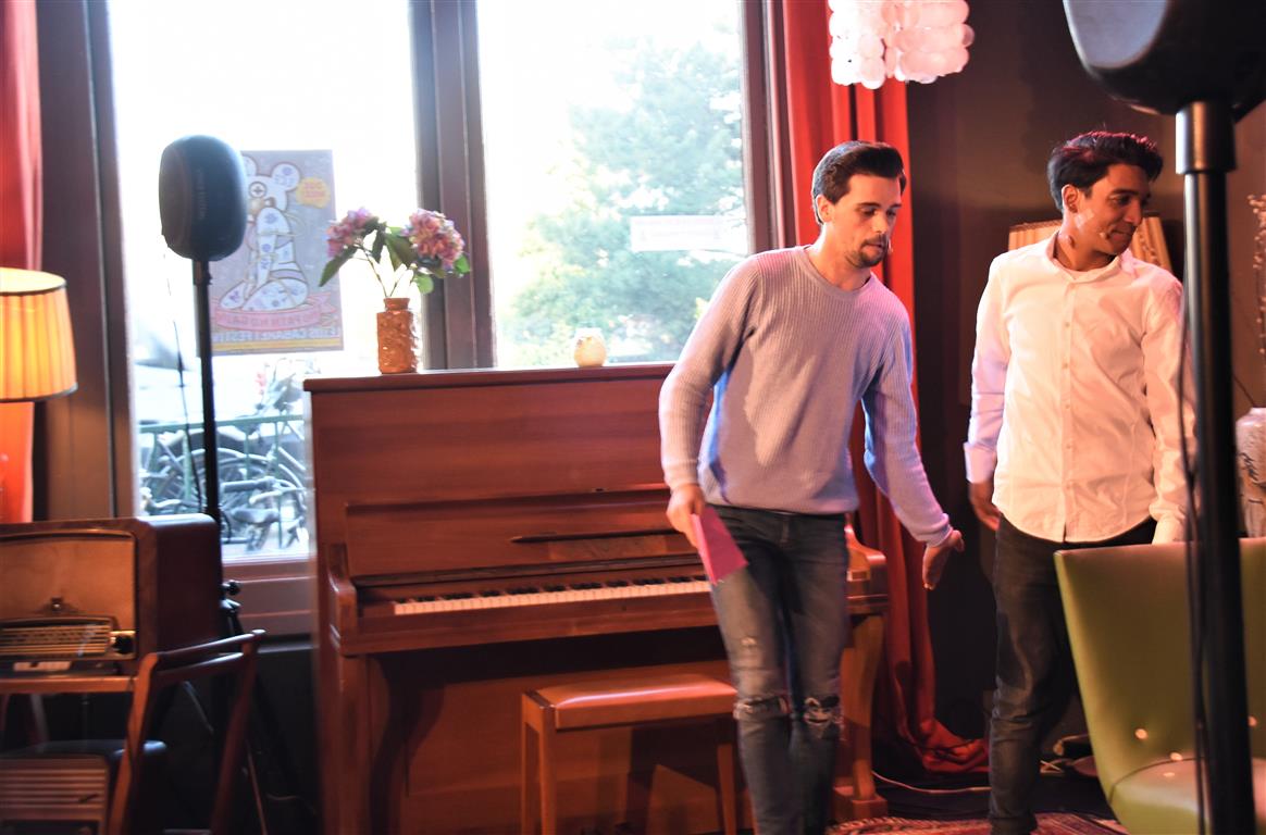 Dergelijke inkijkjes in andere levens, kreeg het publiek nog twee keer. Allereerst een lekker onverbloemde twintig minuten schets van een meisjes-vrouwenleven door Mariska van Houts. Ze past in een traditie, een beginnende, van vrouwen die nadrukkelijk (eindelijk) het perspectief en de beleving van de ene helft van de wereldbevolking overbrengen. Daarin past dat je, angstig geworden door “een écht enge film. Niet zo’n zaag-de-arm eraf”, over de trap en gang rent naar het wc en “dan je tieten moet vasthouden”. Om even aan de mannen in het publiek plastisch voor te doen dat dat anders pijn kan doen, ’s nachts, zonder ondersteunend materiaal. Of de wereld van een meisje dat ontwikkeling doormaakt naar ‘vrouw’, inclusief alle lichamelijke verschijnselen. “ego-vernietigend”, schetst Van Houts, met orthopedische elastiekjes, pukkels, pijnlijke borsten-groei “moest ik met m’n moeder mee om ‘een leuk topje’ te kopen. Waarom denk je dat meisjes op die leeftijd ruime vesten aan hebben??”. En haar ergernis over “het fotoverraad” op social media, waar alles mooi, stevig en pijnloos lijkt. Méér hiervan; vast goed voor ons allen om elkaar beter te snappen.