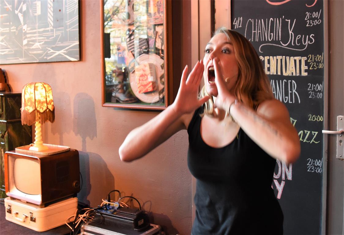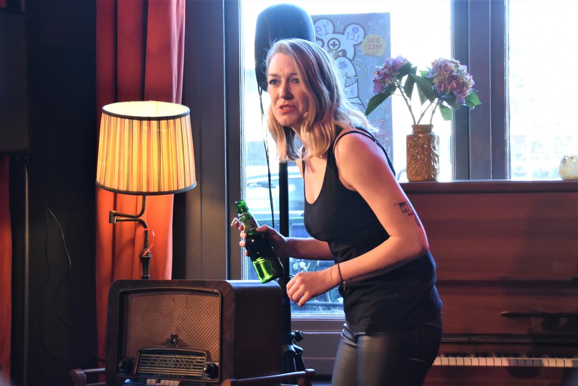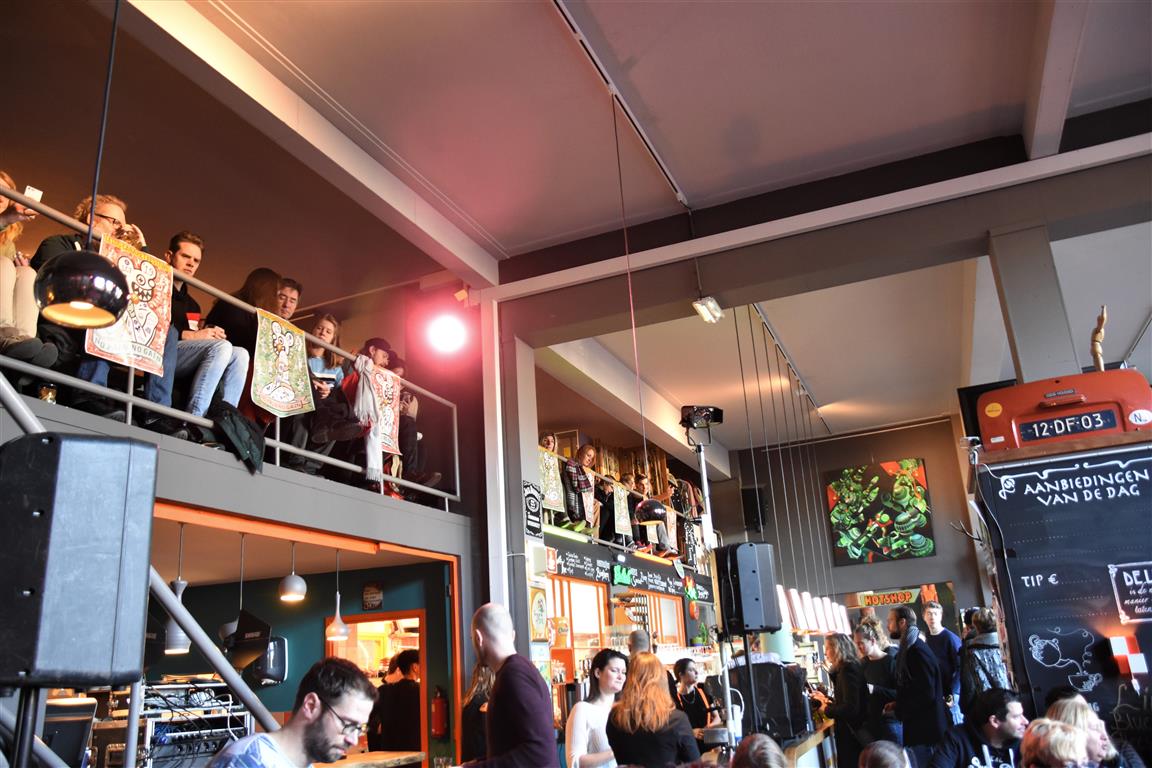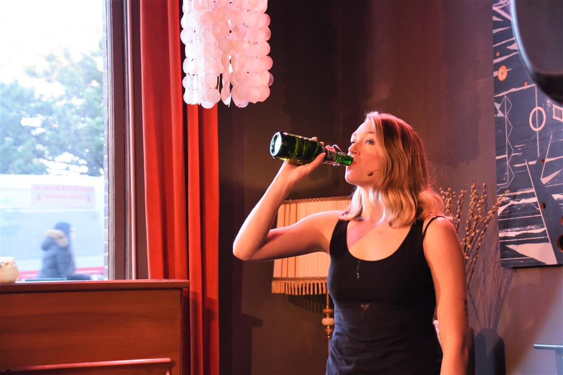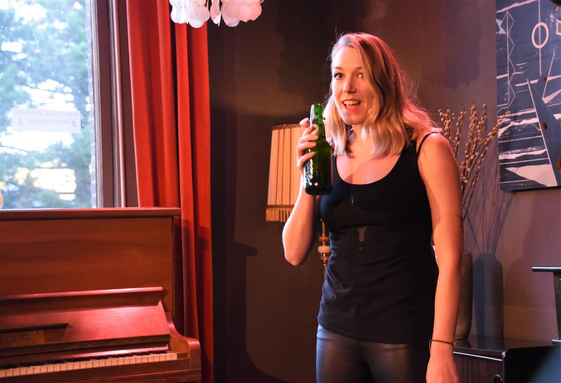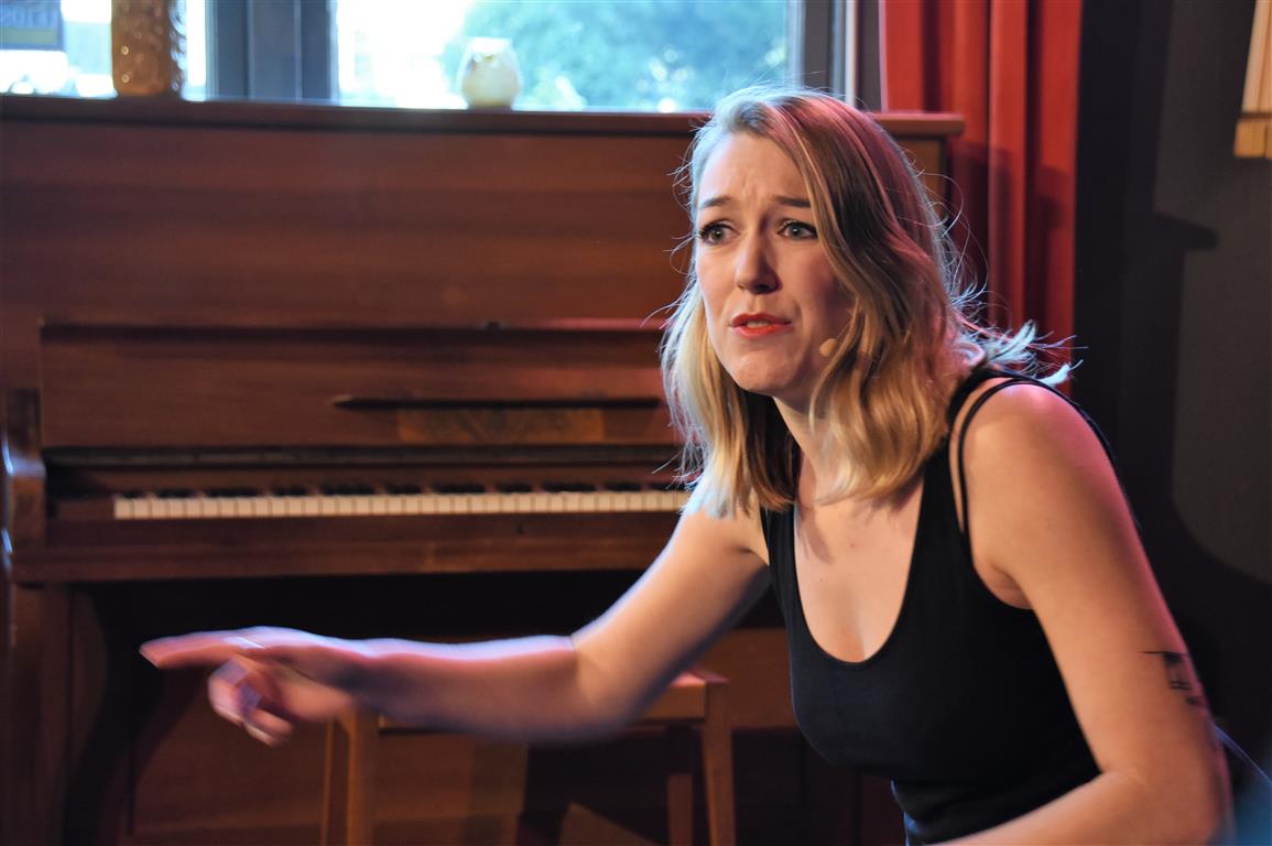 Dergelijke inkijkjes in andere levens, kreeg het publiek nog twee keer. Allereerst een lekker onverbloemde twintig minuten schets van een meisjes-vrouwenleven door Mariska van Houts. Ze past in een traditie, een beginnende, van vrouwen die nadrukkelijk (eindelijk) het perspectief en de beleving van de ene helft van de wereldbevolking overbrengen. Daarin past dat je, angstig geworden door “een écht enge film. Niet zo’n zaag-de-arm eraf”, over de trap en gang rent naar het wc en “dan je tieten moet vasthouden”. Om even aan de mannen in het publiek plastisch voor te doen dat dat anders pijn kan doen, ’s nachts, zonder ondersteunend materiaal. Of de wereld van een meisje dat ontwikkeling doormaakt naar ‘vrouw’, inclusief alle lichamelijke verschijnselen. “ego-vernietigend”, schetst Van Houts, met orthopedische elastiekjes, pukkels, pijnlijke borsten-groei “moest ik met m’n moeder mee om ‘een leuk topje’ te kopen. Waarom denk je dat meisjes op die leeftijd ruime vesten aan hebben??”. En haar ergernis over “het fotoverraad” op social media, waar alles mooi, stevig en pijnloos lijkt. Méér hiervan; vast goed voor ons allen om elkaar beter te snappen.