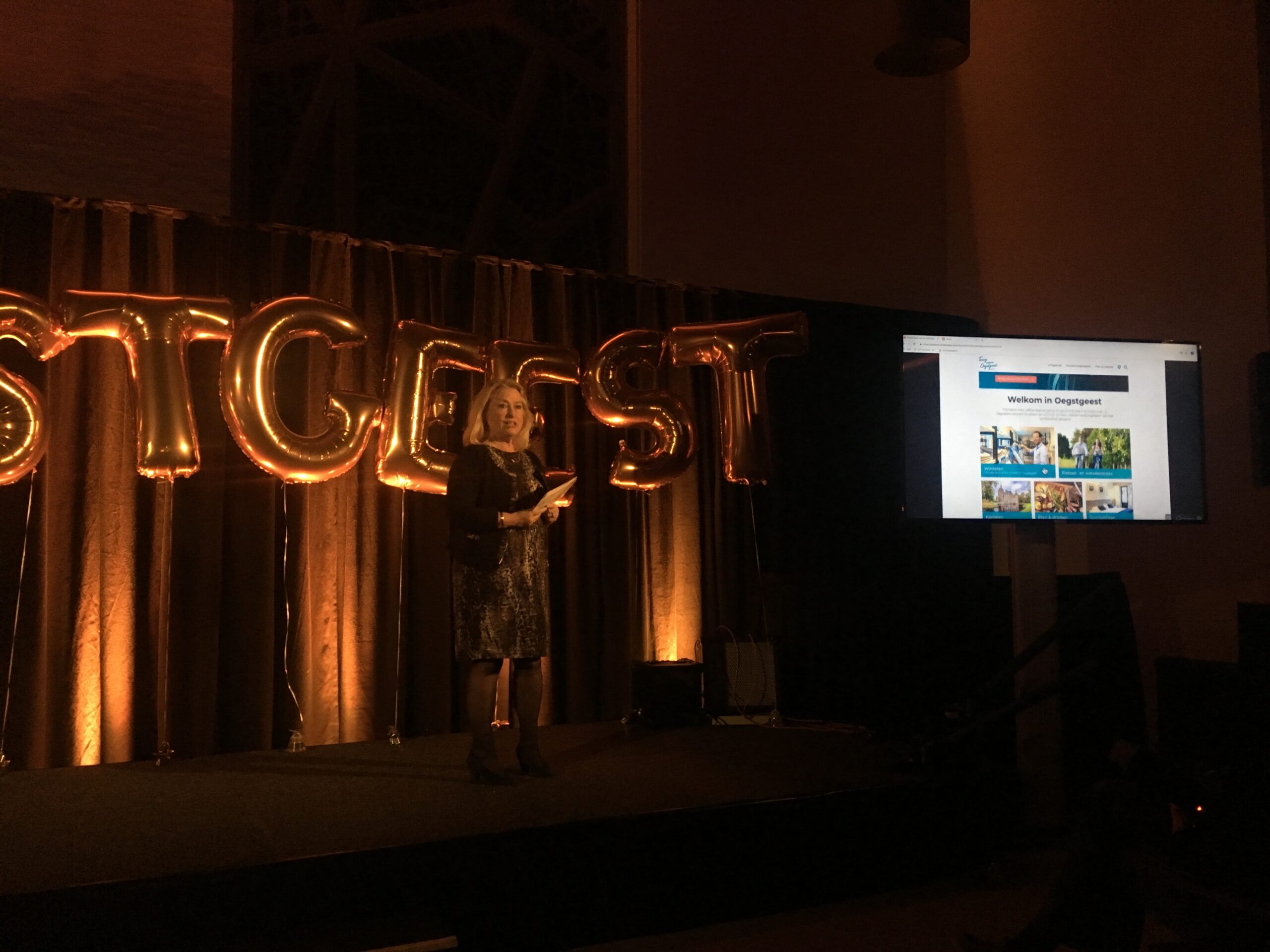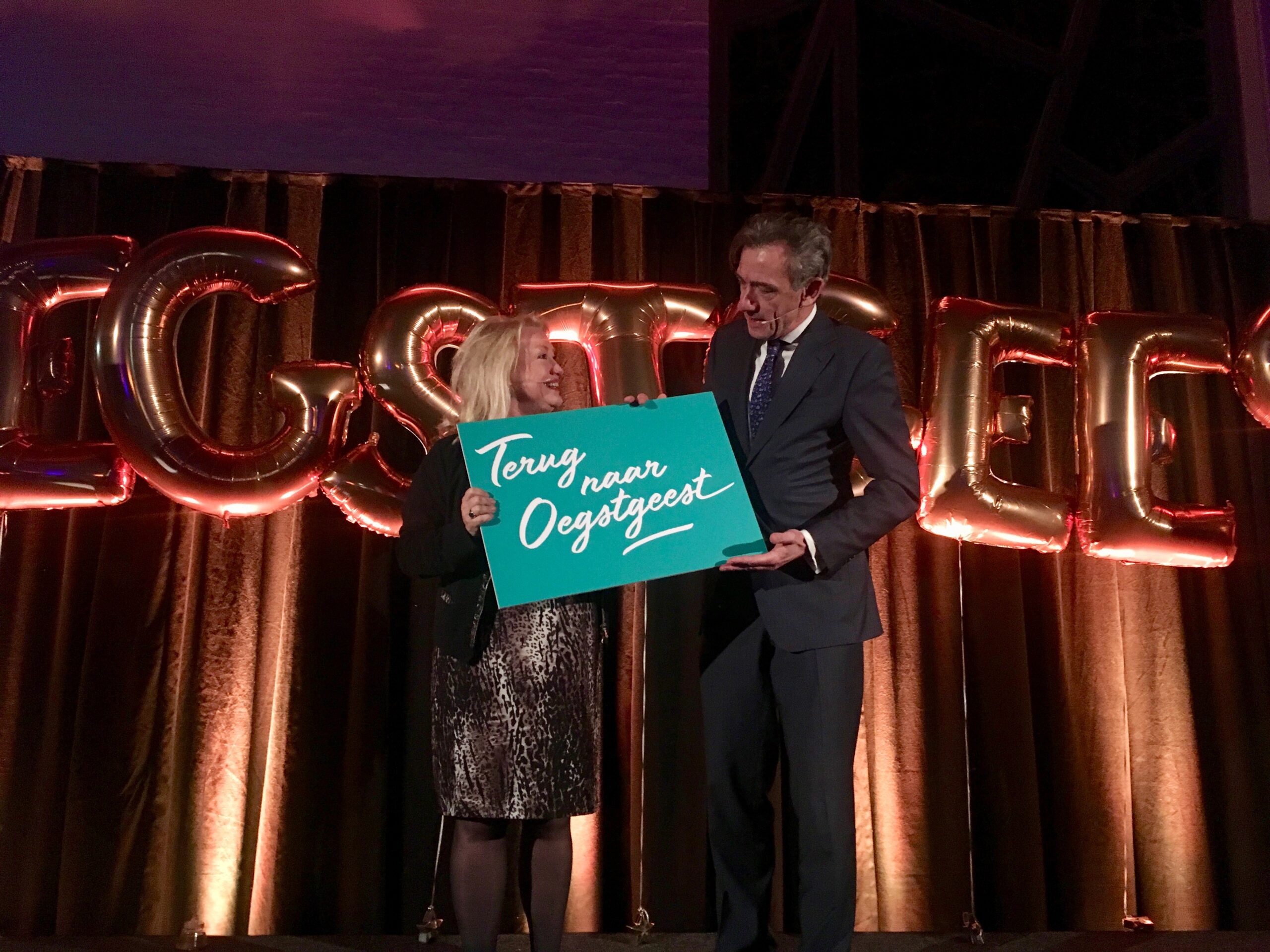 Dorpsmarketeer Marjolijn van der Jagt trapte de avond af met de presentatie van de (nieuwe) slogan van het dorp: Terug naar Oegstgeest. De zin werd in de volksmond al langer gebruikt om het dorp te promoten, maar sinds gisteravond heeft de uitroep ook een officiële status. “De slogan heeft al meer dan 90% naamsbekendheid, die moeten we nu gaan vullen met mooie evenementen”, zegt Van der Jagt. Op het podium zegde wethouder Matthijs Huizing toe dat de slogan ook door de gemeente gebruikt gaat worden. “Mijn enorme complimenten voor wat jullie gedaan hebben, natuurlijk gaan wij meedoen.”