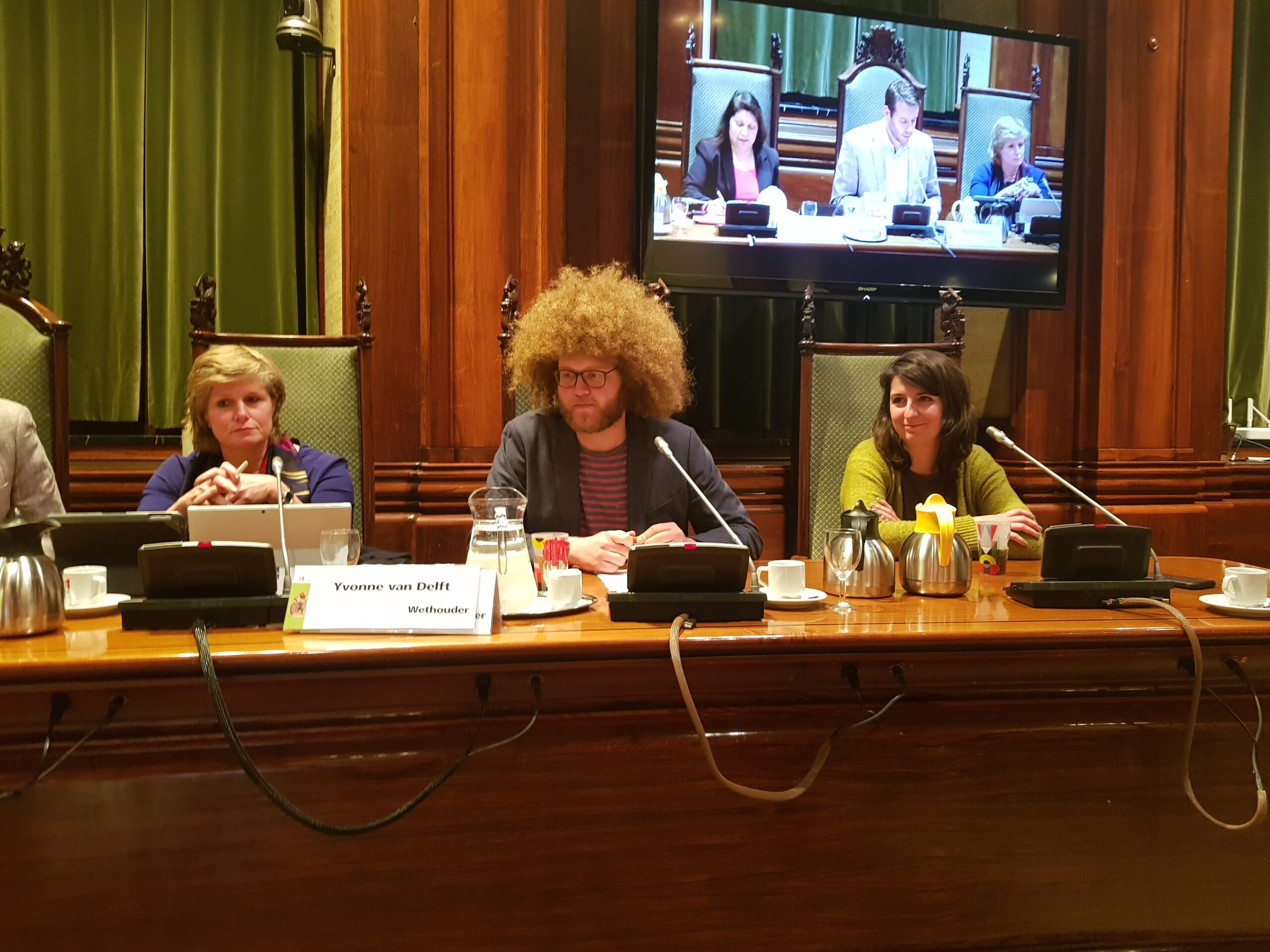 Chris de Waard sprak na afloop van de commissievergadering met Auke Florian Hiemstra van Canalcups Leiden, wethouder Yvonne van Delft, bestuurslid Bettina van Klaveren van de 3 October Vereeniging, Ruud Witteman van Koninklijke Horeca Nederland, afdeling Leiden en met Jeroen van der Lippe van Werfpop.