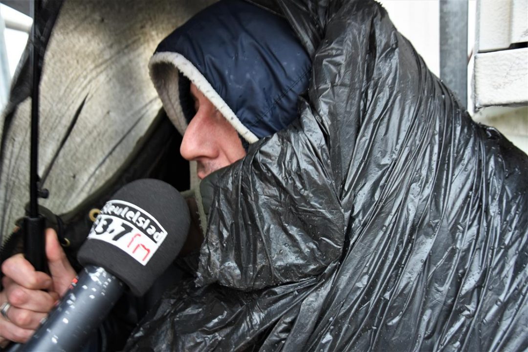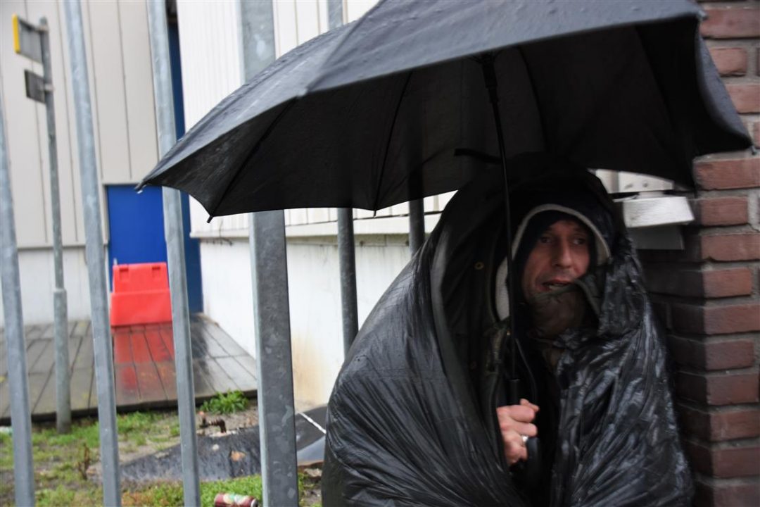 Sinds gisteravond 19.00 uur zit Simon uit Voorschoten in een inmiddels doorweekte slaapzak op een muurtje voor het Papegaaisbolwerk waar Stichting De Binnenvest de daklozenopvang heeft. Hij is vastgelopen in het systeem zegt hij zelf over de reden waarom hij de stromende regen verkiest boven een warme plek in de opvang.