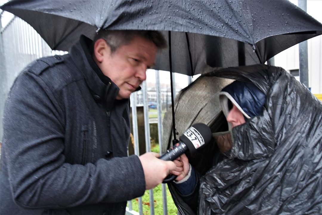 Chris de Waard sprak vanmiddag met de dakloze Simon uit Voorschoten die al sinds gisteravond 19.00 uur tegenover het politiebureau op een muurtje zit om aandacht te vragen voor zijn situatie.