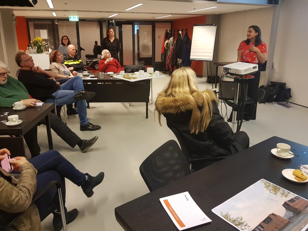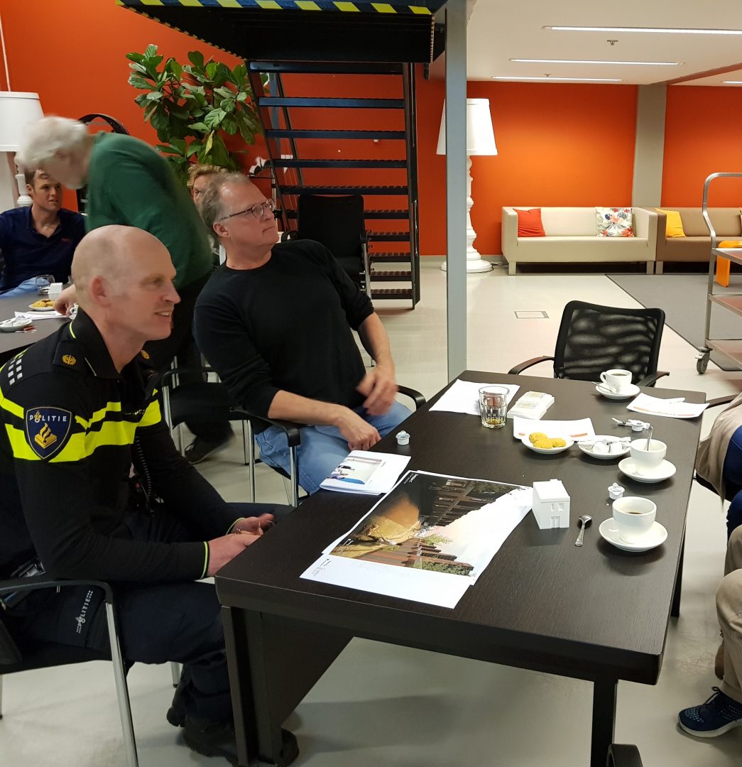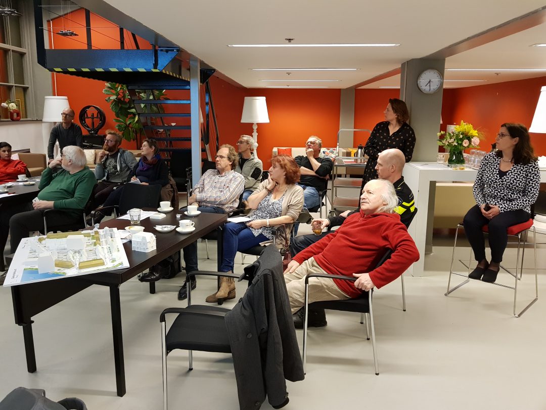Chris de Waard in gesprek met voorzitter Pieter Dool van de bewonerscommissie, dat zijn de huurders van Portaal, over de nieuwbouw in de wijk.