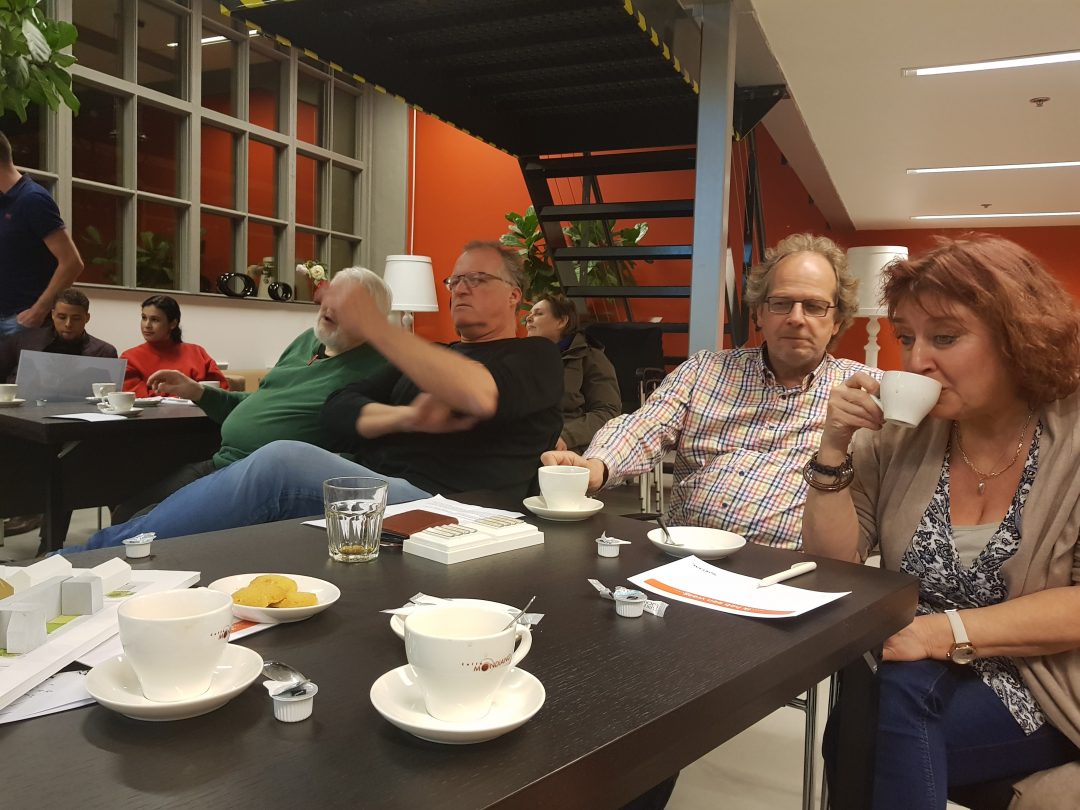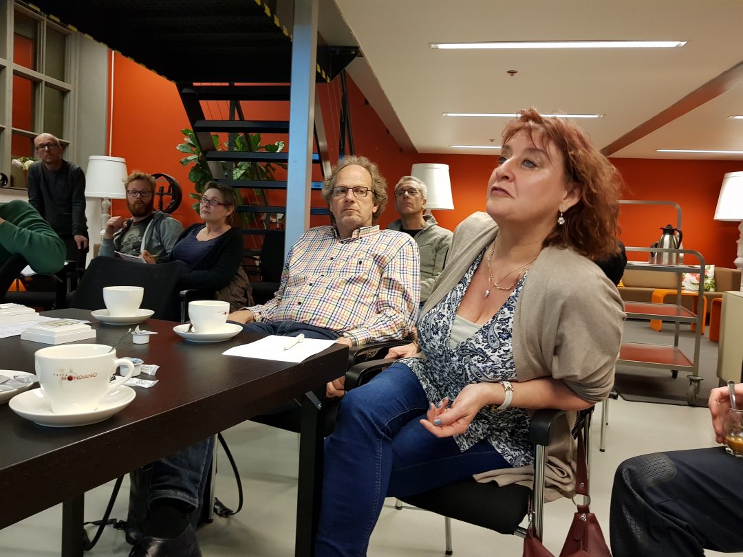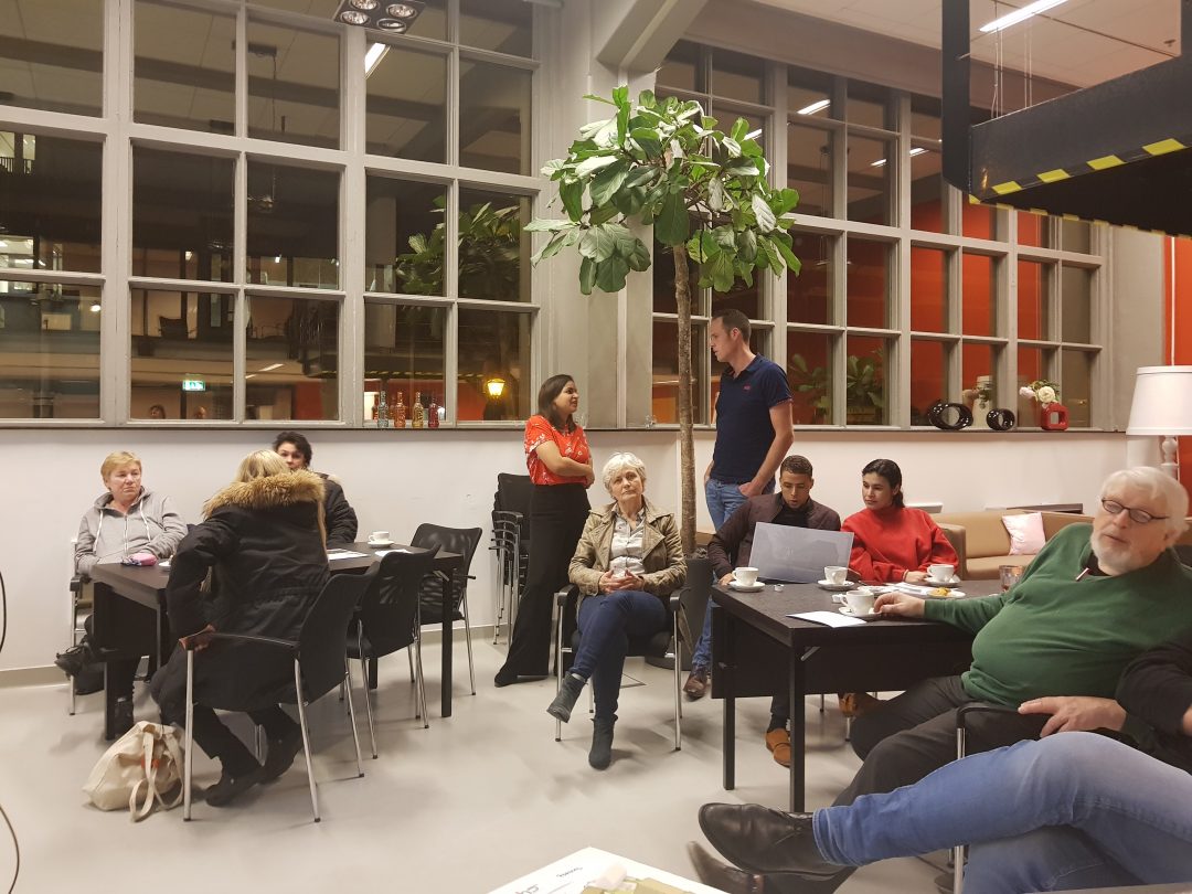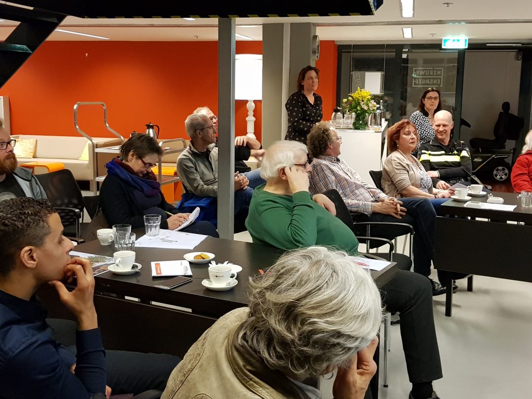 Chris de Waard in gesprek met voorzitter Pieter Dool van de bewonerscommissie, dat zijn de huurders van Portaal, over de nieuwbouw in de wijk.