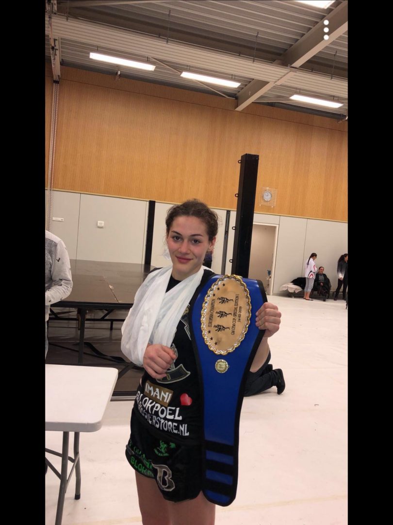 Imani Blokpoel is vorige week in Den Bosch Europees kampioen kickboksen geworden in de categorie tot 59 kilo. De 17-jarige leerlinge van het Leonardo College in Leiden deed dat door met een gebroken hand de 33-jarige Helene Thillion uit België te verslaan.