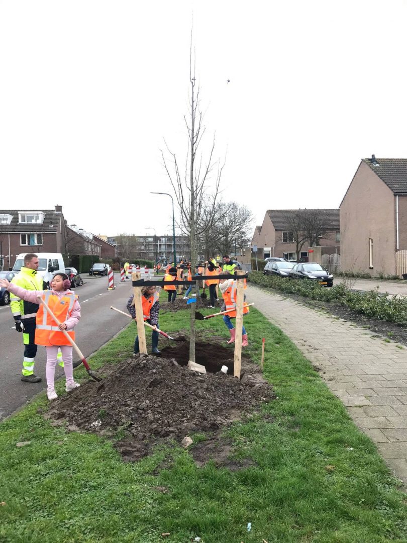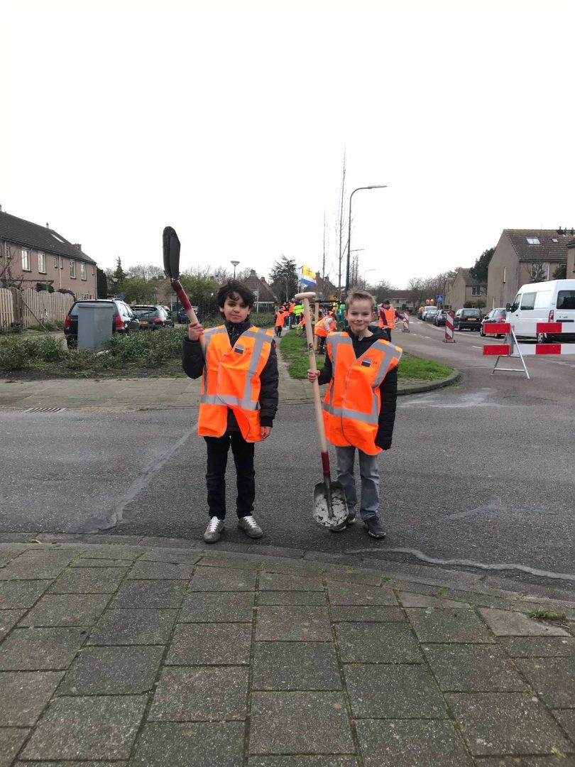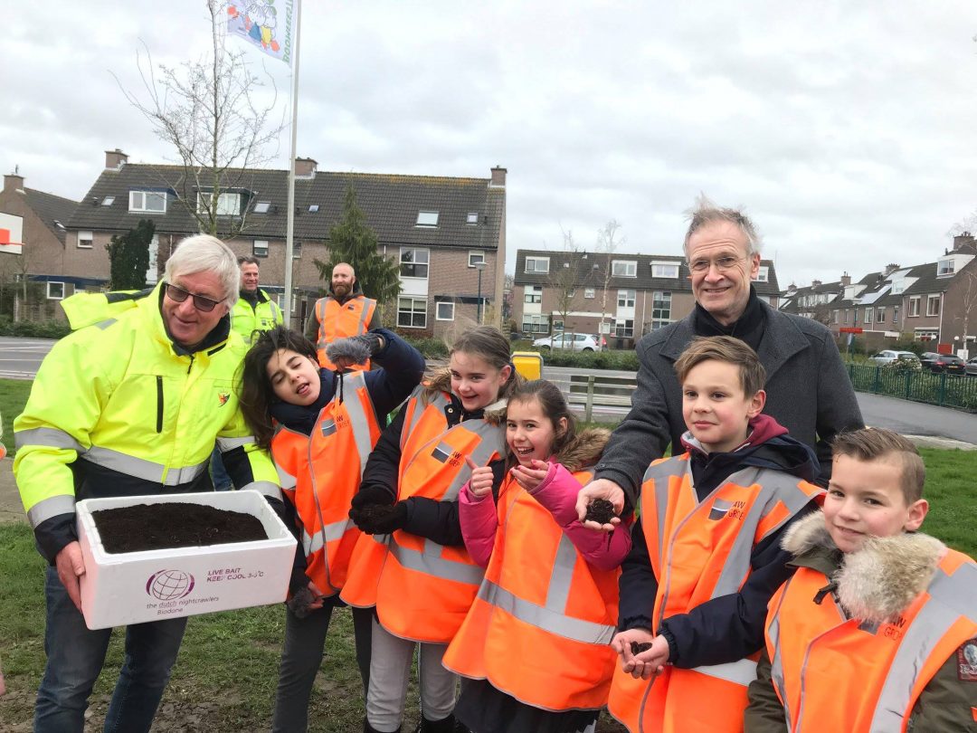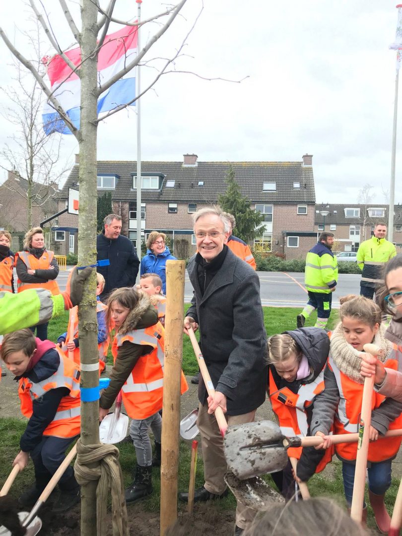 Ook in Oegstgeest trotseerden de kinderen het gure weer. Leerlingen van groep 6 van de Daltonschool gingen samen met wethouder Jan Nieuwenhuis aan de slag om dertien lindes te planten langs de Kerckwervelaan. De bloesem van deze bomen is voor bijen en hommels een belangrijke voedsel bron. Na het planten werden er regenwormen toegevoegd. Wormen hebben een belangrijke functie in de grond. Ze eten plantaardig materiaal en zetten dat om in voor planten op te nemen voedingstoffen. Als dank voor hun inzet kregen de leerlingen een vlinderstruikje en bloemenchocolade mee, waarna ze weer richting hun warme klas gingen.