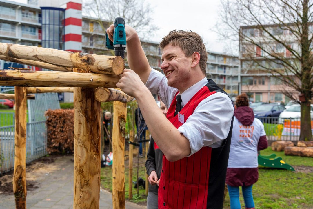 Afgelopen zaterdag gingen in heel Nederland vrijwilligers aan de slag om Nederland een stukje mooier te maken. Ook in Leiden waren veel vrijwilligers actief. Onder andere bij de peuterspeelzalen ’t Kwetternest en Gouden Poort waar de bestaande speelpleinen werden omgetoverd tot een natuurlijke ontdekspeeltuin. Er werden bomen geplant en borders aangelegd. Een moestuinbak voor peuters gemaakt en van natuurlijke materialen werden spelaanleidingen en een zonnehemel voor de zandbak in de tuin aangebracht.