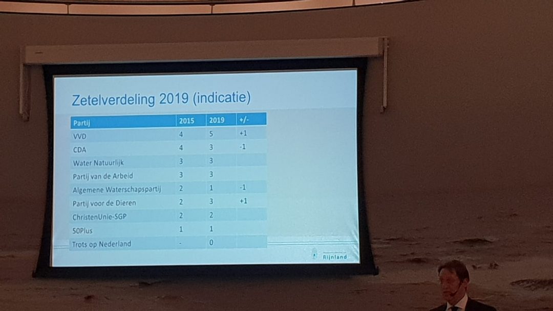 Met een opkomst van 54,2% hebben inwoners van Rijnland zich uitgesproken tijdens de waterschapsverkiezingen. De voorlopige uitslag (94% van de stemmen zijn geteld) van het hoogheemraadschap van Rijnland laat een stijging zien in het aantal stemmen. Maandag 25 maart wordt de definitieve uitslag bekend gemaakt.