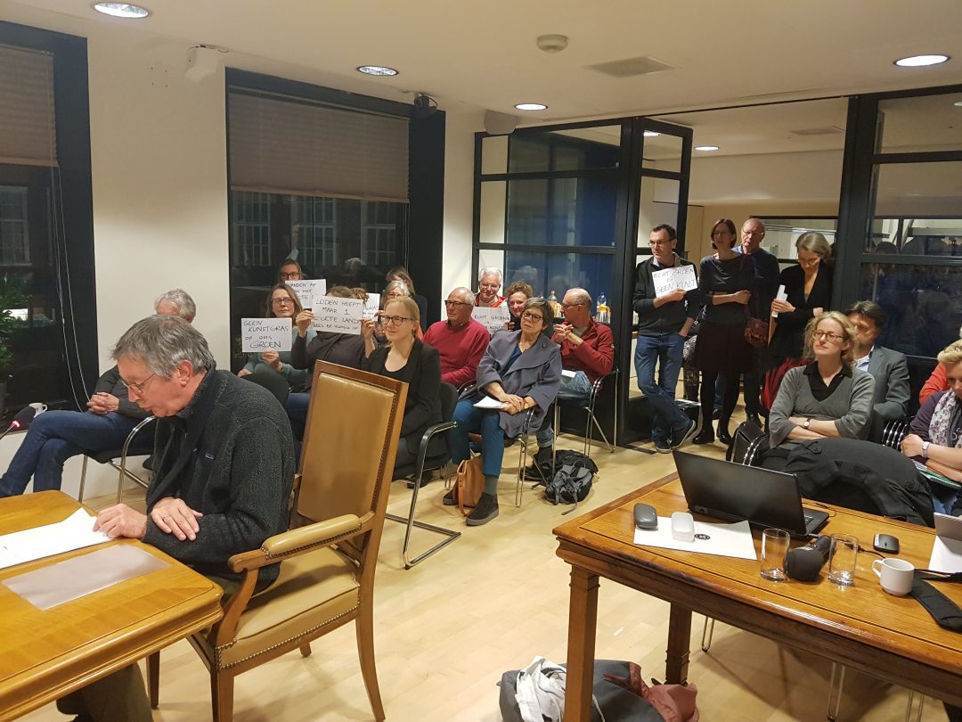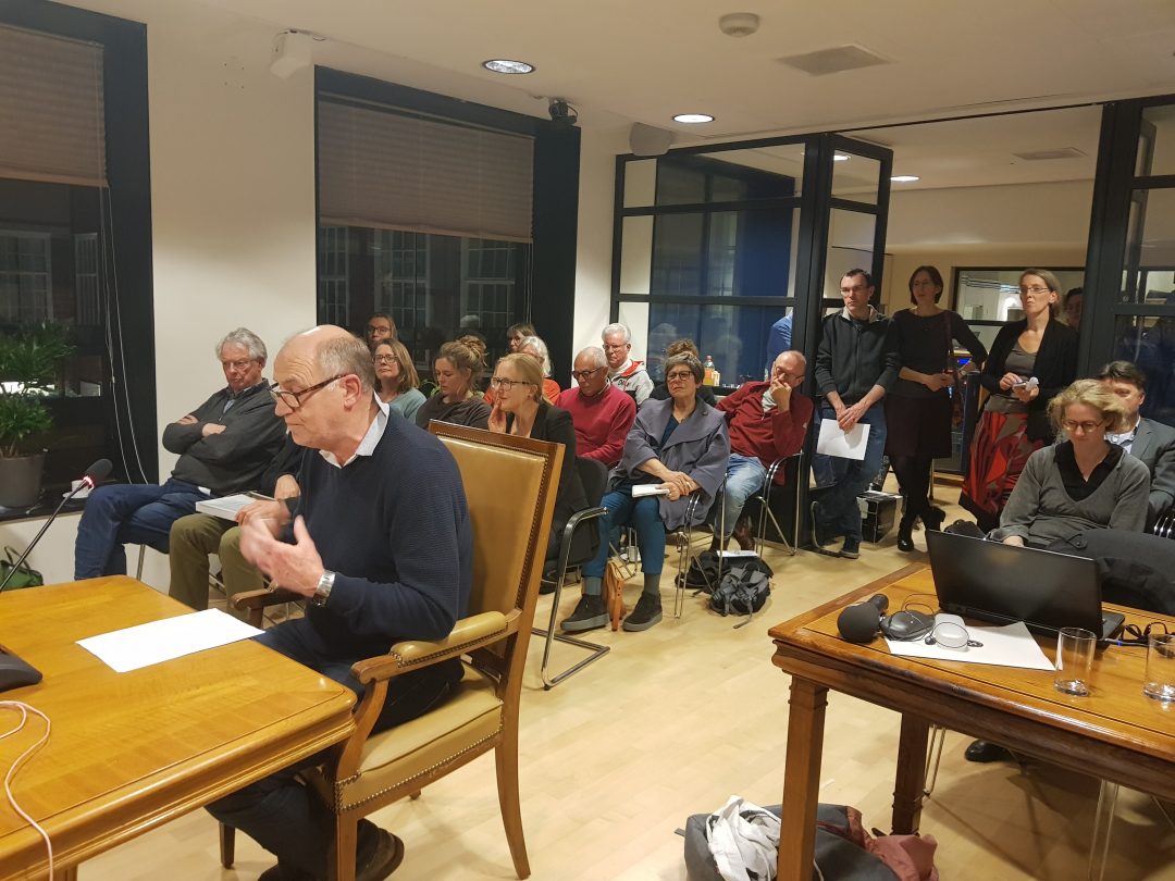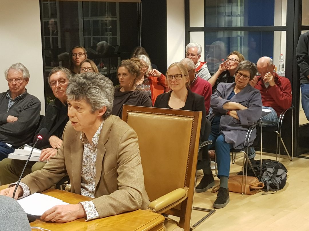 Chris de Waard in gesprek met Bert Stemerdink van de Vrienden van het Roomburgpark over de gemeentelijke herinrichtingsplannen voor het wijkpark.